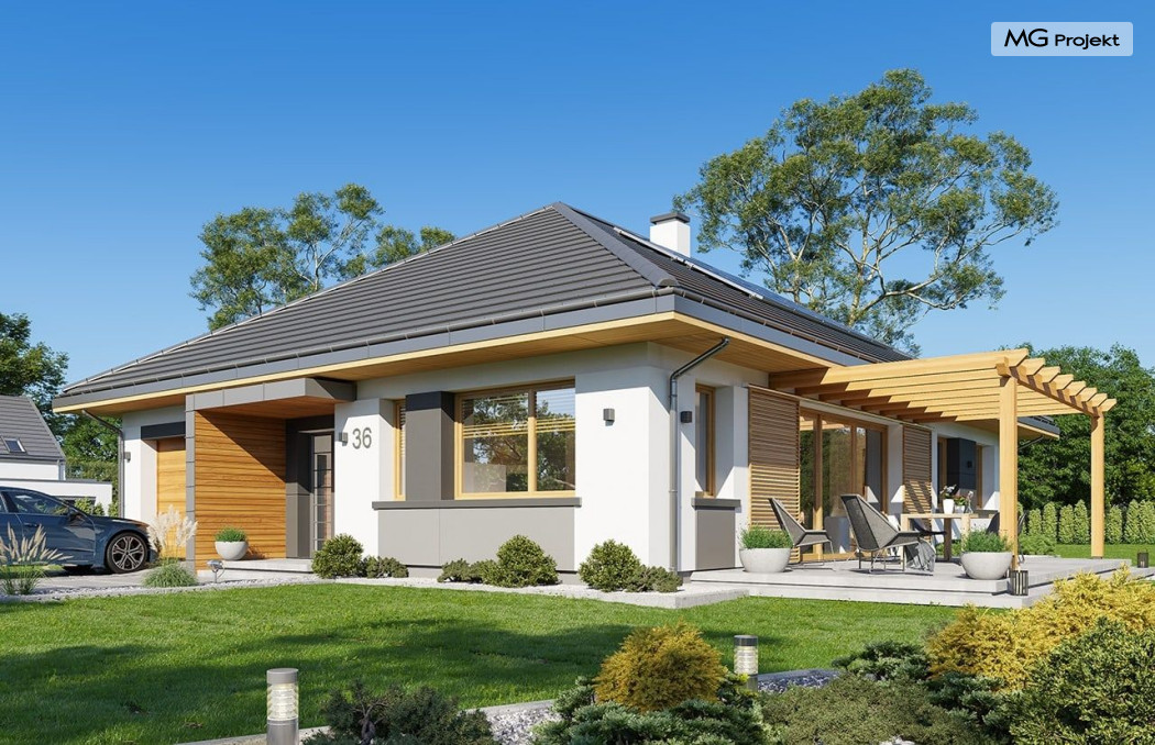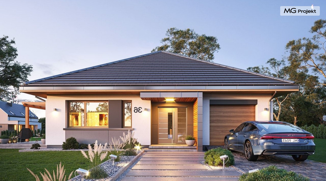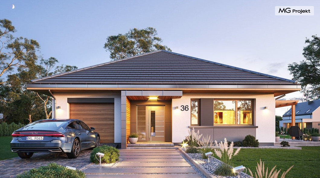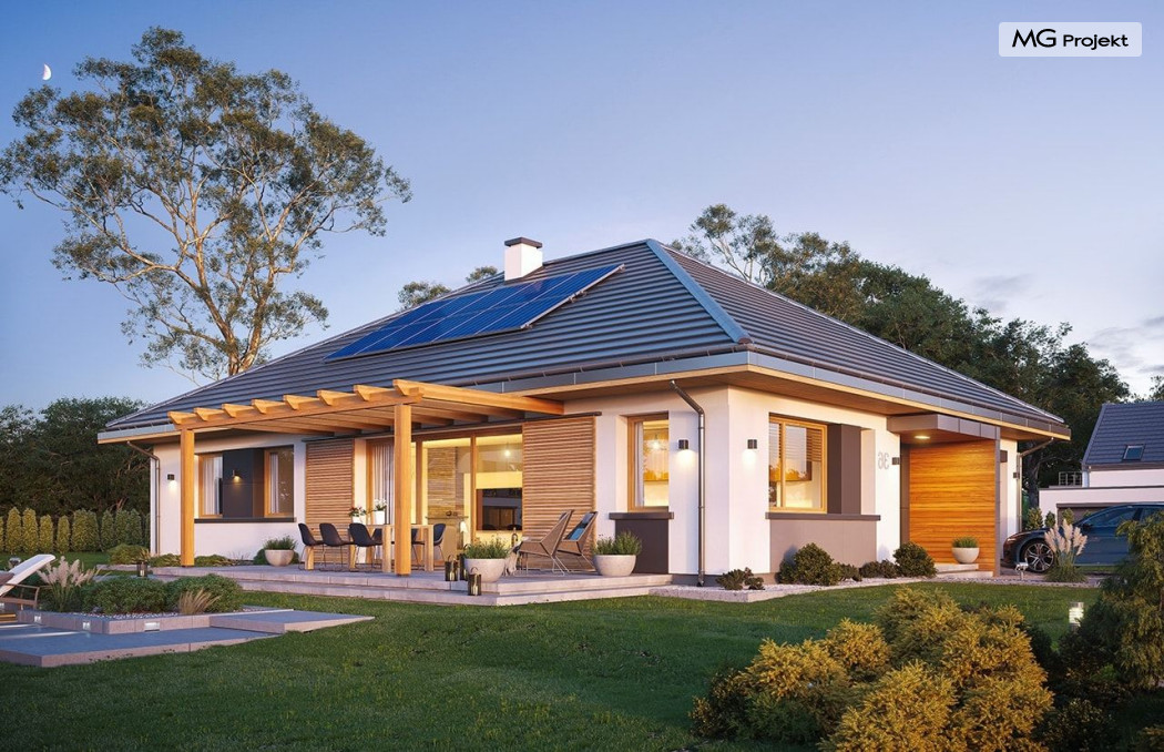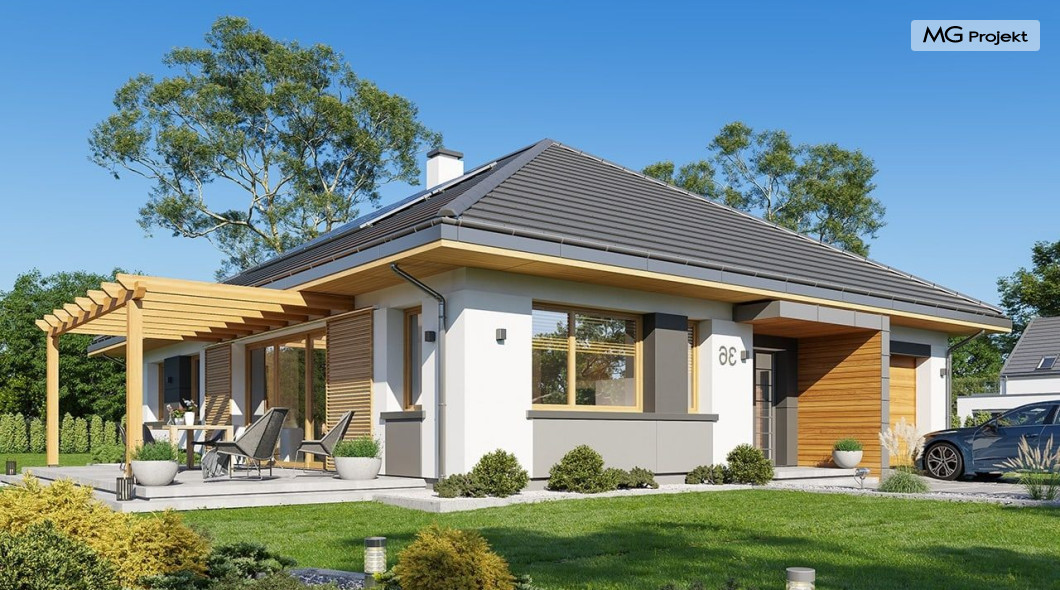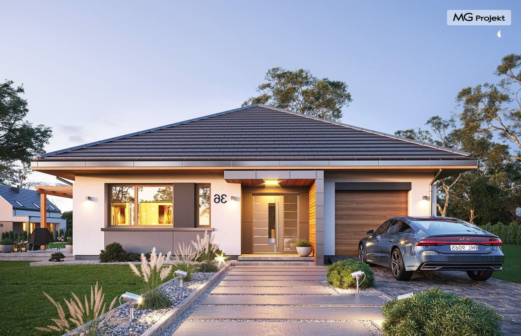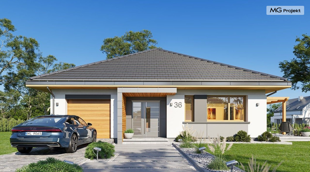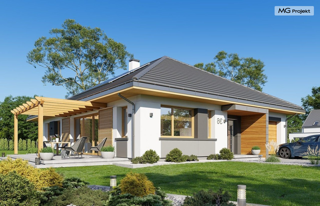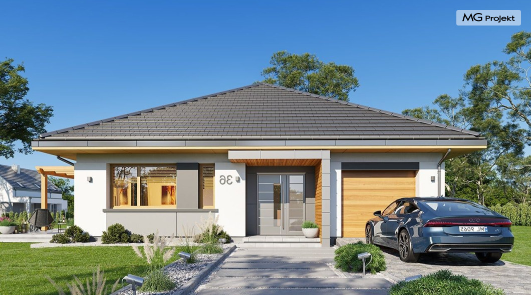 Projekt domu Dom na Wygodnej to projekt idealnej „parterówki” dla 4-5 osobowej rodziny. Dom rzeczywiście jest zaprojektowany jako bardzo wygodna komfortowa mini-willa dla Inwestorów marzących o luksusach życia na jednym poziomie - bez biegania po schodach. To propozycja dla Klientów dysponujących parcelą z ogrodem wychodzącym na stronę boczną ( na przykład w przypadku działek z niekorzystnym usytuowaniem względem stron świata i słońca ). Budynek został zaprojektowany na planie prostokąta i jest przykryty czterospadowym symetrycznym dachem krytym dachówką.Architektura domu jest spokojna i stonowana, choć dzięki właściwym proporcjom i ciekawym detalom dom ma w sobie coś co przyciąga wzrok i interesuje. Elewację frontową budynku ozdabia reprezentacyjne wejście, zaakcentowane nowoczesnym daszkiem i pięknymi szerokimi drzwiami z naświetlem, osadzonymi w kontrastującej ścianie podcienia. Elewację wychodzącą na ogród ozdabiają szerokie piękne przeszklenia salonu z przesuwnymi okiennicami-żaluzjami, oraz zadaszenie pergoli. Całość budynku wieńczy proporcjonalny dach kryjący w sobie dodatkową przestrzeń strychową do wykorzystania dla domowników. Wnętrze domu podzielone zostało tradycyjnie na część dzienną, do której dostajemy się wprost z wygodnego przedsionka z szatnią, następnie część nocną z czterema pokojami sypialnymi, oraz część gospodarczą z garażem i kotłownią. Część dzienna to salon, z wygodną kuchnią i holem, otwarty szeroko na taras i ogród, z wydzielonym narożnikiem wypoczynkowym, ze ścianą kominkowo – telewizyjną. W części nocnej w bazowej wersji projektu przewidziano cztery pokoje, ale można tą część urządzić w dowolny sposób - na przykład zmniejszając ilość sypialni do trzech i dodając dodatkową garderobę i extra łazienkę. Wnętrze domu stosownie do skali i powierzchni budynku jest bardzo funkcjonalne i komfortowe - jak na Dom na Wygodnej przystało. Budynek ma prostą bryłę i konstrukcję – będzie łatwy i szybki w budowie. Zastosowane bardzo dobre izolacje i nowoczesne instalacje dają w efekcie budynek energooszczędny - tani w późniejszej eksploatacji. Dom na Wygodnej to doskonała propozycja dla Inwestorów planujących budowę wygodnego parterowego domu o stonowanej nowoczesnej architekturze.