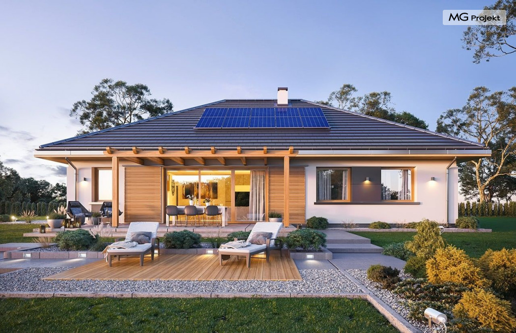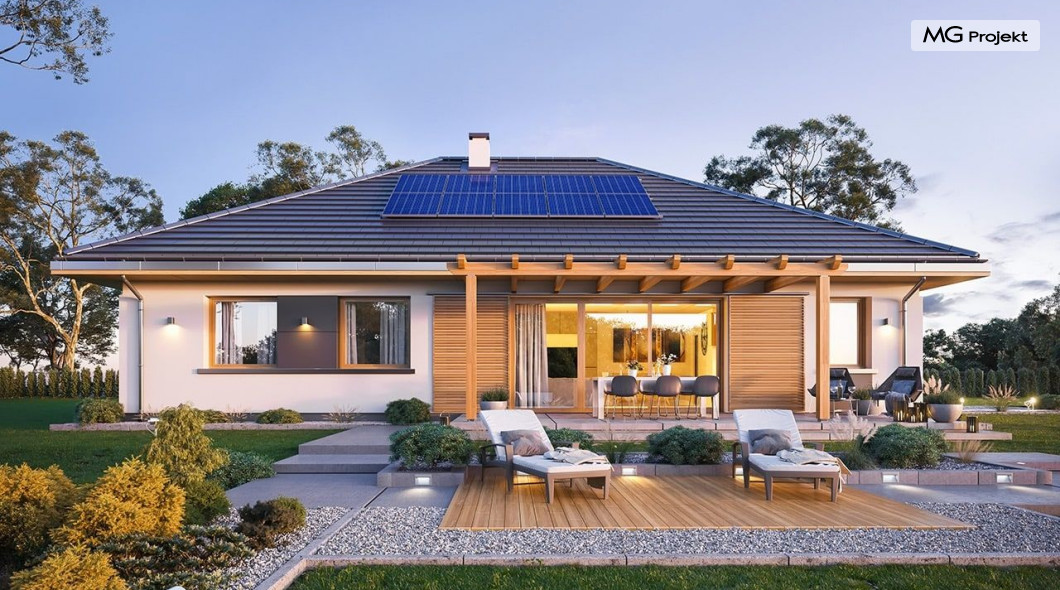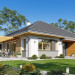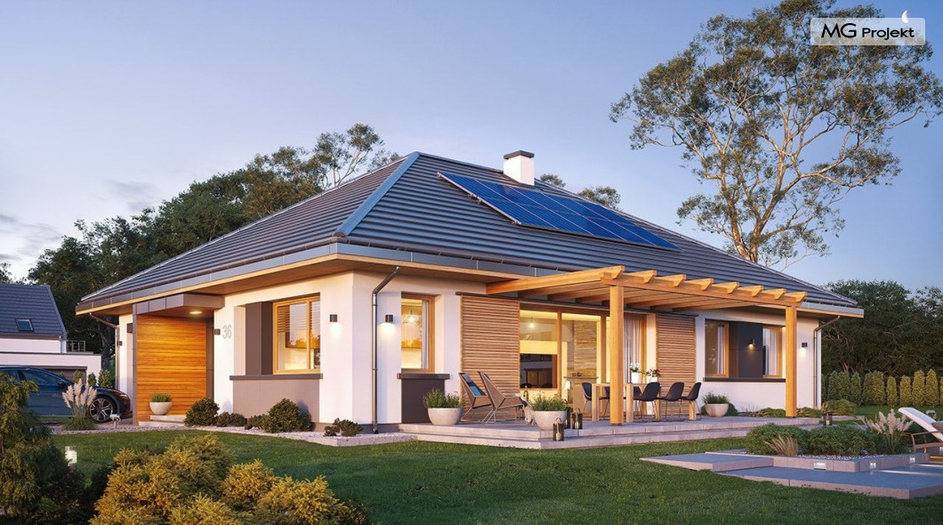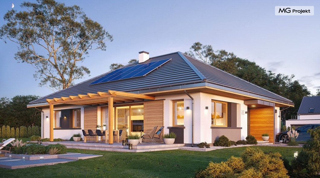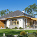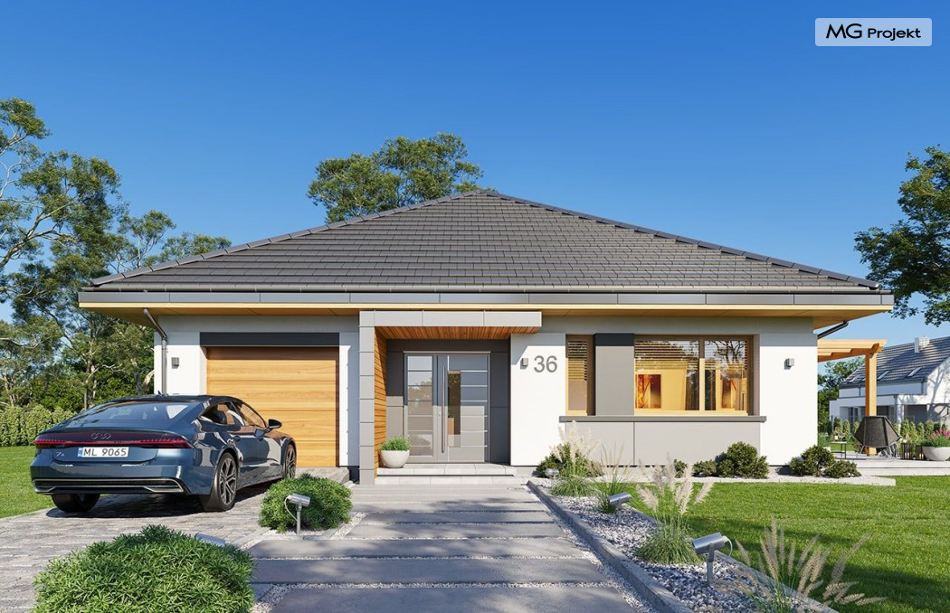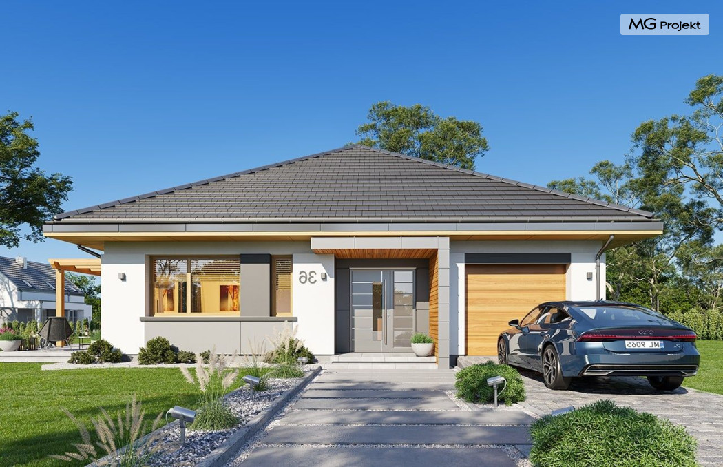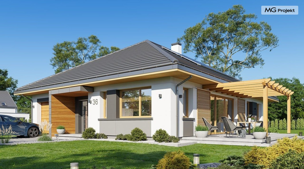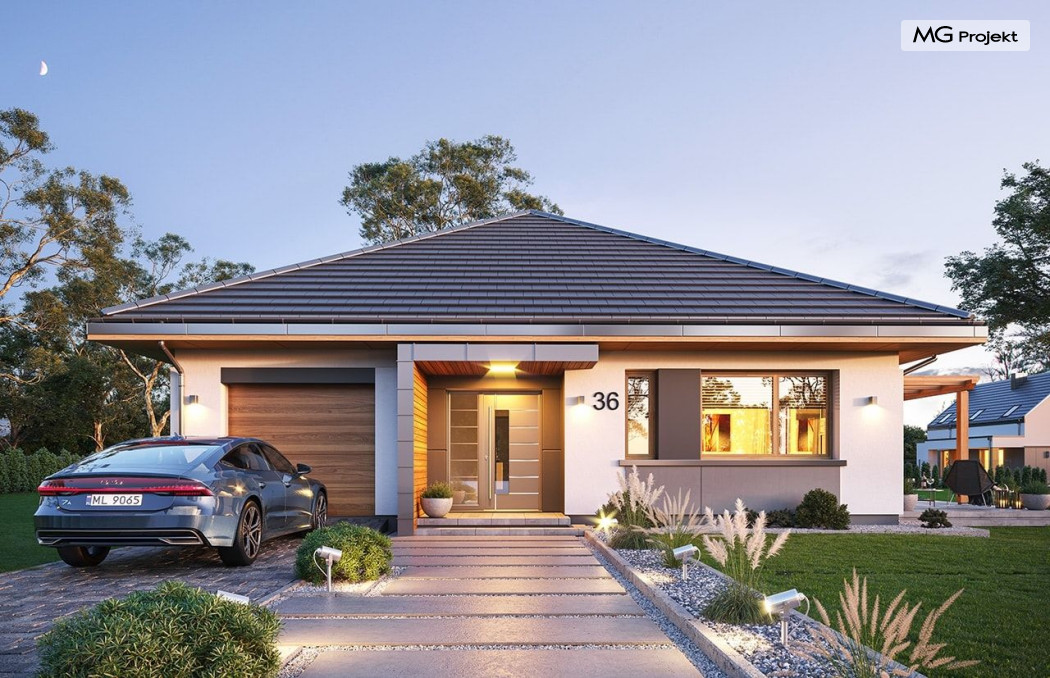Projekt domu Dom na Wygodnej to projekt idealnej „parterówki” dla 4-5 osobowej rodziny. Dom rzeczywiście jest zaprojektowany jako bardzo wygodna komfortowa mini-willa dla Inwestorów marzących o luksusach życia na jednym poziomie - bez biegania po schodach. To propozycja dla Klientów dysponujących parcelą z ogrodem wychodzącym na stronę boczną ( na przykład w przypadku działek z niekorzystnym usytuowaniem względem stron świata i słońca ). Budynek został zaprojektowany na planie prostokąta i jest przykryty czterospadowym symetrycznym dachem krytym dachówką.Architektura domu jest spokojna i stonowana, choć dzięki właściwym proporcjom i ciekawym detalom dom ma w sobie coś co przyciąga wzrok i interesuje. Elewację frontową budynku ozdabia reprezentacyjne wejście, zaakcentowane nowoczesnym daszkiem i pięknymi szerokimi drzwiami z naświetlem, osadzonymi w kontrastującej ścianie podcienia. Elewację wychodzącą na ogród ozdabiają szerokie piękne przeszklenia salonu z przesuwnymi okiennicami-żaluzjami, oraz zadaszenie pergoli. Całość budynku wieńczy proporcjonalny dach kryjący w sobie dodatkową przestrzeń strychową do wykorzystania dla domowników. Wnętrze domu podzielone zostało tradycyjnie na część dzienną, do której dostajemy się wprost z wygodnego przedsionka z szatnią, następnie część nocną z czterema pokojami sypialnymi, oraz część gospodarczą z garażem i kotłownią. Część dzienna to salon, z wygodną kuchnią i holem, otwarty szeroko na taras i ogród, z wydzielonym narożnikiem wypoczynkowym, ze ścianą kominkowo – telewizyjną. W części nocnej w bazowej wersji projektu przewidziano cztery pokoje, ale można tą część urządzić w dowolny sposób - na przykład zmniejszając ilość sypialni do trzech i dodając dodatkową garderobę i extra łazienkę. Wnętrze domu stosownie do skali i powierzchni budynku jest bardzo funkcjonalne i komfortowe - jak na Dom na Wygodnej przystało. Budynek ma prostą bryłę i konstrukcję – będzie łatwy i szybki w budowie. Zastosowane bardzo dobre izolacje i nowoczesne instalacje dają w efekcie budynek energooszczędny - tani w późniejszej eksploatacji. Dom na Wygodnej to doskonała propozycja dla Inwestorów planujących budowę wygodnego parterowego domu o stonowanej nowoczesnej architekturze.