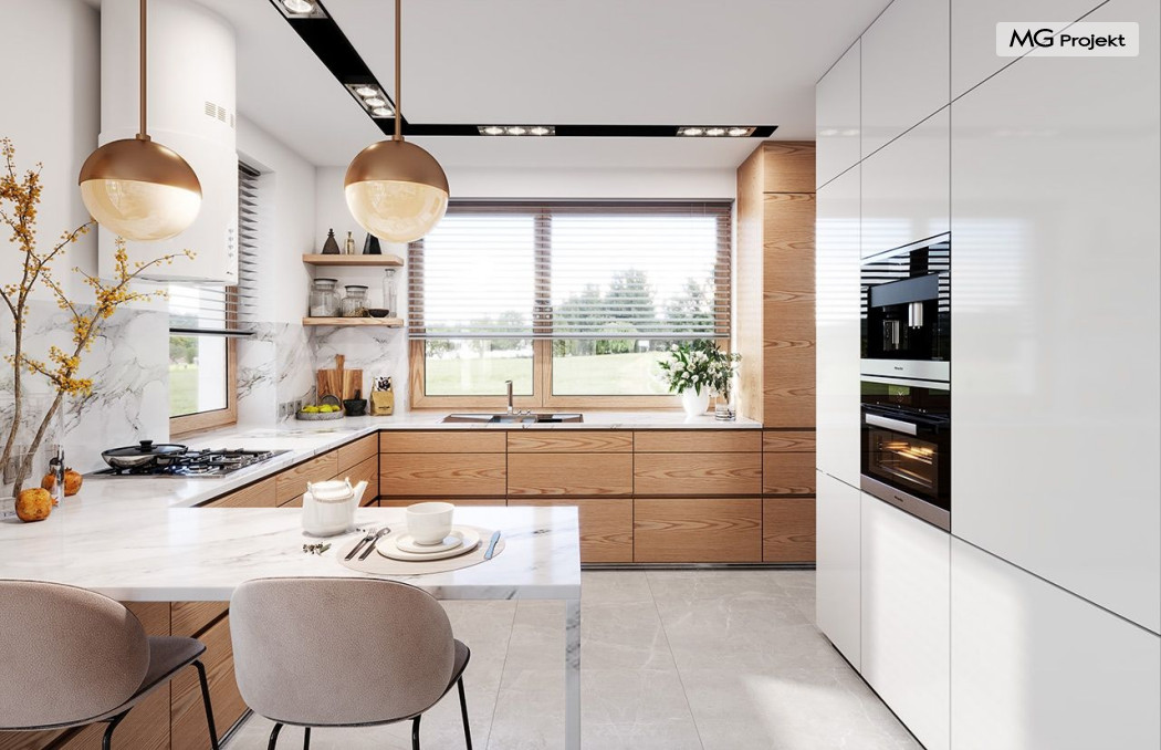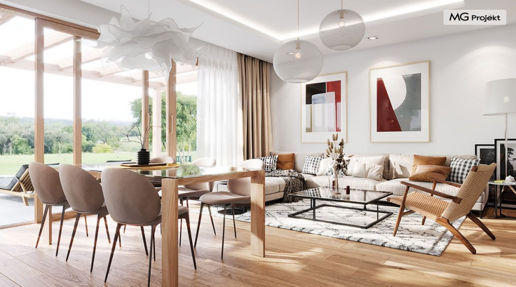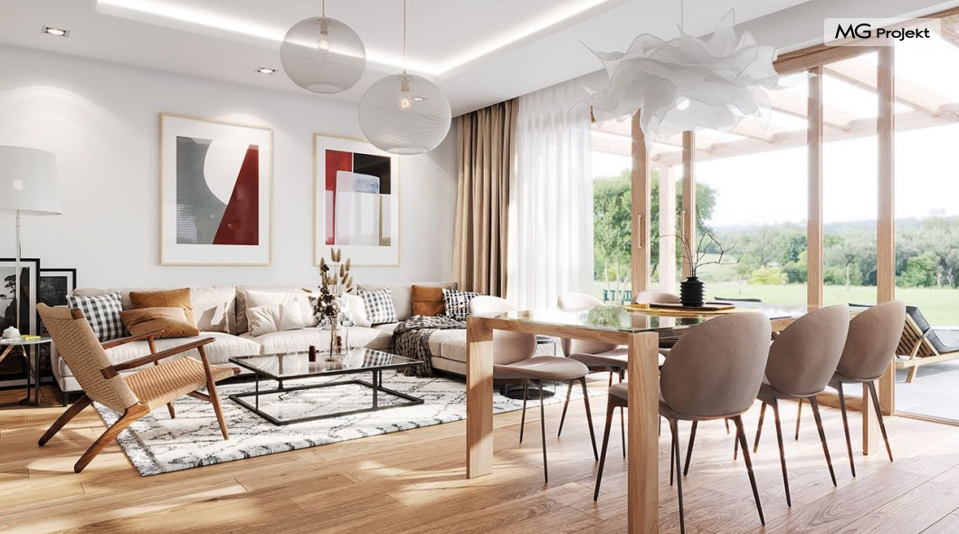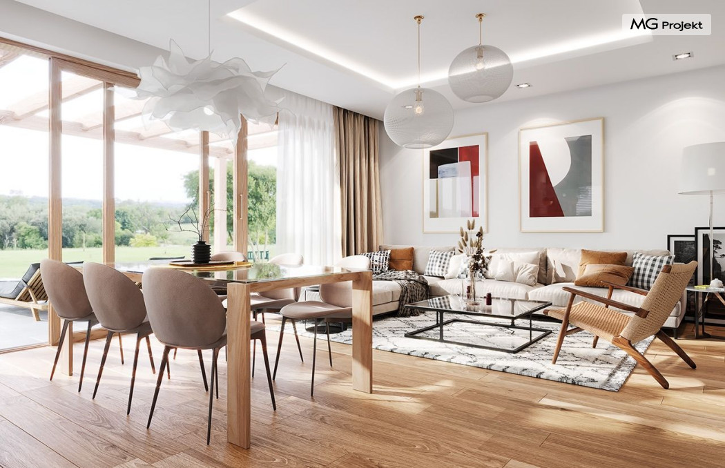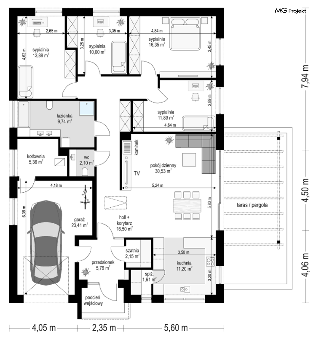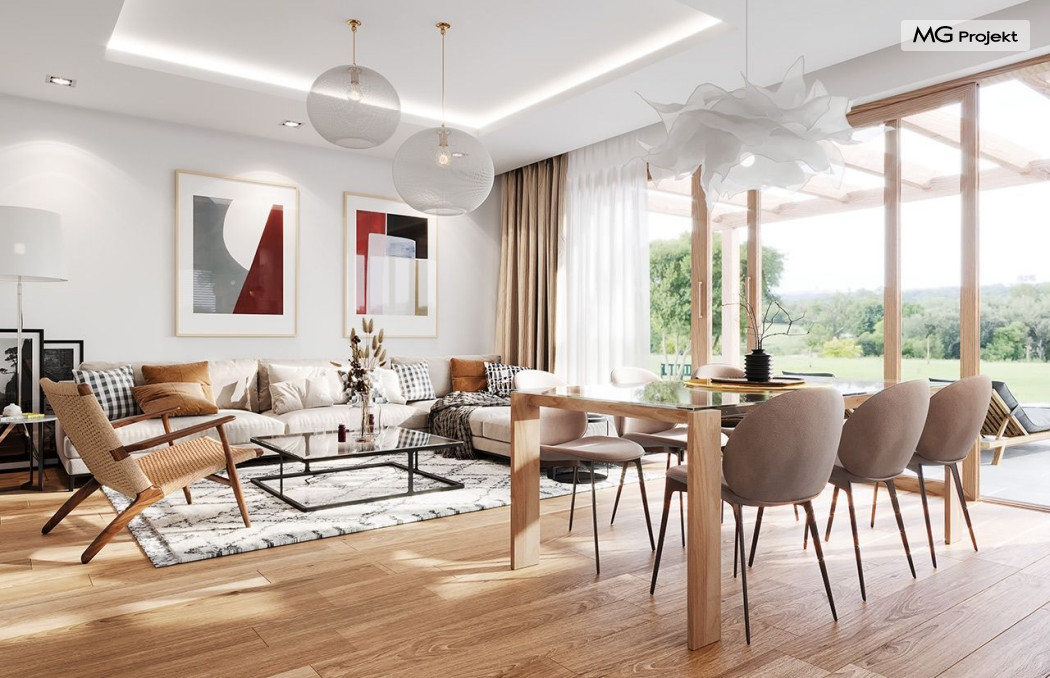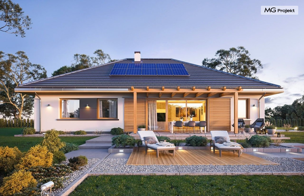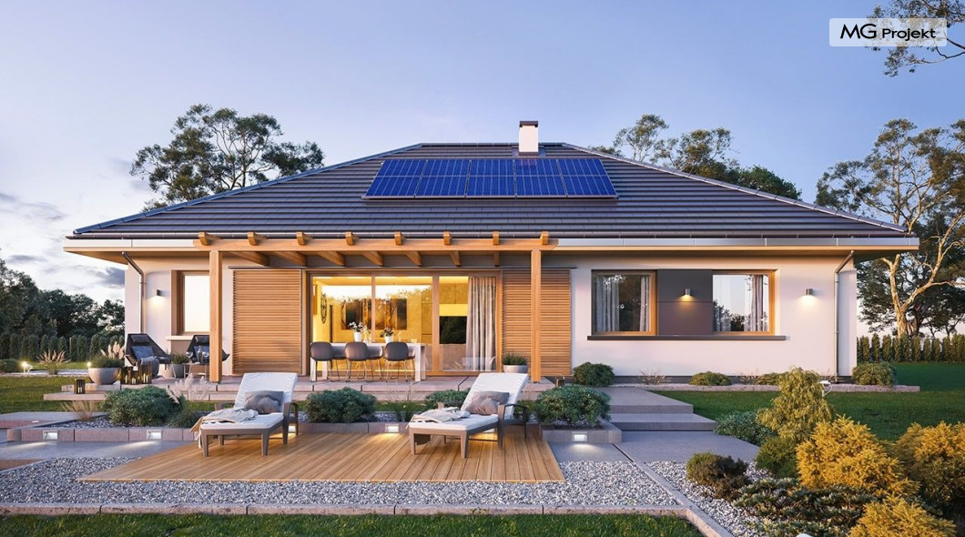 Projekt domu Dom na Wygodnej to projekt idealnej „parterówki” dla 4-5 osobowej rodziny. Dom rzeczywiście jest zaprojektowany jako bardzo wygodna komfortowa mini-willa dla Inwestorów marzących o luksusach życia na jednym poziomie - bez biegania po schodach. To propozycja dla Klientów dysponujących parcelą z ogrodem wychodzącym na stronę boczną ( na przykład w przypadku działek z niekorzystnym usytuowaniem względem stron świata i słońca ). Budynek został zaprojektowany na planie prostokąta i jest przykryty czterospadowym symetrycznym dachem krytym dachówką.Architektura domu jest spokojna i stonowana, choć dzięki właściwym proporcjom i ciekawym detalom dom ma w sobie coś co przyciąga wzrok i interesuje. Elewację frontową budynku ozdabia reprezentacyjne wejście, zaakcentowane nowoczesnym daszkiem i pięknymi szerokimi drzwiami z naświetlem, osadzonymi w kontrastującej ścianie podcienia. Elewację wychodzącą na ogród ozdabiają szerokie piękne przeszklenia salonu z przesuwnymi okiennicami-żaluzjami, oraz zadaszenie pergoli. Całość budynku wieńczy proporcjonalny dach kryjący w sobie dodatkową przestrzeń strychową do wykorzystania dla domowników. Wnętrze domu podzielone zostało tradycyjnie na część dzienną, do której dostajemy się wprost z wygodnego przedsionka z szatnią, następnie część nocną z czterema pokojami sypialnymi, oraz część gospodarczą z garażem i kotłownią. Część dzienna to salon, z wygodną kuchnią i holem, otwarty szeroko na taras i ogród, z wydzielonym narożnikiem wypoczynkowym, ze ścianą kominkowo – telewizyjną. W części nocnej w bazowej wersji projektu przewidziano cztery pokoje, ale można tą część urządzić w dowolny sposób - na przykład zmniejszając ilość sypialni do trzech i dodając dodatkową garderobę i extra łazienkę. Wnętrze domu stosownie do skali i powierzchni budynku jest bardzo funkcjonalne i komfortowe - jak na Dom na Wygodnej przystało. Budynek ma prostą bryłę i konstrukcję – będzie łatwy i szybki w budowie. Zastosowane bardzo dobre izolacje i nowoczesne instalacje dają w efekcie budynek energooszczędny - tani w późniejszej eksploatacji. Dom na Wygodnej to doskonała propozycja dla Inwestorów planujących budowę wygodnego parterowego domu o stonowanej nowoczesnej architekturze.
