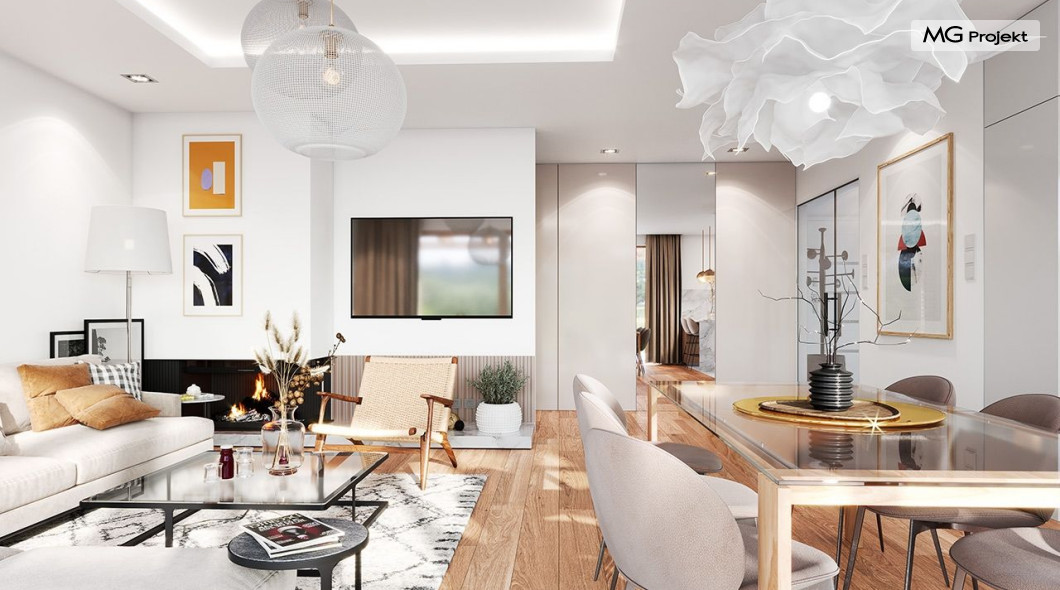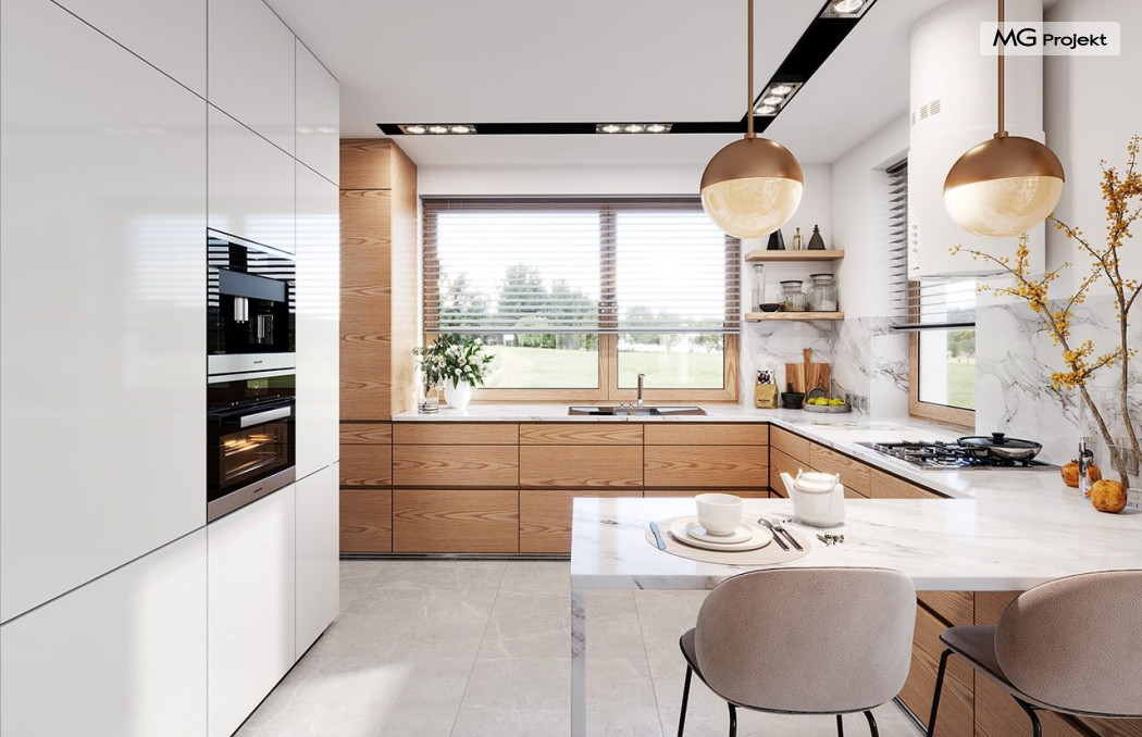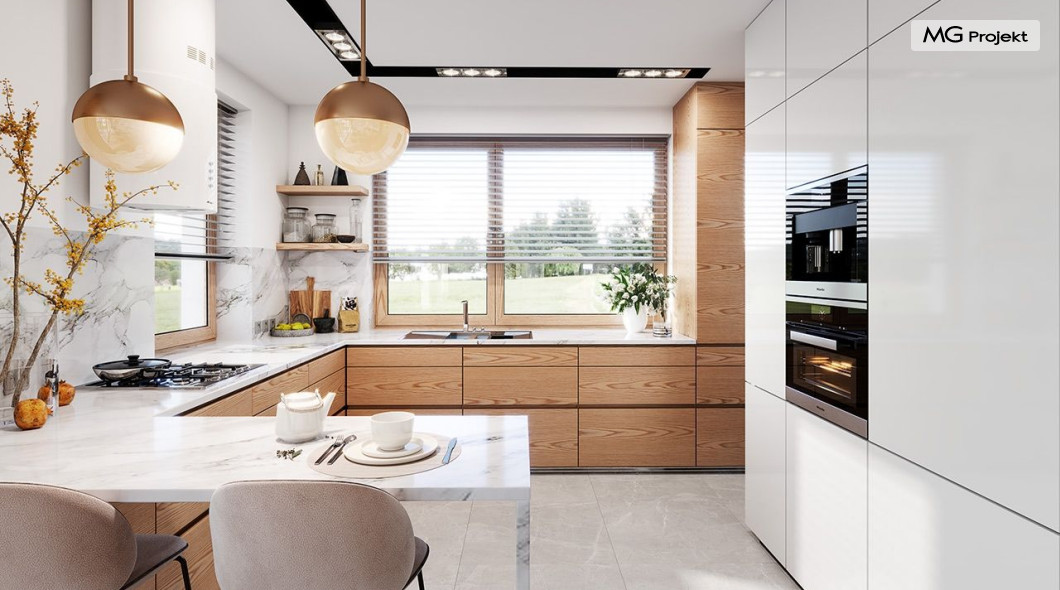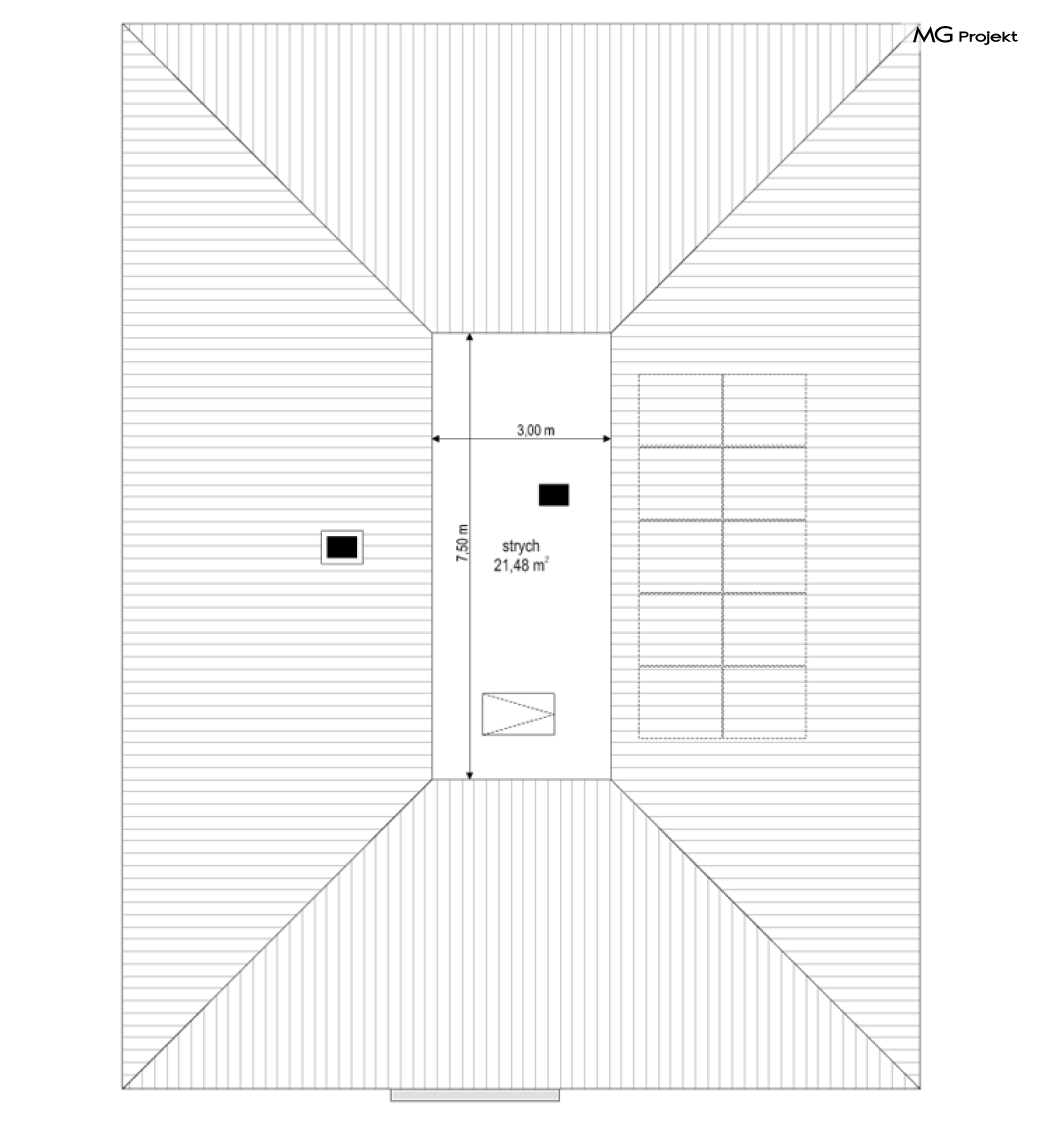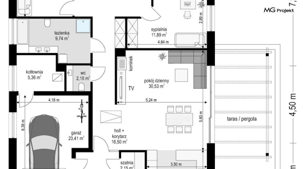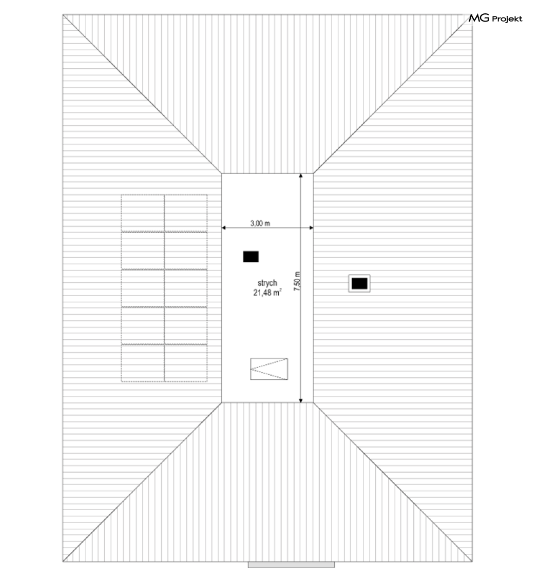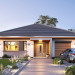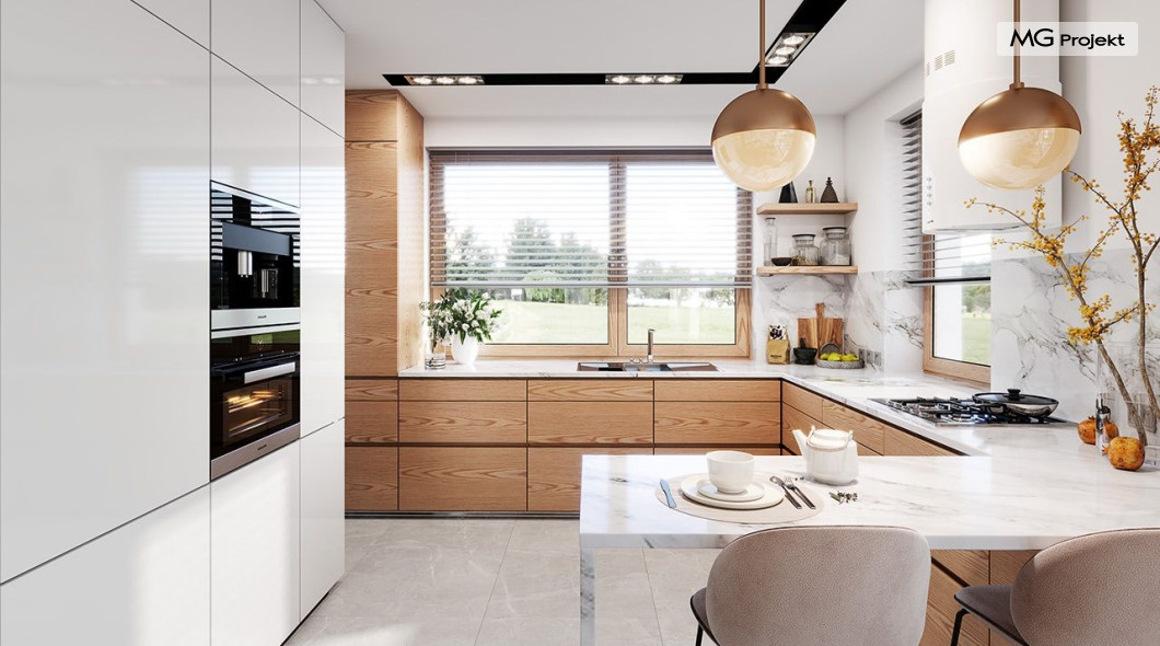 Projekt domu Dom na Wygodnej to projekt idealnej „parterówki” dla 4-5 osobowej rodziny. Dom rzeczywiście jest zaprojektowany jako bardzo wygodna komfortowa mini-willa dla Inwestorów marzących o luksusach życia na jednym poziomie - bez biegania po schodach. To propozycja dla Klientów dysponujących parcelą z ogrodem wychodzącym na stronę boczną ( na przykład w przypadku działek z niekorzystnym usytuowaniem względem stron świata i słońca ). Budynek został zaprojektowany na planie prostokąta i jest przykryty czterospadowym symetrycznym dachem krytym dachówką.Architektura domu jest spokojna i stonowana, choć dzięki właściwym proporcjom i ciekawym detalom dom ma w sobie coś co przyciąga wzrok i interesuje. Elewację frontową budynku ozdabia reprezentacyjne wejście, zaakcentowane nowoczesnym daszkiem i pięknymi szerokimi drzwiami z naświetlem, osadzonymi w kontrastującej ścianie podcienia. Elewację wychodzącą na ogród ozdabiają szerokie piękne przeszklenia salonu z przesuwnymi okiennicami-żaluzjami, oraz zadaszenie pergoli. Całość budynku wieńczy proporcjonalny dach kryjący w sobie dodatkową przestrzeń strychową do wykorzystania dla domowników. Wnętrze domu podzielone zostało tradycyjnie na część dzienną, do której dostajemy się wprost z wygodnego przedsionka z szatnią, następnie część nocną z czterema pokojami sypialnymi, oraz część gospodarczą z garażem i kotłownią. Część dzienna to salon, z wygodną kuchnią i holem, otwarty szeroko na taras i ogród, z wydzielonym narożnikiem wypoczynkowym, ze ścianą kominkowo – telewizyjną. W części nocnej w bazowej wersji projektu przewidziano cztery pokoje, ale można tą część urządzić w dowolny sposób - na przykład zmniejszając ilość sypialni do trzech i dodając dodatkową garderobę i extra łazienkę. Wnętrze domu stosownie do skali i powierzchni budynku jest bardzo funkcjonalne i komfortowe - jak na Dom na Wygodnej przystało. Budynek ma prostą bryłę i konstrukcję – będzie łatwy i szybki w budowie. Zastosowane bardzo dobre izolacje i nowoczesne instalacje dają w efekcie budynek energooszczędny - tani w późniejszej eksploatacji. Dom na Wygodnej to doskonała propozycja dla Inwestorów planujących budowę wygodnego parterowego domu o stonowanej nowoczesnej architekturze.