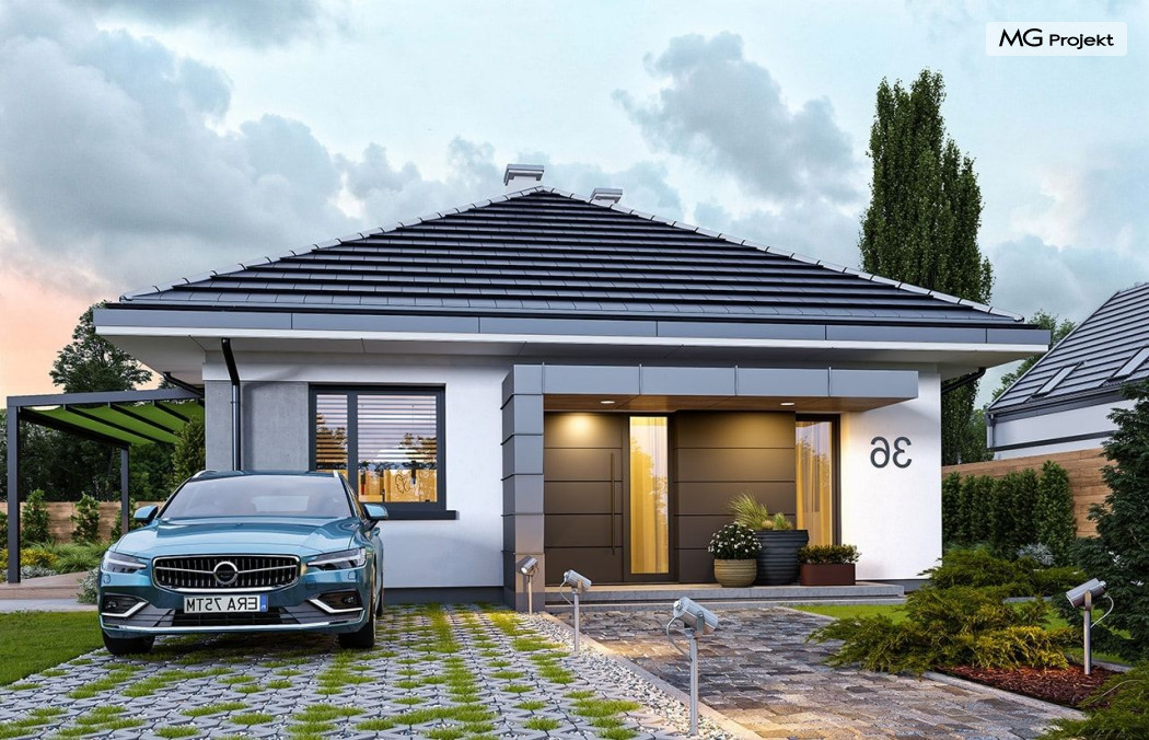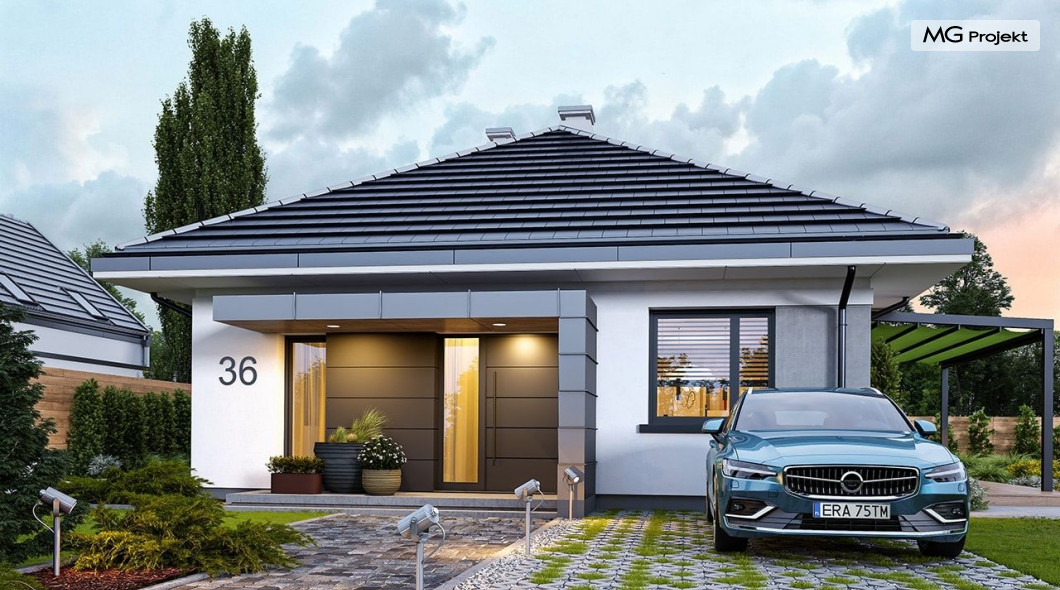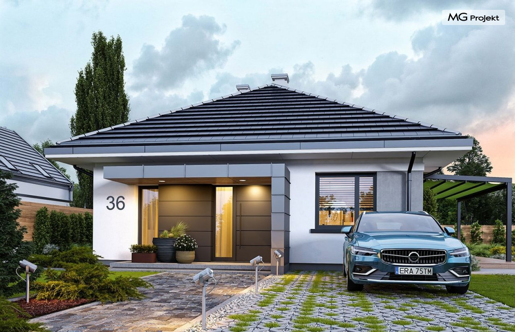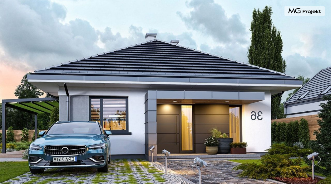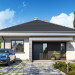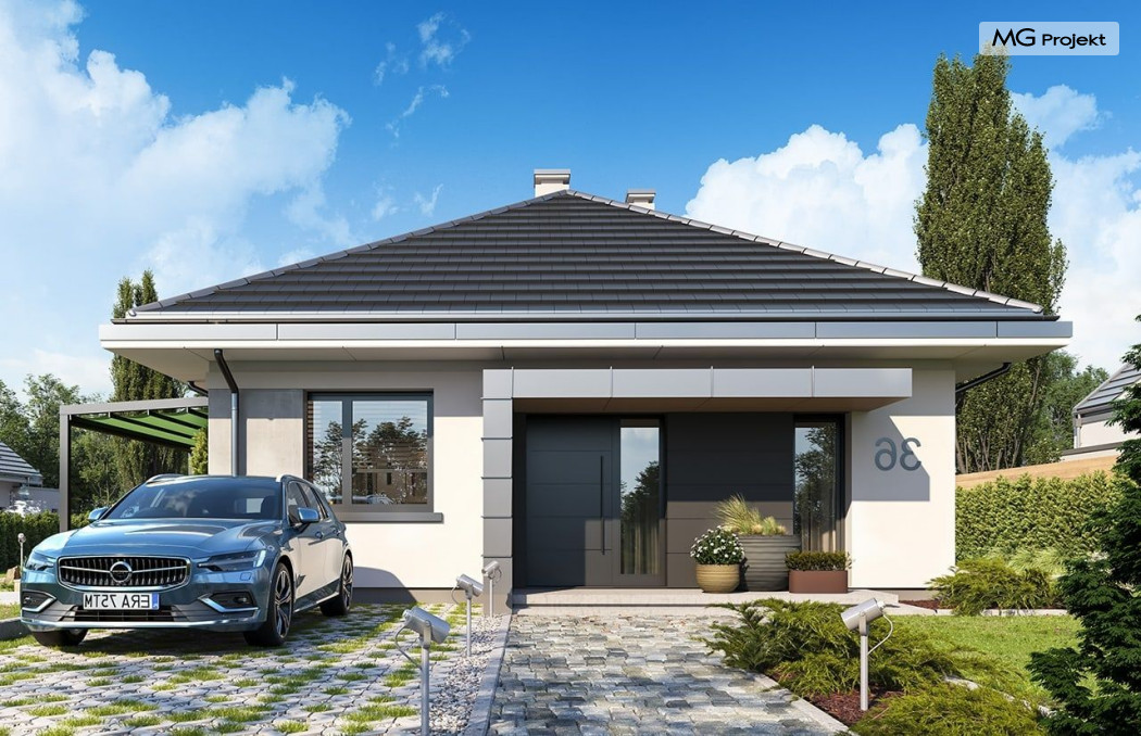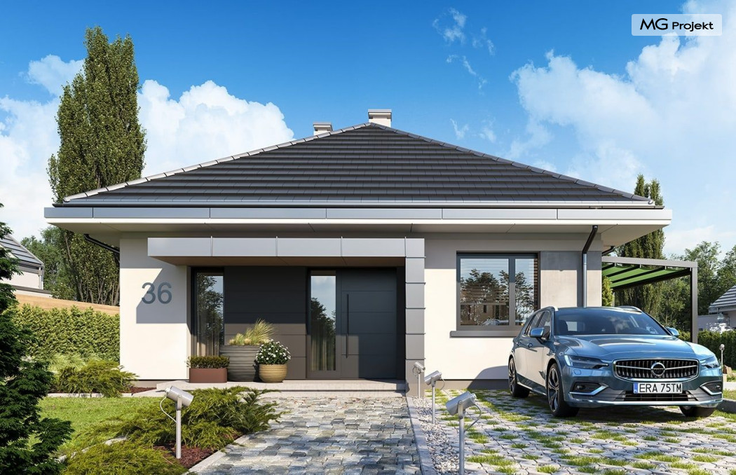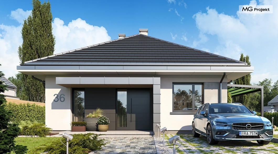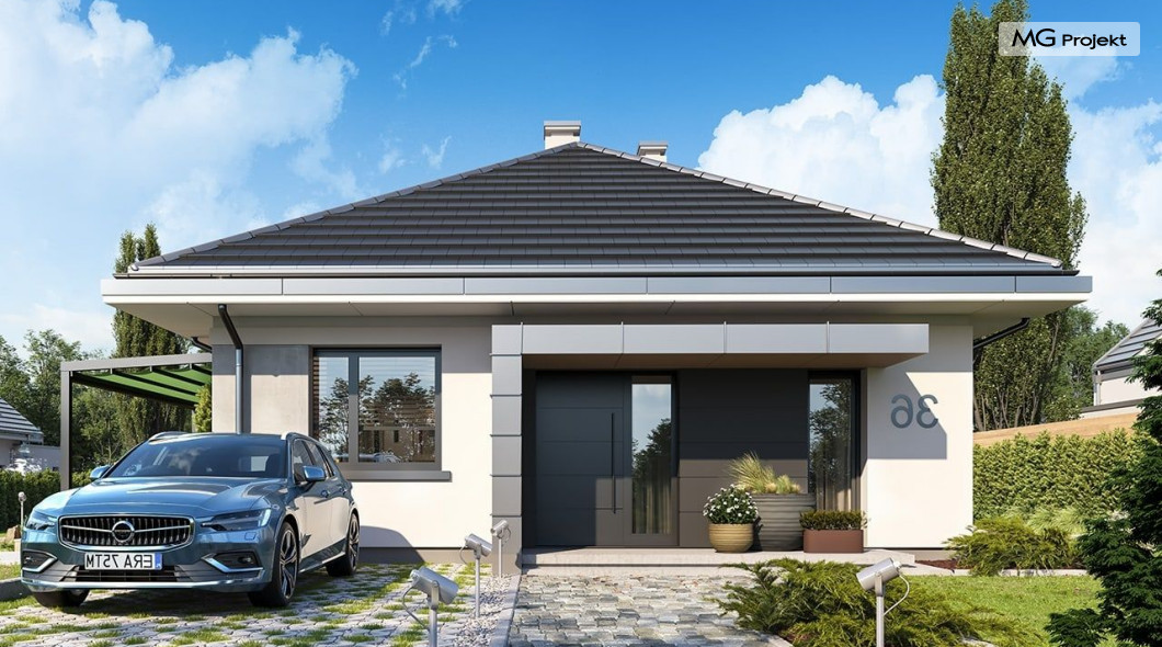 Projekt domu Dom na Przytulnej 2 to kolejna propozycja projektu niewielkiego parterowego domu z serii „przytulnych” - tym razem budynek dla 4-osobowej rodziny, na prostokątnym planie, przykryty czterospadowym dachem krytym dachówką. Cały program użytkowy domu mieści się na jednej kondygnacji. Głównym założeniem projektu jest funkcjonalność budynku, oraz jego późniejsze bezproblemowa użytkowanie. Architektura budynku jest nowoczesna, z atrakcyjną kolorystyką i zastosowanymi nowoczesnymi materiałami. Oszczędny detal, brak zbędnych ozdób i udziwnień, daje w efekcie prosty i elegancji wygląd zewnętrzny domu. Elewacja frontowa urozmaicona została reprezentacyjnym wejściem z zadaszeniem, z drzwiami z bocznym naświetlem i okładziną nawiązującą do podziałów na skrzydle drzwi. Od strony elewacji ogrodowej dominują szerokie drzwi balkonowe łączące salon z tarasem, oraz konstrukcja pergoli z odsuwaną markizą – zadaszeniem ( tarasolą). Wnętrze domu zaprojektowano z podziałem na otwartą przestrzeń dzienną, z salonem i kuchnią, oraz część z trzema sypialniami i łazienką. Przy strefie wejściowej umieszczono dodatkowo dwa pomieszczenia techniczne dostępne z przedsionka - kotłownię i pralnię /suszarnię. W salonie mamy szeroką ścianę telewizyjno – kominkową, zestaw mebli wypoczynkowych i jadalnię z wygodnym stołem, a nade wszystko szerokie otwarcie drzwiami balkonowymi na taras i otaczający dom ogród. Z sypialni rodziców również zaprojektowano dodatkowe drzwi balkonowe na taras - miejsce spożywania porannej kawy. „Dom na Przytulnej 2” to budynek o prostej konstrukcji. Całą bryłę udało się zamknąć czterema ścianami zewnętrznymi - prościej się nie da. Parter domu zwieńczony jest czterospadowym dachem w konstrukcji z wiązarów, z przestrzenią strychową jako domowym magazynem rzeczy mniej i bardziej potrzebnych. Budynek jest energooszczędny, bardzo dobrze ocieplony i wyposażony w nowoczesne instalacje, dzięki czemu będzie tani w utrzymaniu. Łatwa konstrukcja domu uprości i przyspieszy budowę, oraz ułatwi późniejszą eksploatację i serwisowanie budynku. „Dom na Przytulnej 2 ” to propozycja niedużego niedrogiego domu, dla Inwestorów nie planujących wydać ostatnich pieniędzy w swoim życiu na budowę, chcących mieszkać komfortowo i swobodnie w swoim upragnionym domku.