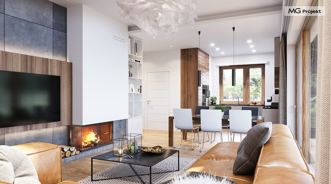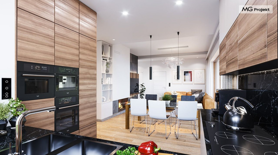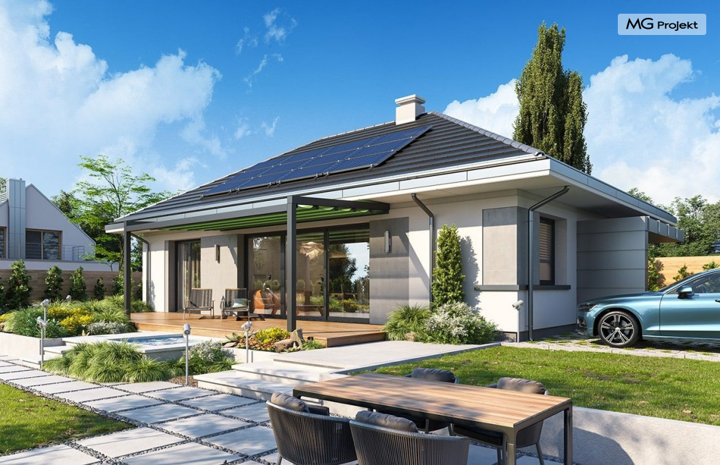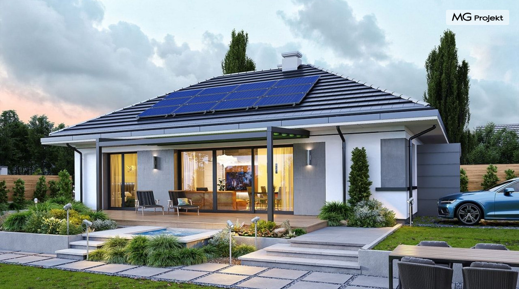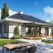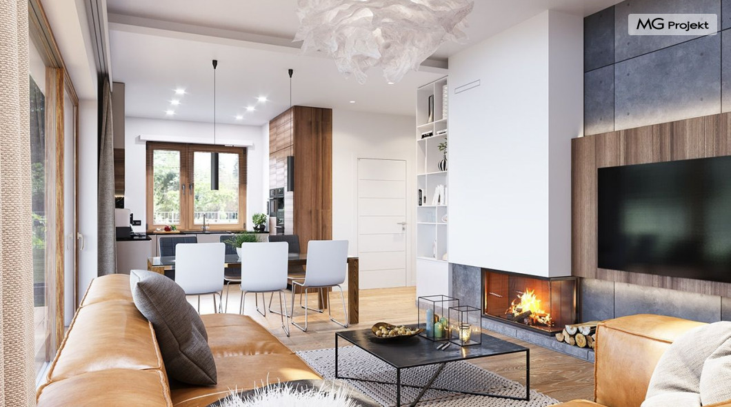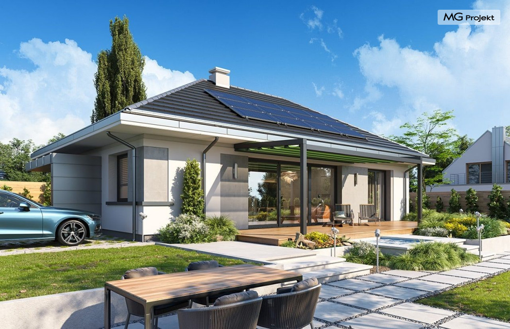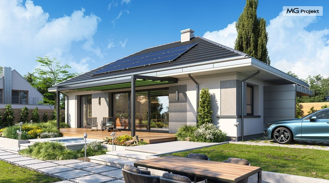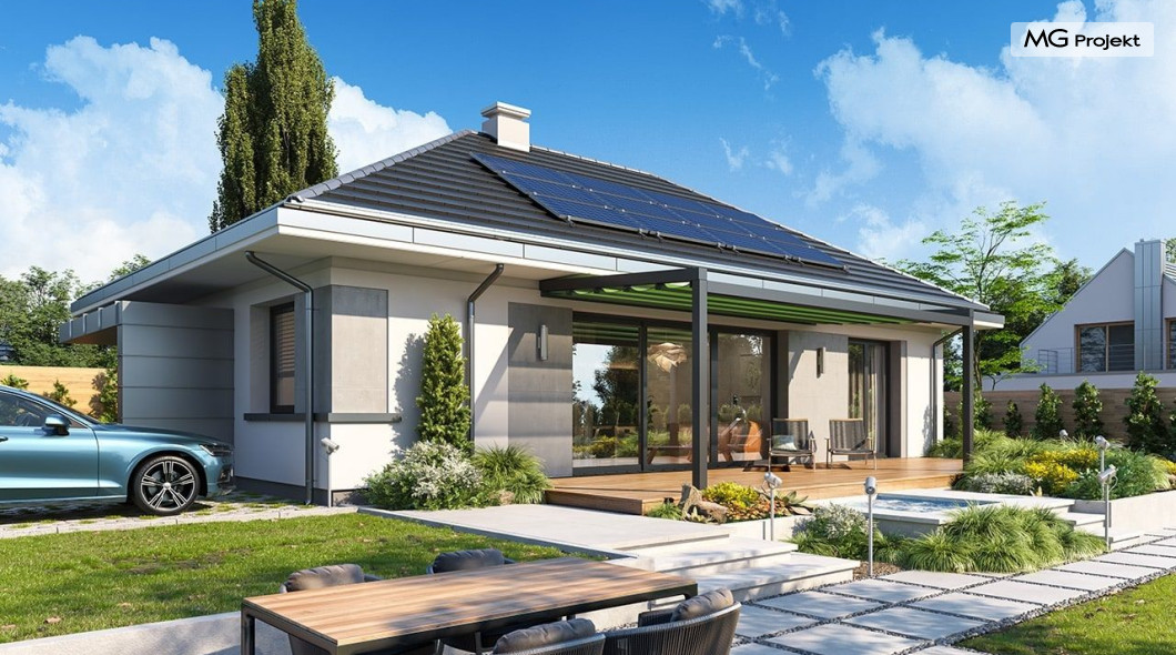 Projekt domu Dom na Przytulnej 2 to kolejna propozycja projektu niewielkiego parterowego domu z serii „przytulnych” - tym razem budynek dla 4-osobowej rodziny, na prostokątnym planie, przykryty czterospadowym dachem krytym dachówką. Cały program użytkowy domu mieści się na jednej kondygnacji. Głównym założeniem projektu jest funkcjonalność budynku, oraz jego późniejsze bezproblemowa użytkowanie. Architektura budynku jest nowoczesna, z atrakcyjną kolorystyką i zastosowanymi nowoczesnymi materiałami. Oszczędny detal, brak zbędnych ozdób i udziwnień, daje w efekcie prosty i elegancji wygląd zewnętrzny domu. Elewacja frontowa urozmaicona została reprezentacyjnym wejściem z zadaszeniem, z drzwiami z bocznym naświetlem i okładziną nawiązującą do podziałów na skrzydle drzwi. Od strony elewacji ogrodowej dominują szerokie drzwi balkonowe łączące salon z tarasem, oraz konstrukcja pergoli z odsuwaną markizą – zadaszeniem ( tarasolą). Wnętrze domu zaprojektowano z podziałem na otwartą przestrzeń dzienną, z salonem i kuchnią, oraz część z trzema sypialniami i łazienką. Przy strefie wejściowej umieszczono dodatkowo dwa pomieszczenia techniczne dostępne z przedsionka - kotłownię i pralnię /suszarnię. W salonie mamy szeroką ścianę telewizyjno – kominkową, zestaw mebli wypoczynkowych i jadalnię z wygodnym stołem, a nade wszystko szerokie otwarcie drzwiami balkonowymi na taras i otaczający dom ogród. Z sypialni rodziców również zaprojektowano dodatkowe drzwi balkonowe na taras - miejsce spożywania porannej kawy. „Dom na Przytulnej 2” to budynek o prostej konstrukcji. Całą bryłę udało się zamknąć czterema ścianami zewnętrznymi - prościej się nie da. Parter domu zwieńczony jest czterospadowym dachem w konstrukcji z wiązarów, z przestrzenią strychową jako domowym magazynem rzeczy mniej i bardziej potrzebnych. Budynek jest energooszczędny, bardzo dobrze ocieplony i wyposażony w nowoczesne instalacje, dzięki czemu będzie tani w utrzymaniu. Łatwa konstrukcja domu uprości i przyspieszy budowę, oraz ułatwi późniejszą eksploatację i serwisowanie budynku. „Dom na Przytulnej 2 ” to propozycja niedużego niedrogiego domu, dla Inwestorów nie planujących wydać ostatnich pieniędzy w swoim życiu na budowę, chcących mieszkać komfortowo i swobodnie w swoim upragnionym domku.
