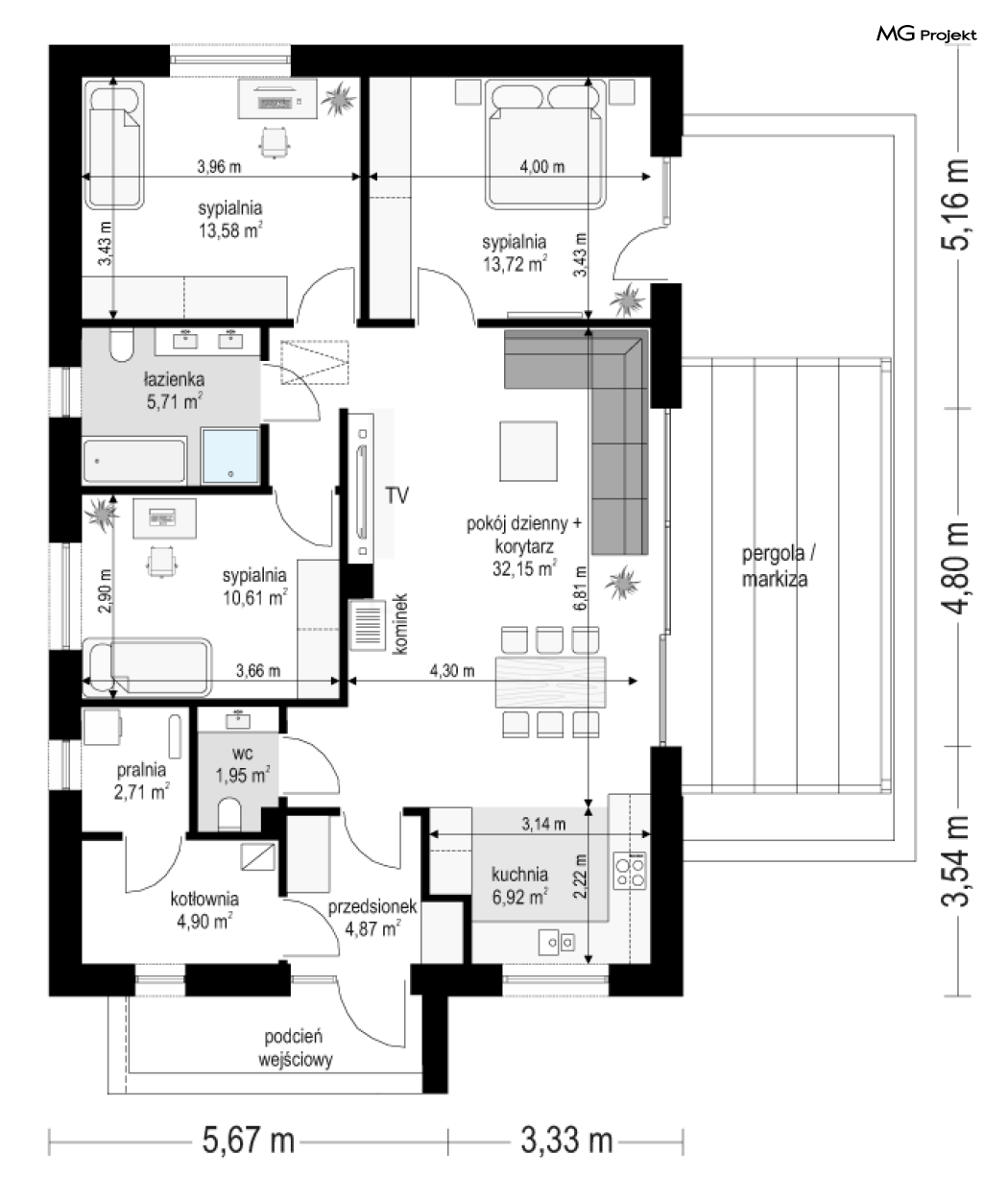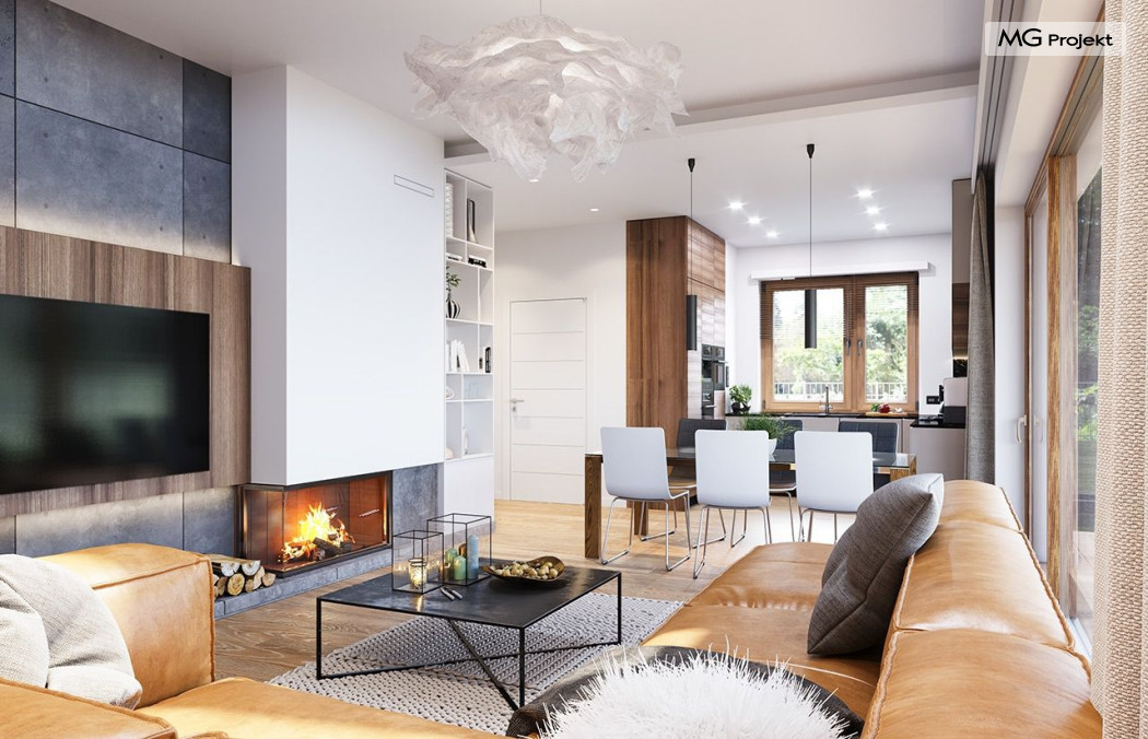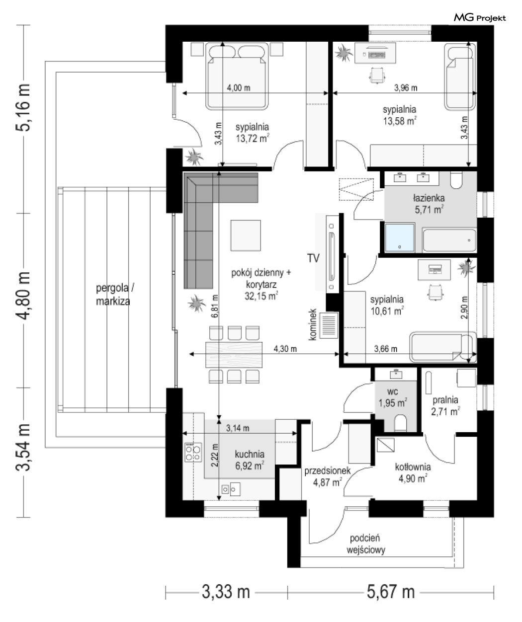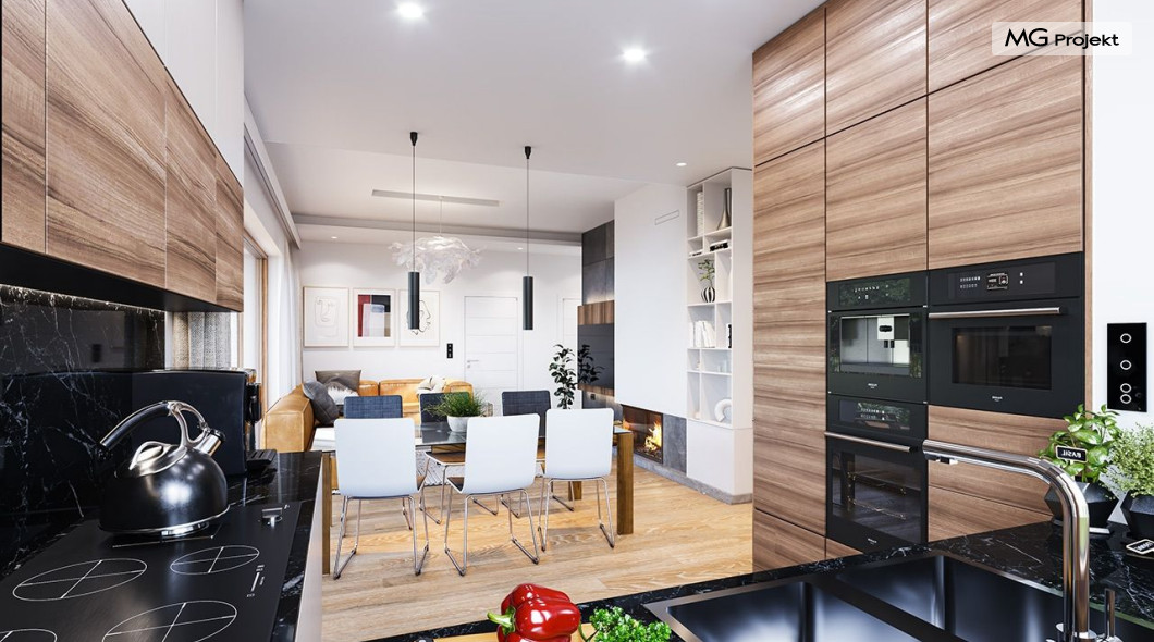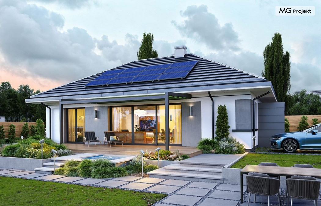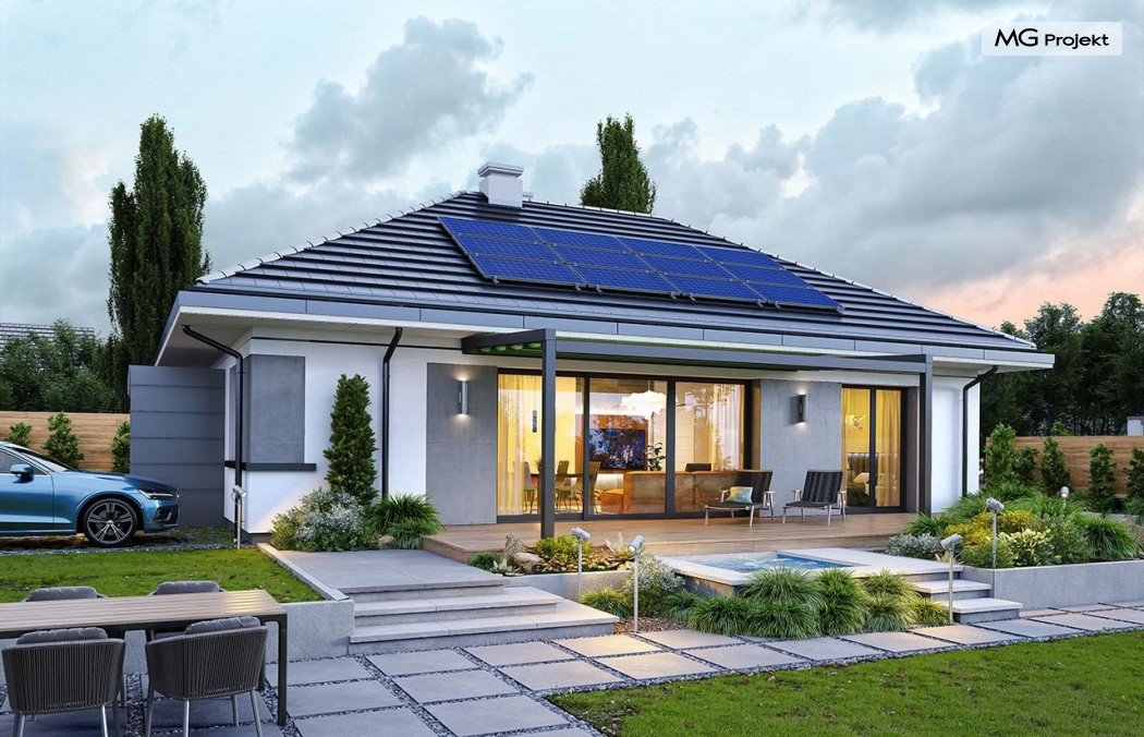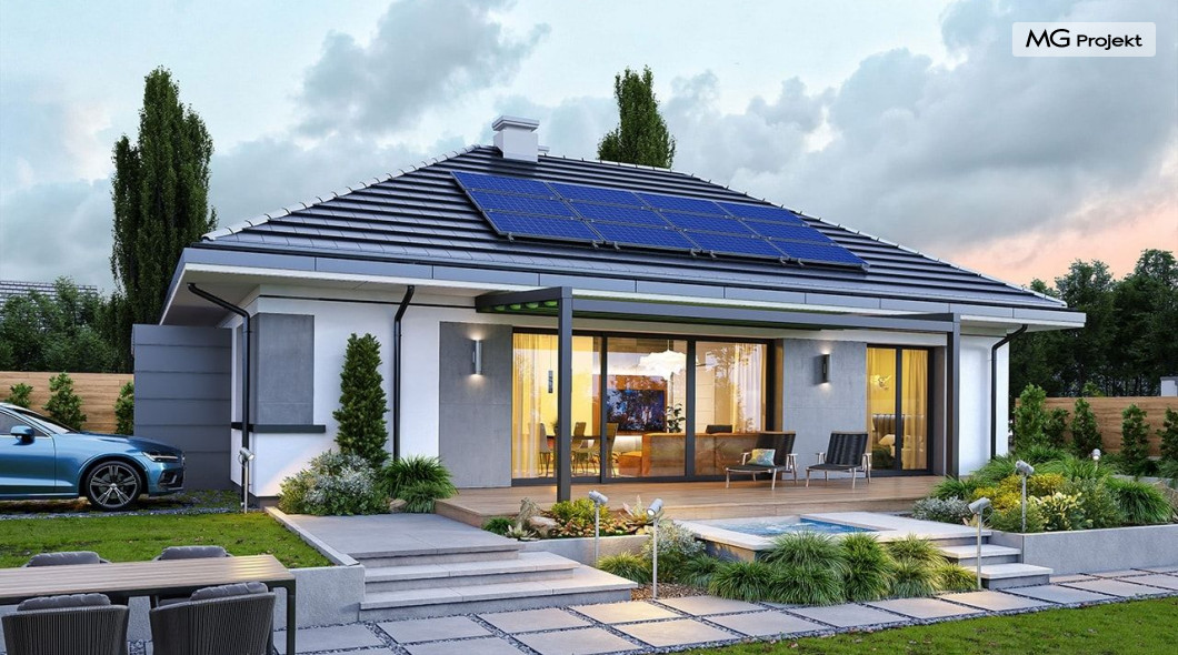 Projekt domu Dom na Przytulnej 2 to kolejna propozycja projektu niewielkiego parterowego domu z serii „przytulnych” - tym razem budynek dla 4-osobowej rodziny, na prostokątnym planie, przykryty czterospadowym dachem krytym dachówką. Cały program użytkowy domu mieści się na jednej kondygnacji. Głównym założeniem projektu jest funkcjonalność budynku, oraz jego późniejsze bezproblemowa użytkowanie. Architektura budynku jest nowoczesna, z atrakcyjną kolorystyką i zastosowanymi nowoczesnymi materiałami. Oszczędny detal, brak zbędnych ozdób i udziwnień, daje w efekcie prosty i elegancji wygląd zewnętrzny domu. Elewacja frontowa urozmaicona została reprezentacyjnym wejściem z zadaszeniem, z drzwiami z bocznym naświetlem i okładziną nawiązującą do podziałów na skrzydle drzwi. Od strony elewacji ogrodowej dominują szerokie drzwi balkonowe łączące salon z tarasem, oraz konstrukcja pergoli z odsuwaną markizą – zadaszeniem ( tarasolą). Wnętrze domu zaprojektowano z podziałem na otwartą przestrzeń dzienną, z salonem i kuchnią, oraz część z trzema sypialniami i łazienką. Przy strefie wejściowej umieszczono dodatkowo dwa pomieszczenia techniczne dostępne z przedsionka - kotłownię i pralnię /suszarnię. W salonie mamy szeroką ścianę telewizyjno – kominkową, zestaw mebli wypoczynkowych i jadalnię z wygodnym stołem, a nade wszystko szerokie otwarcie drzwiami balkonowymi na taras i otaczający dom ogród. Z sypialni rodziców również zaprojektowano dodatkowe drzwi balkonowe na taras - miejsce spożywania porannej kawy. „Dom na Przytulnej 2” to budynek o prostej konstrukcji. Całą bryłę udało się zamknąć czterema ścianami zewnętrznymi - prościej się nie da. Parter domu zwieńczony jest czterospadowym dachem w konstrukcji z wiązarów, z przestrzenią strychową jako domowym magazynem rzeczy mniej i bardziej potrzebnych. Budynek jest energooszczędny, bardzo dobrze ocieplony i wyposażony w nowoczesne instalacje, dzięki czemu będzie tani w utrzymaniu. Łatwa konstrukcja domu uprości i przyspieszy budowę, oraz ułatwi późniejszą eksploatację i serwisowanie budynku. „Dom na Przytulnej 2 ” to propozycja niedużego niedrogiego domu, dla Inwestorów nie planujących wydać ostatnich pieniędzy w swoim życiu na budowę, chcących mieszkać komfortowo i swobodnie w swoim upragnionym domku.