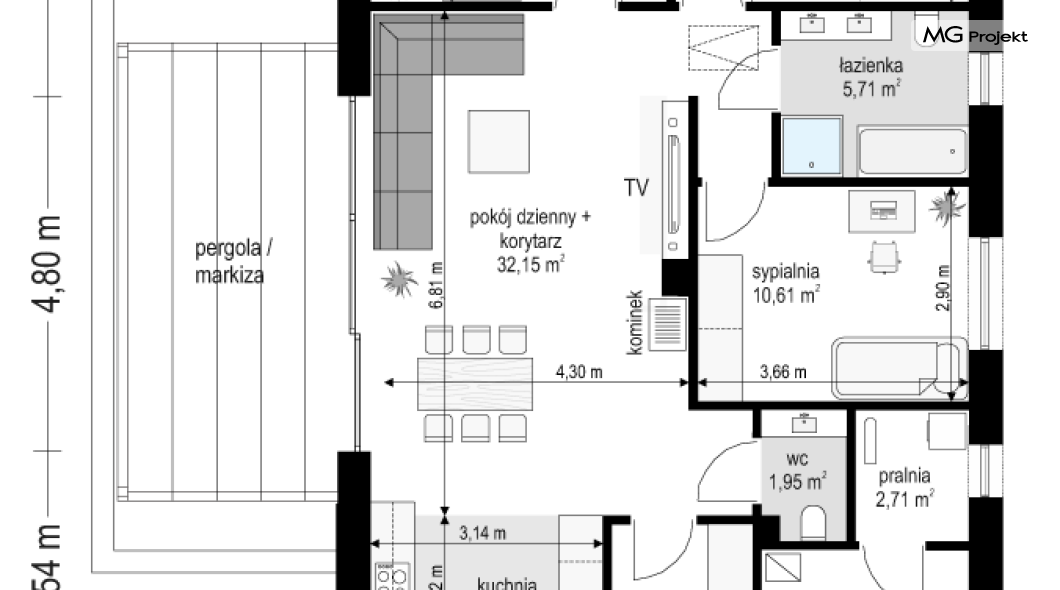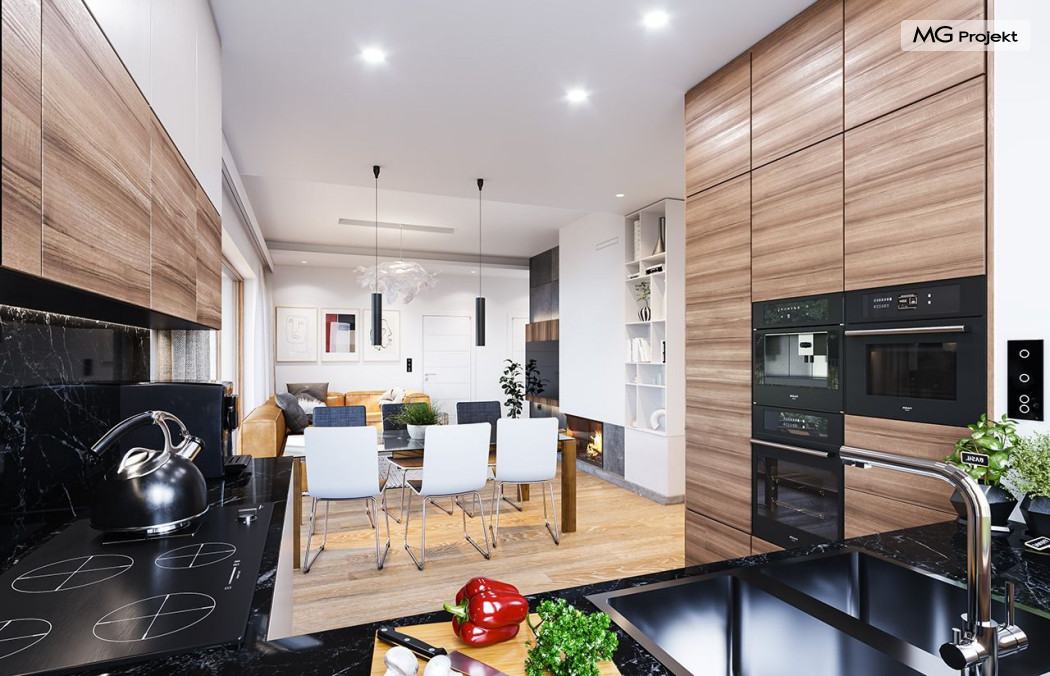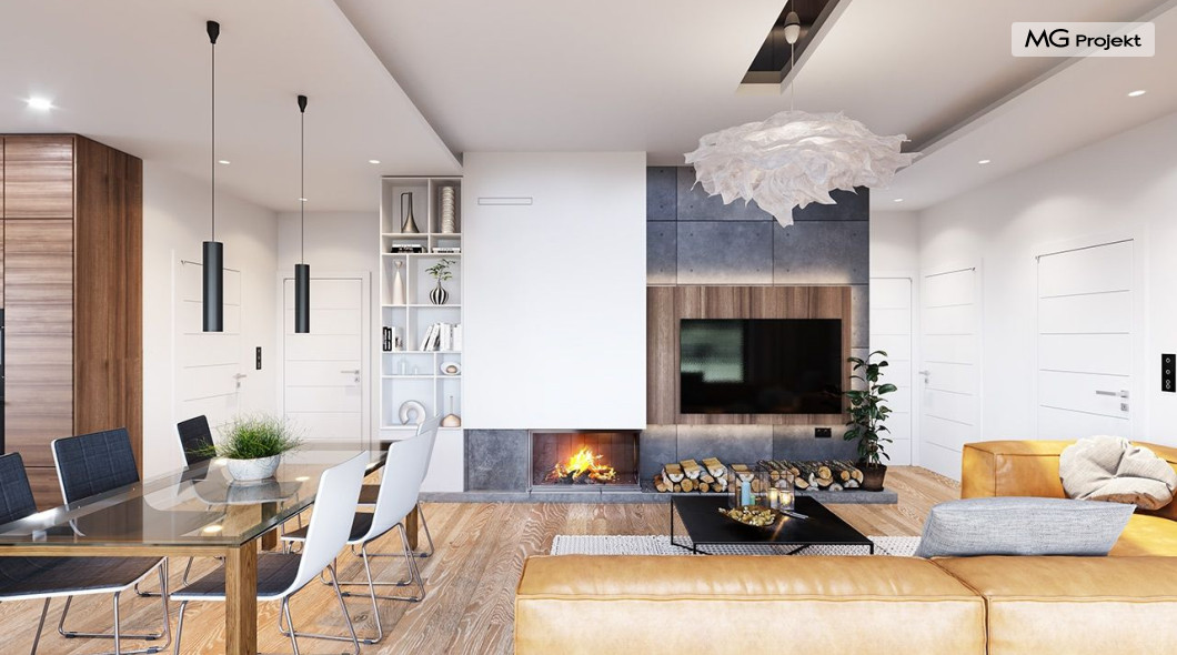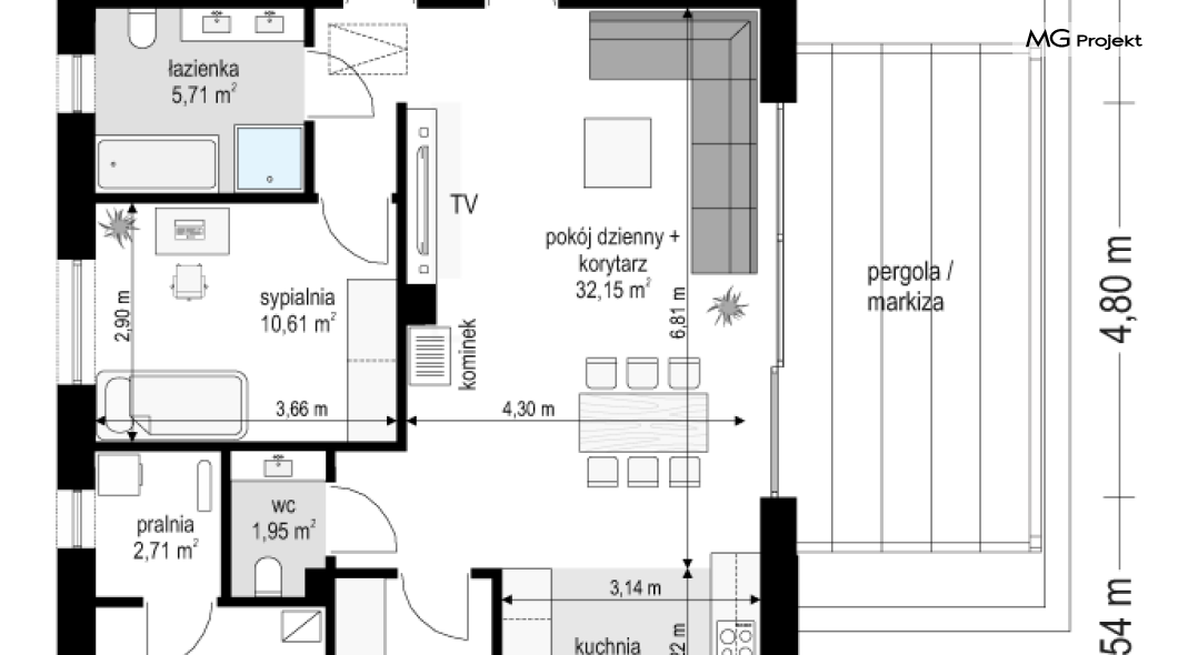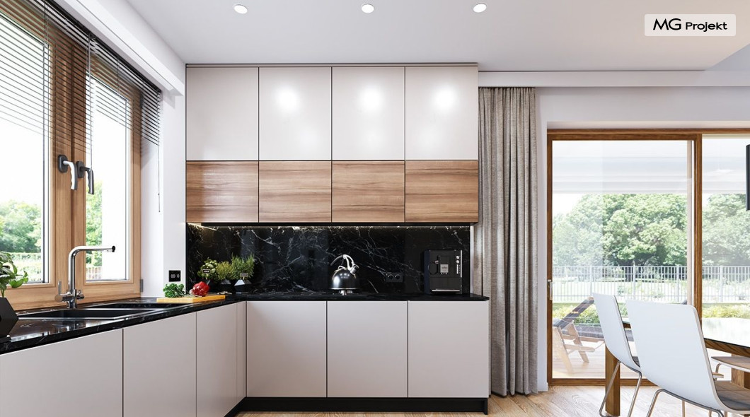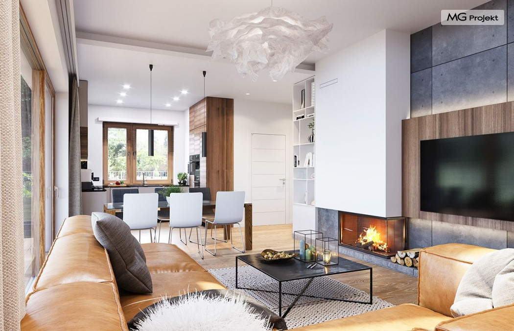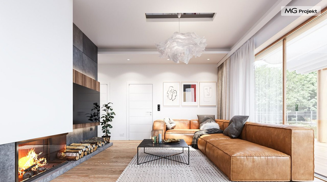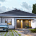 Projekt domu Dom na Przytulnej 2 to kolejna propozycja projektu niewielkiego parterowego domu z serii „przytulnych” - tym razem budynek dla 4-osobowej rodziny, na prostokątnym planie, przykryty czterospadowym dachem krytym dachówką. Cały program użytkowy domu mieści się na jednej kondygnacji. Głównym założeniem projektu jest funkcjonalność budynku, oraz jego późniejsze bezproblemowa użytkowanie. Architektura budynku jest nowoczesna, z atrakcyjną kolorystyką i zastosowanymi nowoczesnymi materiałami. Oszczędny detal, brak zbędnych ozdób i udziwnień, daje w efekcie prosty i elegancji wygląd zewnętrzny domu. Elewacja frontowa urozmaicona została reprezentacyjnym wejściem z zadaszeniem, z drzwiami z bocznym naświetlem i okładziną nawiązującą do podziałów na skrzydle drzwi. Od strony elewacji ogrodowej dominują szerokie drzwi balkonowe łączące salon z tarasem, oraz konstrukcja pergoli z odsuwaną markizą – zadaszeniem ( tarasolą). Wnętrze domu zaprojektowano z podziałem na otwartą przestrzeń dzienną, z salonem i kuchnią, oraz część z trzema sypialniami i łazienką. Przy strefie wejściowej umieszczono dodatkowo dwa pomieszczenia techniczne dostępne z przedsionka - kotłownię i pralnię /suszarnię. W salonie mamy szeroką ścianę telewizyjno – kominkową, zestaw mebli wypoczynkowych i jadalnię z wygodnym stołem, a nade wszystko szerokie otwarcie drzwiami balkonowymi na taras i otaczający dom ogród. Z sypialni rodziców również zaprojektowano dodatkowe drzwi balkonowe na taras - miejsce spożywania porannej kawy. „Dom na Przytulnej 2” to budynek o prostej konstrukcji. Całą bryłę udało się zamknąć czterema ścianami zewnętrznymi - prościej się nie da. Parter domu zwieńczony jest czterospadowym dachem w konstrukcji z wiązarów, z przestrzenią strychową jako domowym magazynem rzeczy mniej i bardziej potrzebnych. Budynek jest energooszczędny, bardzo dobrze ocieplony i wyposażony w nowoczesne instalacje, dzięki czemu będzie tani w utrzymaniu. Łatwa konstrukcja domu uprości i przyspieszy budowę, oraz ułatwi późniejszą eksploatację i serwisowanie budynku. „Dom na Przytulnej 2 ” to propozycja niedużego niedrogiego domu, dla Inwestorów nie planujących wydać ostatnich pieniędzy w swoim życiu na budowę, chcących mieszkać komfortowo i swobodnie w swoim upragnionym domku.