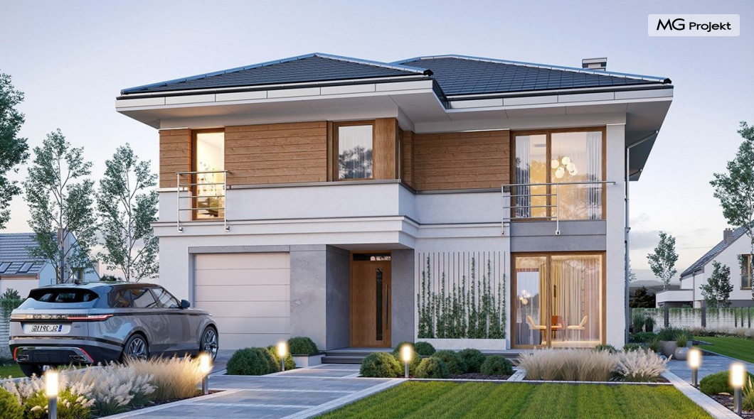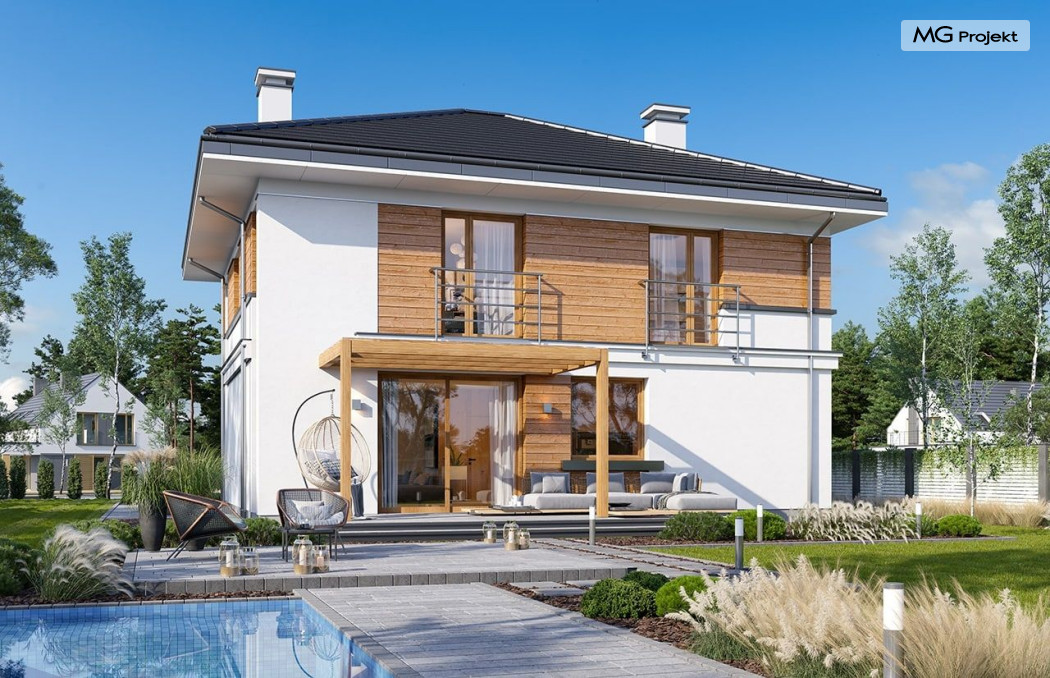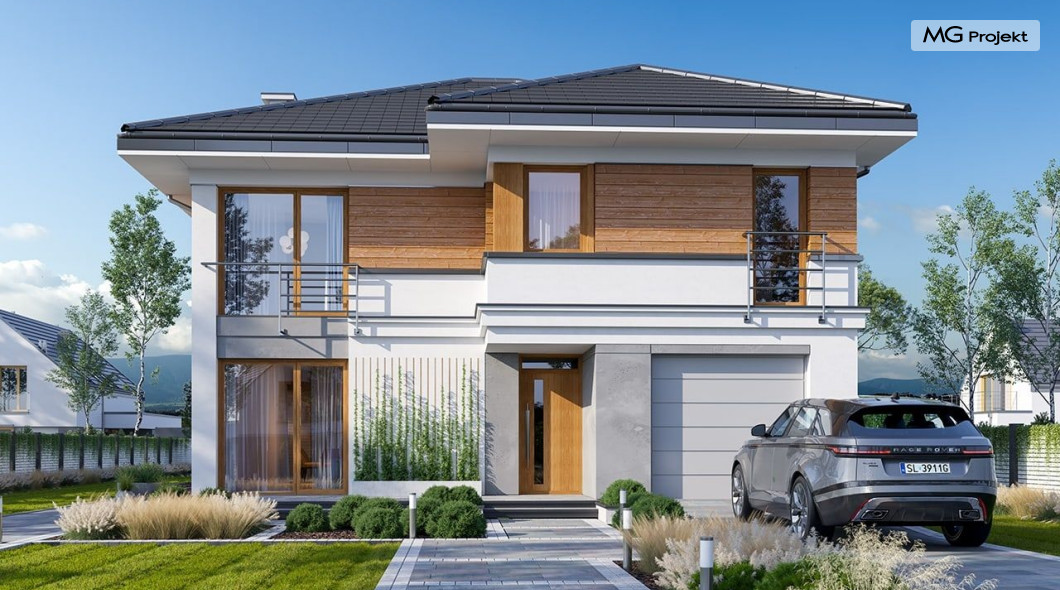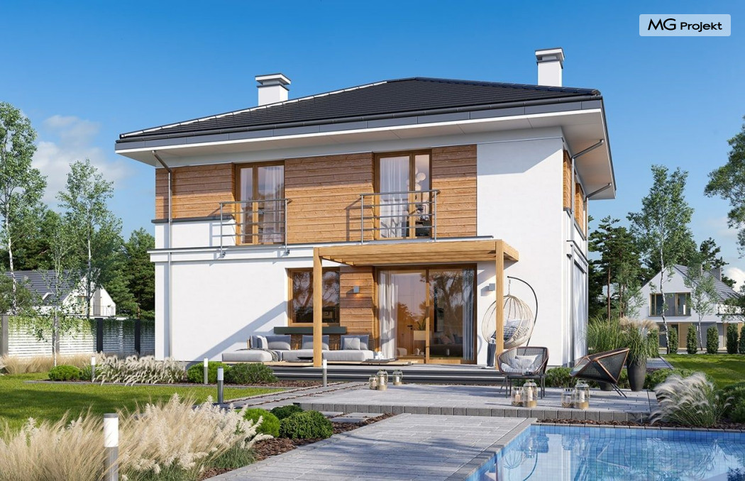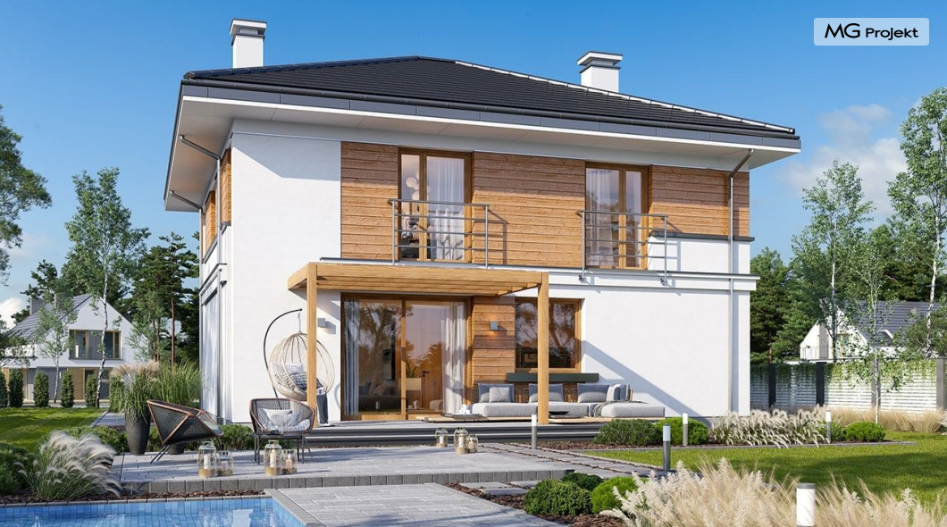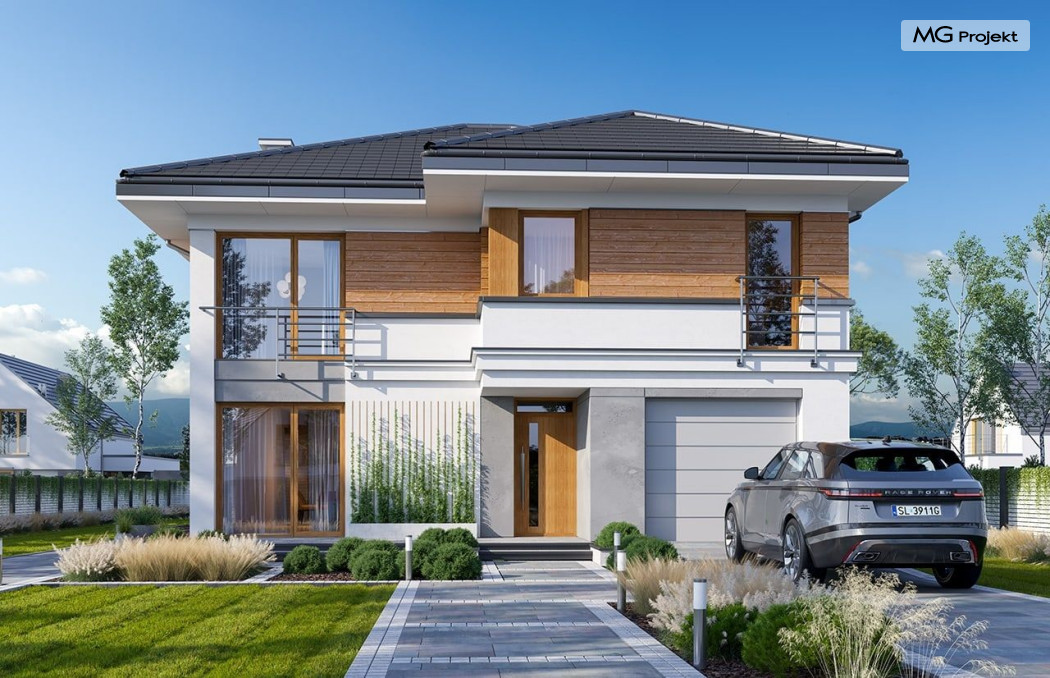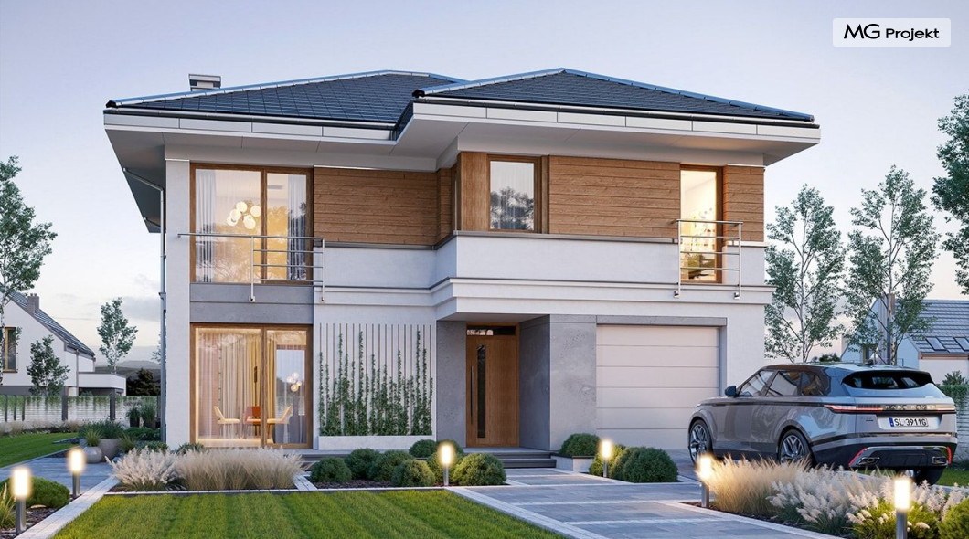 Projekt domu Tytan 5 B jestnową wersją wariantową z popularnej serii domów o tej nazwie. Tytan 5B zaprojektowano jako jednopiętrowy dom dla 4-5 osobowej rodziny. Zbudowany został na kwadratowym rzucie, przykryty czterospadowym dachem o kącie 25 stopni. W bryle znajduje się wbudowany jednostanowiskowy garaż. Domek ma bardzo przyjemną przytulną stylistykę. Prosta forma budynku, ozdobiona została dużymi przeszkleniami i imitującymi drewno łatwymi w utrzymaniu okładzinami. Forma domu łączy w sobie nowoczesność, z elementami tradycji, podkreślając wrażenie solidności i reprezentacyjny wygląd. Dom utrzymano jest w radosnej kolorystyce. Okna z ramami w kolorze drewna, drewnopodobne okładziny ścian, szare kontrastujące fragmenty elewacji i grafitowa nowoczesna dachówka - wszystko daje efekt czystej, dobrze skomponowanej architektury. Wnętrze domu podzielono na część dzienną na parterze, oraz pokoje sypialne na piętrze. Parter to głównie jednoprzestrzenne wnętrze salonu, jadalni i holu, z półotwartą kuchnią, oraz pomieszczenia techniczne - garaż i kotłownia. Górna kondygnacja to cztery pokoje sypialne i dwie łazienki, w tym oddzielona od reszty wnętrza sypialnia rodziców z własną łazienką i bardzo pojemną garderobą. Konstrukcyjne Tytan 5B jest bardzo prosty i będzie łatwy z budowie. W projekcie zastosowano nowoczesne energooszczędne materiały i instalacje, które utrzymają koszty użytkowania domu na niskim poziomie. Tytan 5B to bardzo dobra propozycja dla Inwestorów planujących budowę niewielkiego praktycznego piętrowego domu jednorodzinnego, o estetycznym wyglądzie. W łatwy sposób można go przystosować do standardu NF40. Zapraszamy do zapoznania się z pełną ofertą pracowni MG Projekt: projekt domu Tytan, projekt domu Tytan 2, projekt domu Tytan 2B, projekt domu Tytan 3, projekt domu Tytan 4, projekt domu Tytan 5. Projekty są również dostępne w odbiciu lustrzanym.