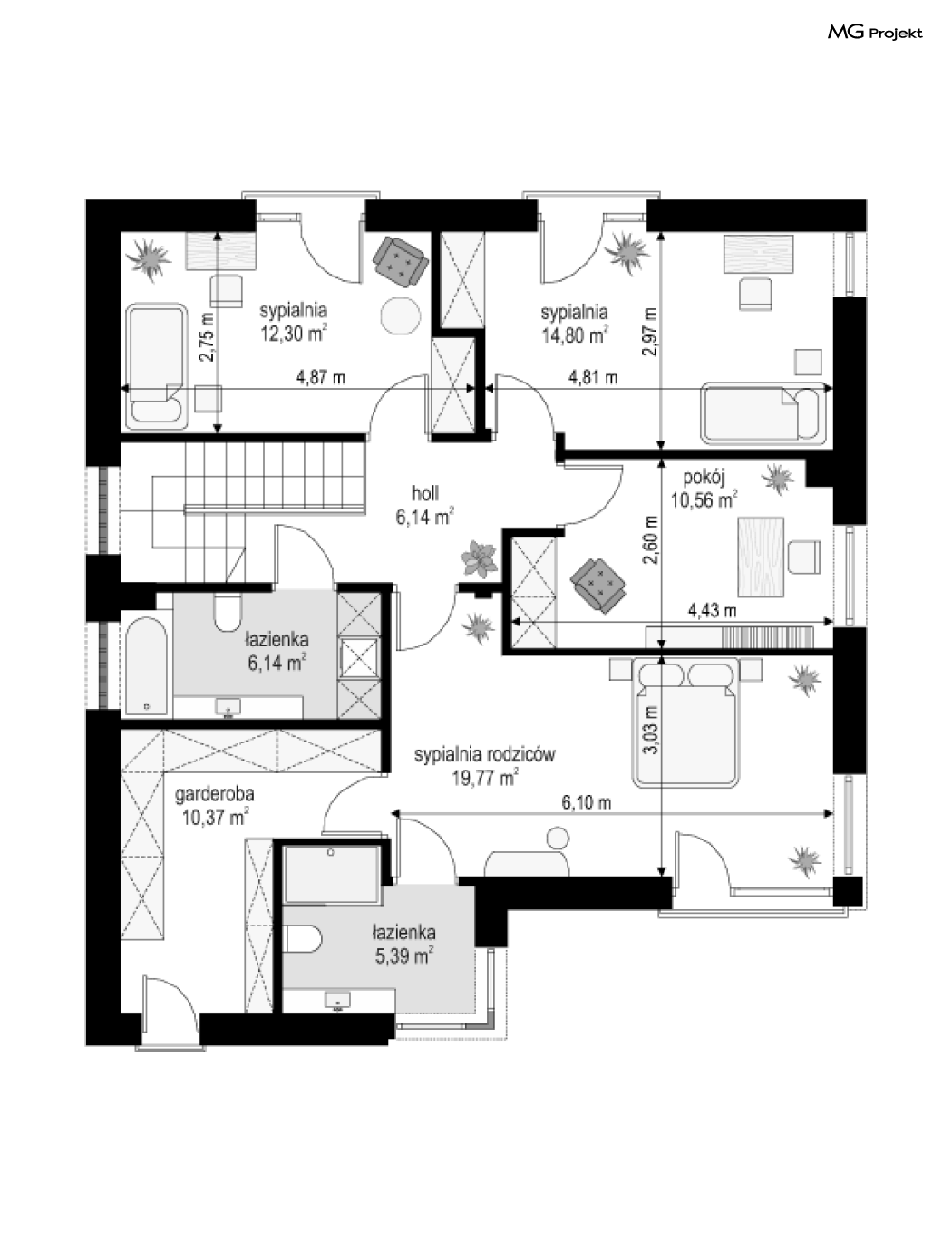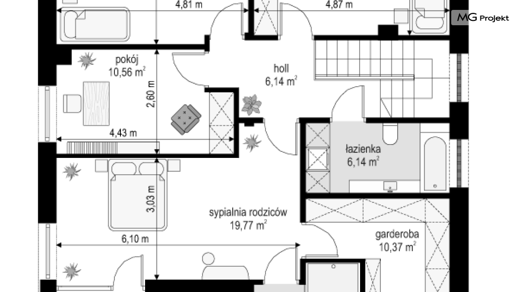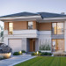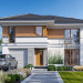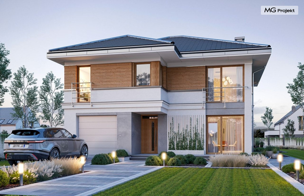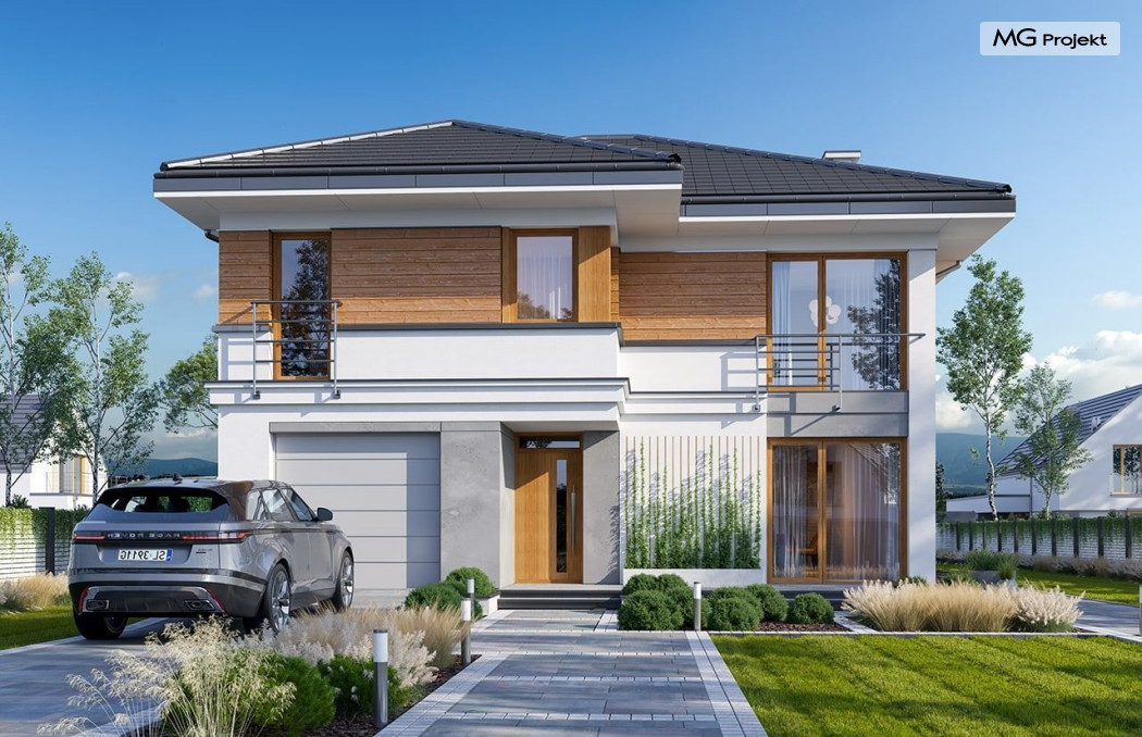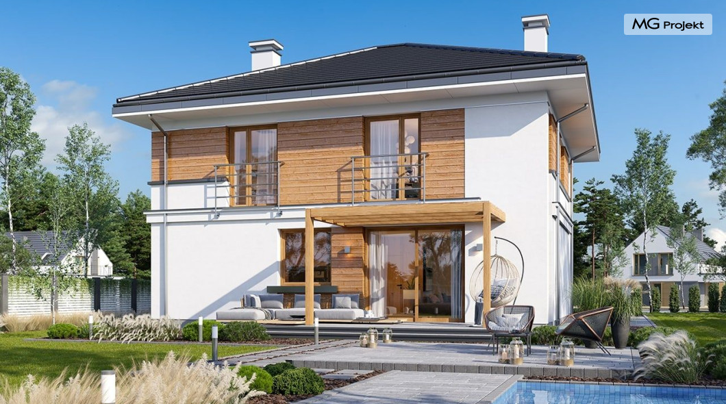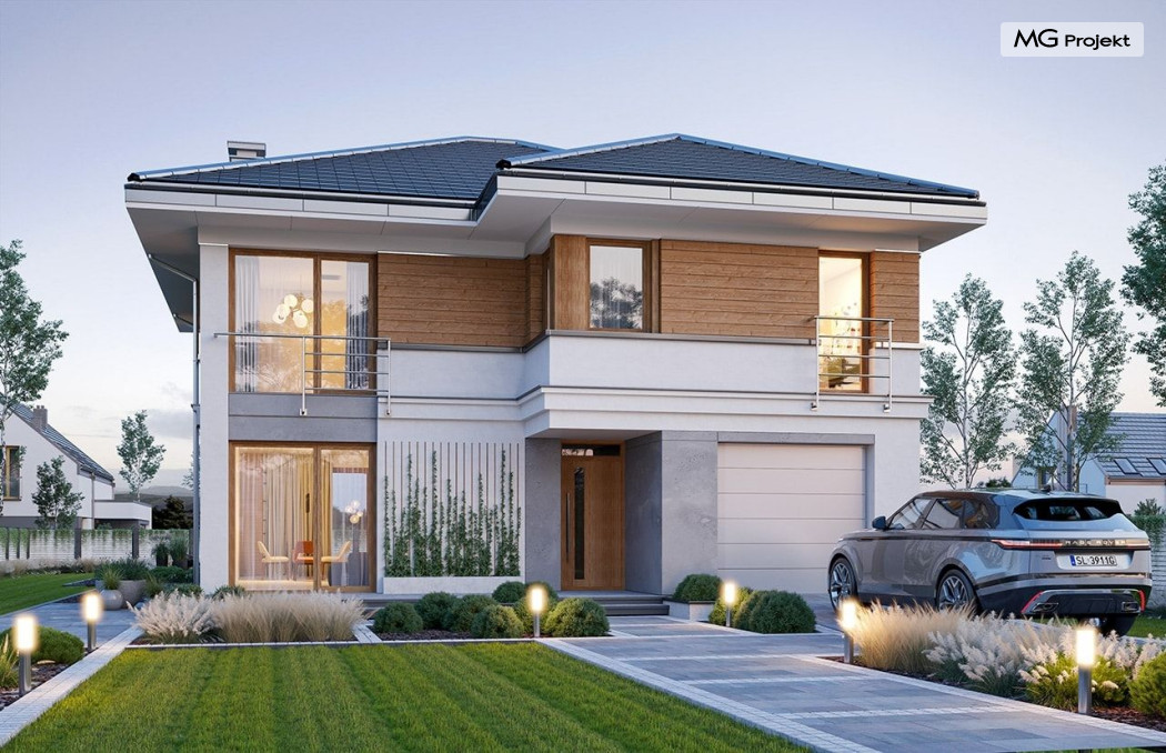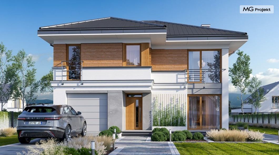 Projekt domu Tytan 5 B jestnową wersją wariantową z popularnej serii domów o tej nazwie. Tytan 5B zaprojektowano jako jednopiętrowy dom dla 4-5 osobowej rodziny. Zbudowany został na kwadratowym rzucie, przykryty czterospadowym dachem o kącie 25 stopni. W bryle znajduje się wbudowany jednostanowiskowy garaż. Domek ma bardzo przyjemną przytulną stylistykę. Prosta forma budynku, ozdobiona została dużymi przeszkleniami i imitującymi drewno łatwymi w utrzymaniu okładzinami. Forma domu łączy w sobie nowoczesność, z elementami tradycji, podkreślając wrażenie solidności i reprezentacyjny wygląd. Dom utrzymano jest w radosnej kolorystyce. Okna z ramami w kolorze drewna, drewnopodobne okładziny ścian, szare kontrastujące fragmenty elewacji i grafitowa nowoczesna dachówka - wszystko daje efekt czystej, dobrze skomponowanej architektury. Wnętrze domu podzielono na część dzienną na parterze, oraz pokoje sypialne na piętrze. Parter to głównie jednoprzestrzenne wnętrze salonu, jadalni i holu, z półotwartą kuchnią, oraz pomieszczenia techniczne - garaż i kotłownia. Górna kondygnacja to cztery pokoje sypialne i dwie łazienki, w tym oddzielona od reszty wnętrza sypialnia rodziców z własną łazienką i bardzo pojemną garderobą. Konstrukcyjne Tytan 5B jest bardzo prosty i będzie łatwy z budowie. W projekcie zastosowano nowoczesne energooszczędne materiały i instalacje, które utrzymają koszty użytkowania domu na niskim poziomie. Tytan 5B to bardzo dobra propozycja dla Inwestorów planujących budowę niewielkiego praktycznego piętrowego domu jednorodzinnego, o estetycznym wyglądzie. W łatwy sposób można go przystosować do standardu NF40. Zapraszamy do zapoznania się z pełną ofertą pracowni MG Projekt: projekt domu Tytan, projekt domu Tytan 2, projekt domu Tytan 2B, projekt domu Tytan 3, projekt domu Tytan 4, projekt domu Tytan 5. Projekty są również dostępne w odbiciu lustrzanym.