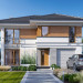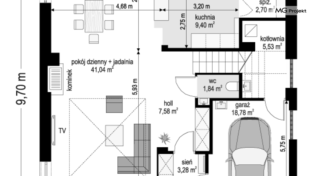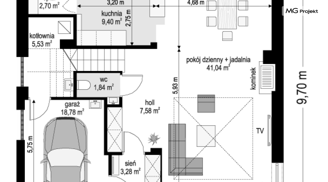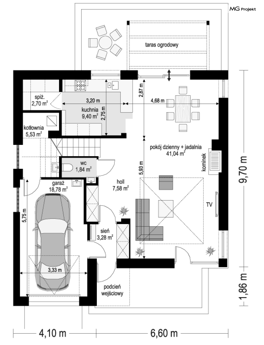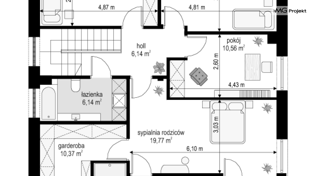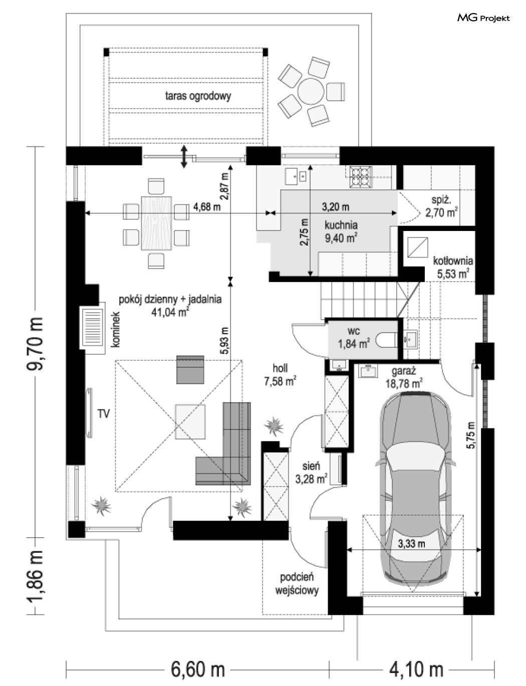 Projekt domu Tytan 5 B jestnową wersją wariantową z popularnej serii domów o tej nazwie. Tytan 5B zaprojektowano jako jednopiętrowy dom dla 4-5 osobowej rodziny. Zbudowany został na kwadratowym rzucie, przykryty czterospadowym dachem o kącie 25 stopni. W bryle znajduje się wbudowany jednostanowiskowy garaż. Domek ma bardzo przyjemną przytulną stylistykę. Prosta forma budynku, ozdobiona została dużymi przeszkleniami i imitującymi drewno łatwymi w utrzymaniu okładzinami. Forma domu łączy w sobie nowoczesność, z elementami tradycji, podkreślając wrażenie solidności i reprezentacyjny wygląd. Dom utrzymano jest w radosnej kolorystyce. Okna z ramami w kolorze drewna, drewnopodobne okładziny ścian, szare kontrastujące fragmenty elewacji i grafitowa nowoczesna dachówka - wszystko daje efekt czystej, dobrze skomponowanej architektury. Wnętrze domu podzielono na część dzienną na parterze, oraz pokoje sypialne na piętrze. Parter to głównie jednoprzestrzenne wnętrze salonu, jadalni i holu, z półotwartą kuchnią, oraz pomieszczenia techniczne - garaż i kotłownia. Górna kondygnacja to cztery pokoje sypialne i dwie łazienki, w tym oddzielona od reszty wnętrza sypialnia rodziców z własną łazienką i bardzo pojemną garderobą. Konstrukcyjne Tytan 5B jest bardzo prosty i będzie łatwy z budowie. W projekcie zastosowano nowoczesne energooszczędne materiały i instalacje, które utrzymają koszty użytkowania domu na niskim poziomie. Tytan 5B to bardzo dobra propozycja dla Inwestorów planujących budowę niewielkiego praktycznego piętrowego domu jednorodzinnego, o estetycznym wyglądzie. W łatwy sposób można go przystosować do standardu NF40. Zapraszamy do zapoznania się z pełną ofertą pracowni MG Projekt: projekt domu Tytan, projekt domu Tytan 2, projekt domu Tytan 2B, projekt domu Tytan 3, projekt domu Tytan 4, projekt domu Tytan 5. Projekty są również dostępne w odbiciu lustrzanym.
