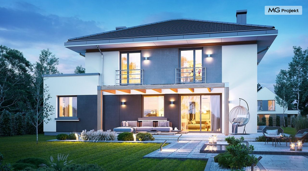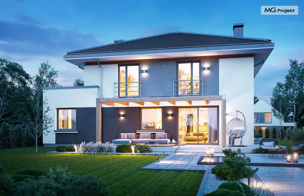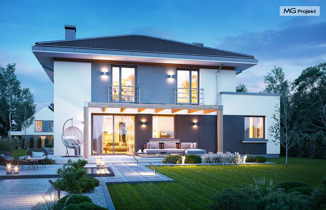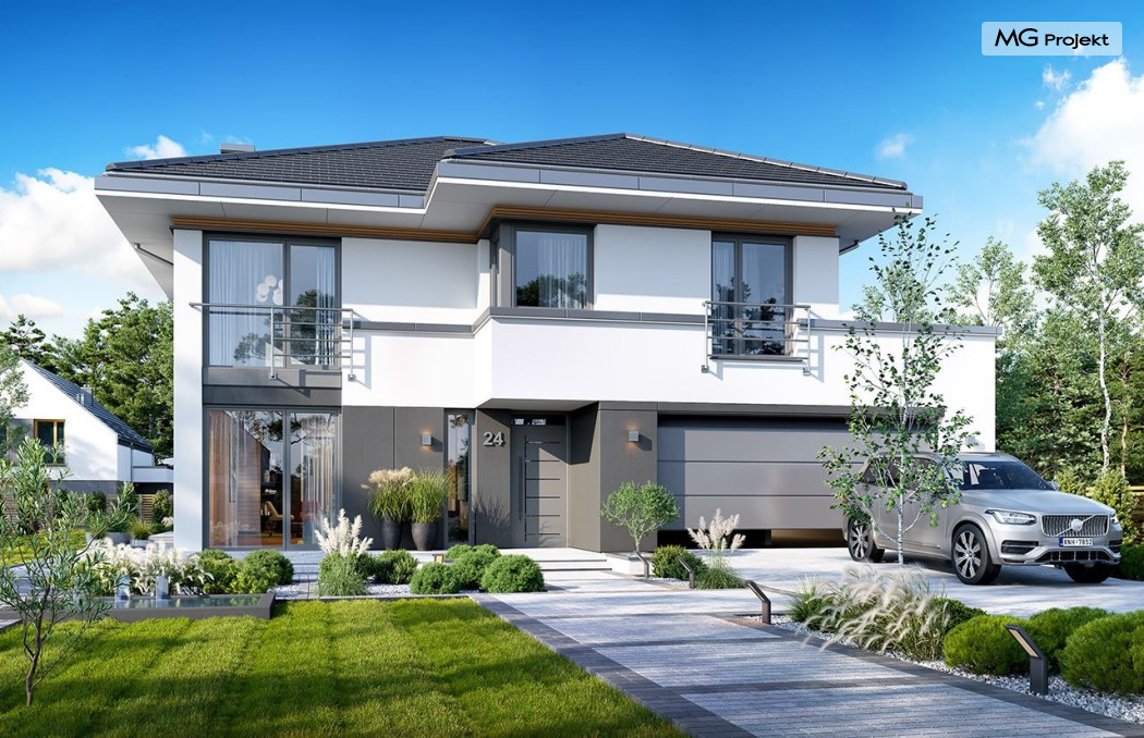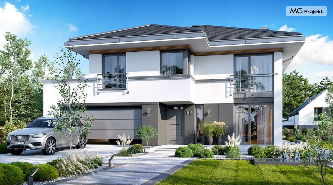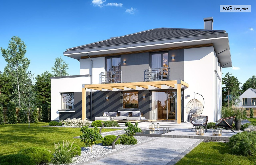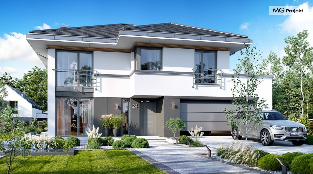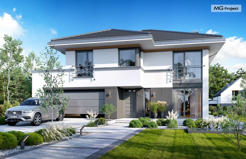 Projekt domu Tytan 6 jest nową wersją wariantową projektu z popularnej serii „Tytanów”. Budynek jednorodzinny, piętrowy, zbudowany na planie prostokąta, przykryty czterospadowym dachem o kącie nachylenia 25 stopni, z fragmentem płaskiego dachu nad częścią garażową ( dach lub taras ). Architektura willi utrzymana jest nowoczesnej stylistyce, z elewacjami podzielonymi poziomymi pasami, z kontrastującymi fragmentami szarych ścian, z szarą stolarką okienną i grafitowym dachem. Duże okna otwierające wnętrze na ogród, oraz dwukolorowe elewacje dają sylwetce domu dynamiczny i nowoczesny wygląd miejskiej willi. Front budynku ozdabiają reprezentacyjne drzwi wejściowe z naświetlem w podcieniu z wyciętego narożnika bryły. Od strony ogrodu główną rolę gra szerokie przeszklone wyjście z salonu na taras i zadaszenie tarasu w postaci pergoli, która może być częściowo lub w całości przykryta szkłem, albo materiałowym żaglem, lub nowoczesną sterowaną tarasolą. Całość domu skomponowana została tak, aby przypominał nowoczesne europejskie miejskie wille o nowoczesnej stylistyce. Tytan 6 ma niewielką szerokość elewacji frontowej, oraz niedużą powierzchnię zabudowy, dzięki czemu zmieści się na wąskiej parceli. Dzięki zaprojektowaniu części dziennej z oknami zarówno od ogrodu jak i od frontu, dom doskonale wkomponuje się w działkę z wjazdem od północy jak i od południa.Wnętrze domu podzielono na części : dzienną na parterze i nocną z sypialniami na piętrze. Na dolnej kondygnacji mamy jedną otwartą przestrzeń holu, salonu i jadalni, z częściowo oddzieloną kuchnią ze spiżarnią. Z przedsionka przechodzimy do dwustanowiskowego garażu i kotłowni. Z korytarza przy schodach przechodzimy do wc z prysznicem i dodatkowego pokoju – gabinetu. Na piętrze mieszczą się 4 sypialnie i dwie łazienki, w tym oddzielna cześć państwa domu z własną łazienką i bardzo ładną garderobą. Konstrukcja budynku jest dość prosta i łatwa w budowie. W domu zastosowano nowoczesne energooszczędne materiały i instalacje, które obniżą koszty utrzymania. Tytan 6 to idealna propozycja dla osób marzących o nowoczesnym, komfortowym, energooszczędnym domu jednorodzinnym, o sensownej wielkości i skali, zaprojektowanym w nowoczesnej stylistyce, z zachowaniem tradycyjnej bryły ze spadzistym dachem. W łatwy sposób można go przystosować do standardu NF40. Zapraszamy do zapoznania się z pełną ofertą pracowni MG Projekt: projekt domu Tytan, projekt domu Tytan 2, projekt domu Tytan 2B, projekt domu Tytan 3, projekt domu Tytan 4, projekt domu Tytan 5. Projekty są również dostępne w odbiciu lustrzanym.
