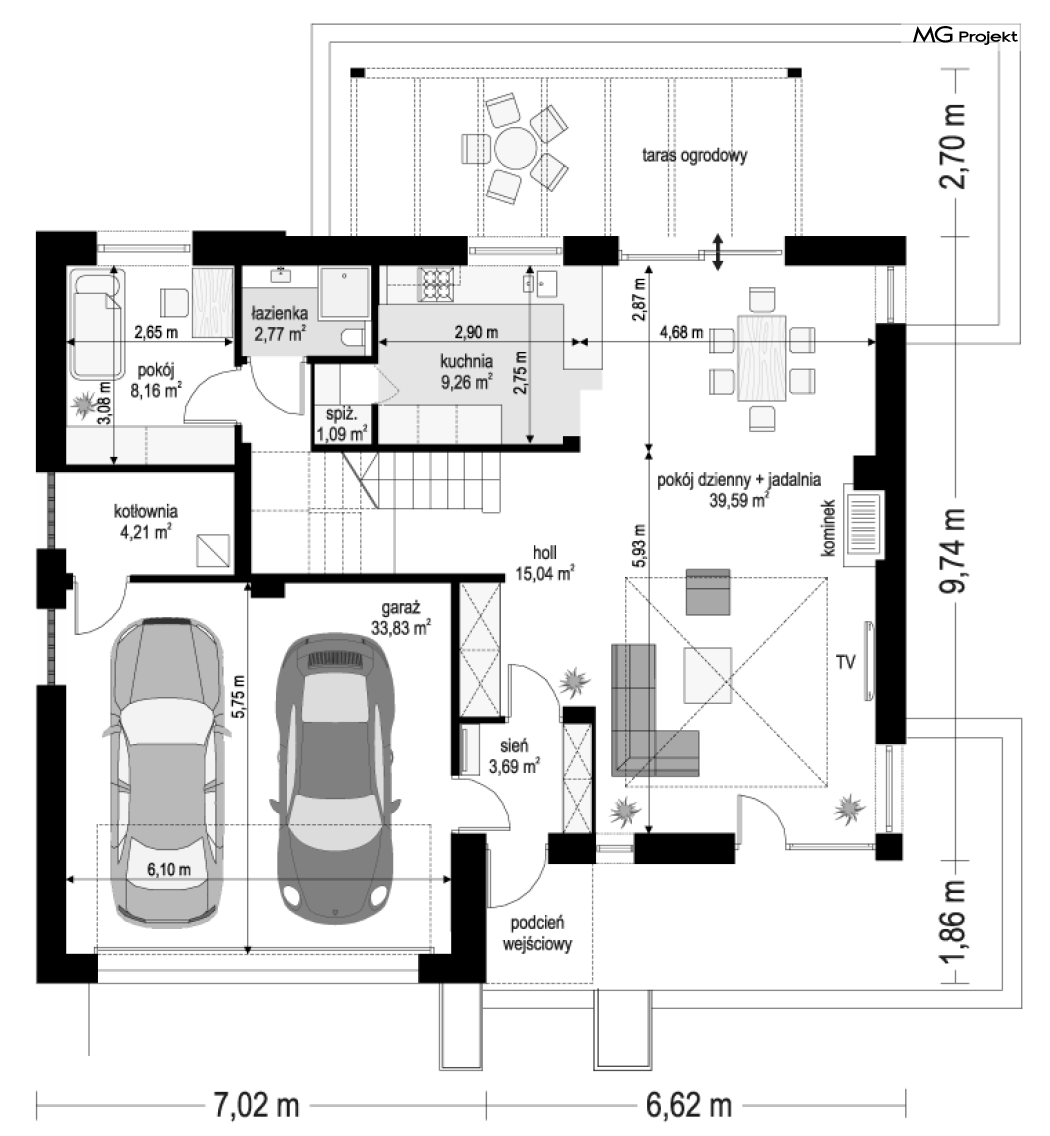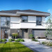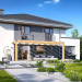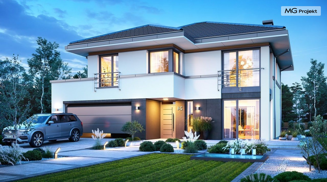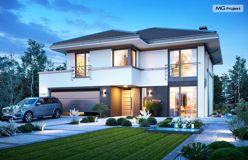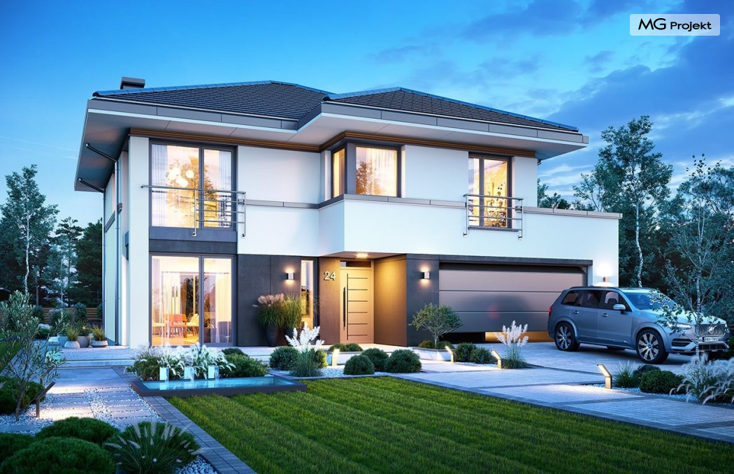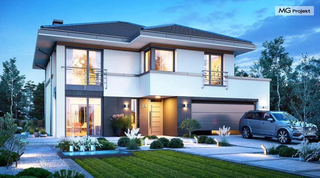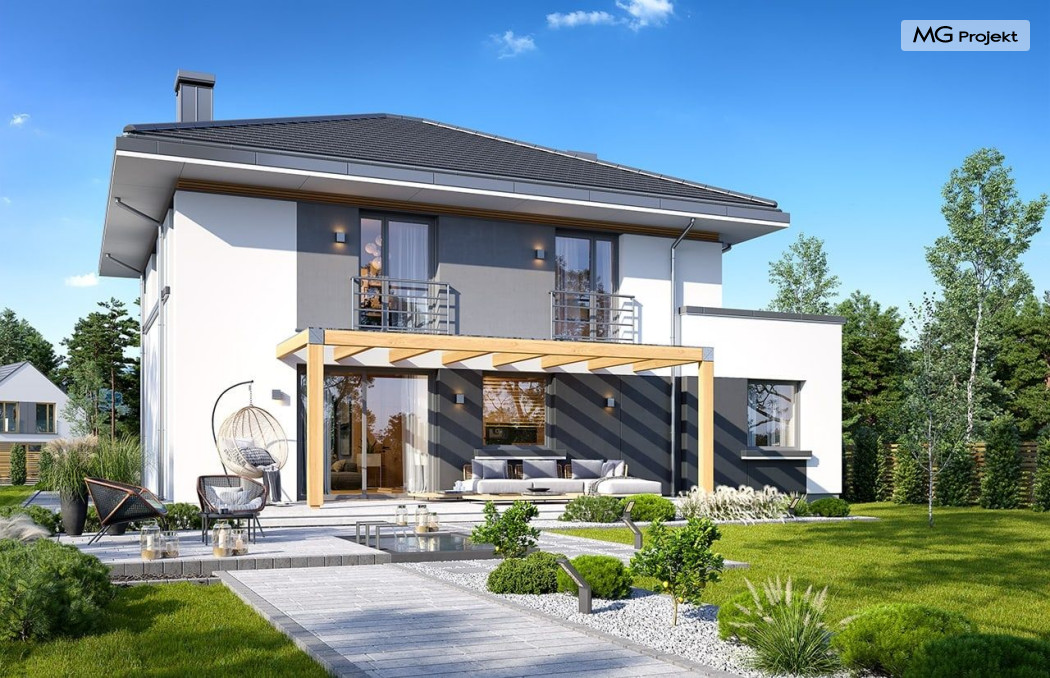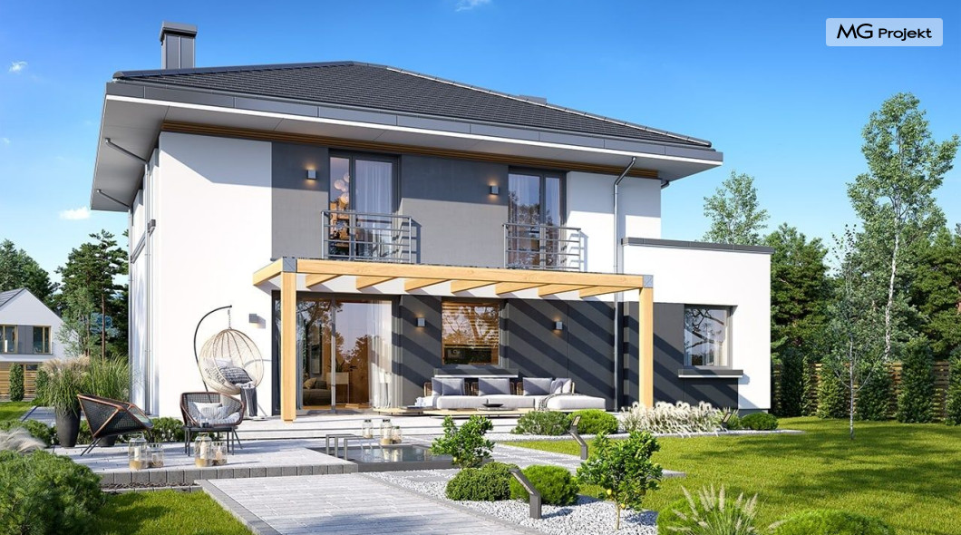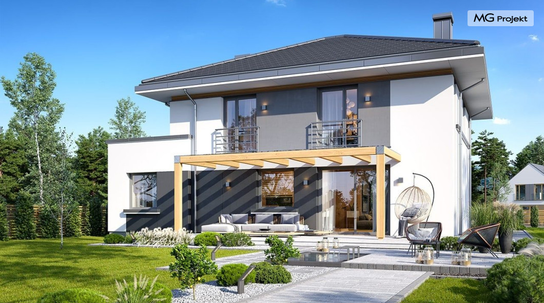 Projekt domu Tytan 6 jest nową wersją wariantową projektu z popularnej serii „Tytanów”. Budynek jednorodzinny, piętrowy, zbudowany na planie prostokąta, przykryty czterospadowym dachem o kącie nachylenia 25 stopni, z fragmentem płaskiego dachu nad częścią garażową ( dach lub taras ). Architektura willi utrzymana jest nowoczesnej stylistyce, z elewacjami podzielonymi poziomymi pasami, z kontrastującymi fragmentami szarych ścian, z szarą stolarką okienną i grafitowym dachem. Duże okna otwierające wnętrze na ogród, oraz dwukolorowe elewacje dają sylwetce domu dynamiczny i nowoczesny wygląd miejskiej willi. Front budynku ozdabiają reprezentacyjne drzwi wejściowe z naświetlem w podcieniu z wyciętego narożnika bryły. Od strony ogrodu główną rolę gra szerokie przeszklone wyjście z salonu na taras i zadaszenie tarasu w postaci pergoli, która może być częściowo lub w całości przykryta szkłem, albo materiałowym żaglem, lub nowoczesną sterowaną tarasolą. Całość domu skomponowana została tak, aby przypominał nowoczesne europejskie miejskie wille o nowoczesnej stylistyce. Tytan 6 ma niewielką szerokość elewacji frontowej, oraz niedużą powierzchnię zabudowy, dzięki czemu zmieści się na wąskiej parceli. Dzięki zaprojektowaniu części dziennej z oknami zarówno od ogrodu jak i od frontu, dom doskonale wkomponuje się w działkę z wjazdem od północy jak i od południa.Wnętrze domu podzielono na części : dzienną na parterze i nocną z sypialniami na piętrze. Na dolnej kondygnacji mamy jedną otwartą przestrzeń holu, salonu i jadalni, z częściowo oddzieloną kuchnią ze spiżarnią. Z przedsionka przechodzimy do dwustanowiskowego garażu i kotłowni. Z korytarza przy schodach przechodzimy do wc z prysznicem i dodatkowego pokoju – gabinetu. Na piętrze mieszczą się 4 sypialnie i dwie łazienki, w tym oddzielna cześć państwa domu z własną łazienką i bardzo ładną garderobą. Konstrukcja budynku jest dość prosta i łatwa w budowie. W domu zastosowano nowoczesne energooszczędne materiały i instalacje, które obniżą koszty utrzymania. Tytan 6 to idealna propozycja dla osób marzących o nowoczesnym, komfortowym, energooszczędnym domu jednorodzinnym, o sensownej wielkości i skali, zaprojektowanym w nowoczesnej stylistyce, z zachowaniem tradycyjnej bryły ze spadzistym dachem. W łatwy sposób można go przystosować do standardu NF40. Zapraszamy do zapoznania się z pełną ofertą pracowni MG Projekt: projekt domu Tytan, projekt domu Tytan 2, projekt domu Tytan 2B, projekt domu Tytan 3, projekt domu Tytan 4, projekt domu Tytan 5. Projekty są również dostępne w odbiciu lustrzanym.