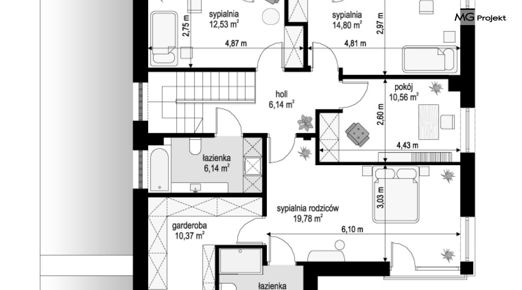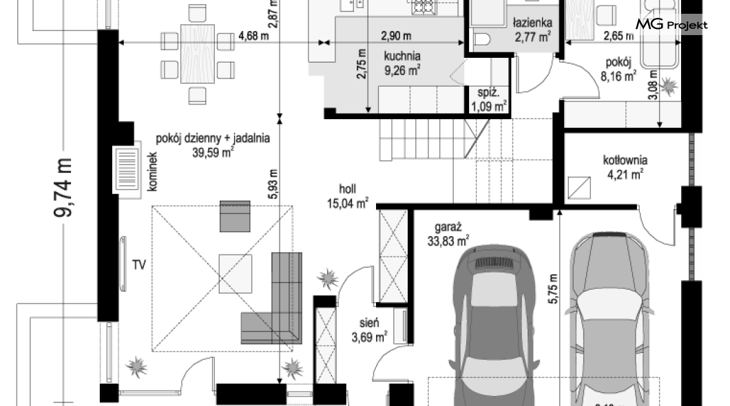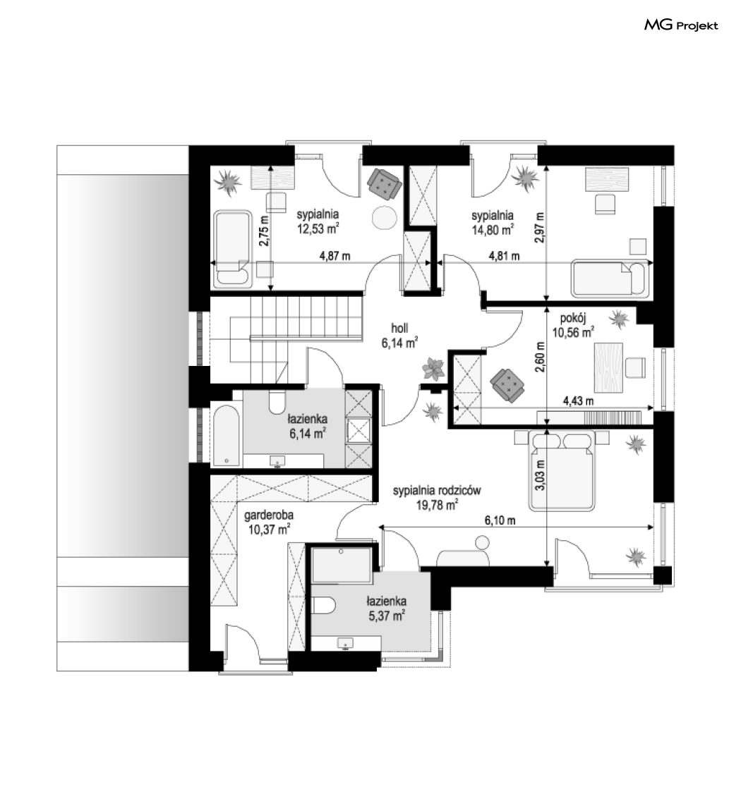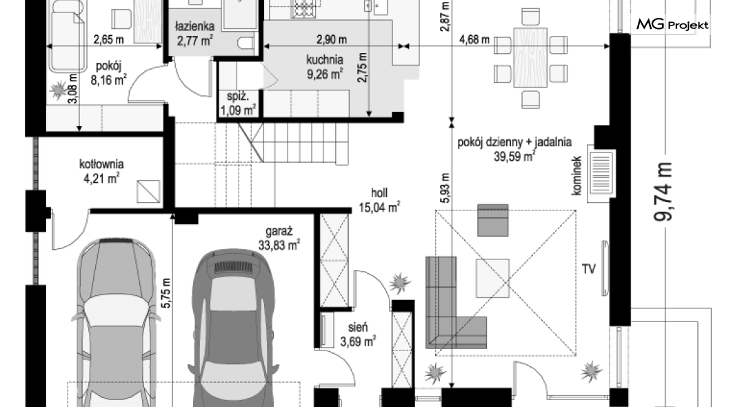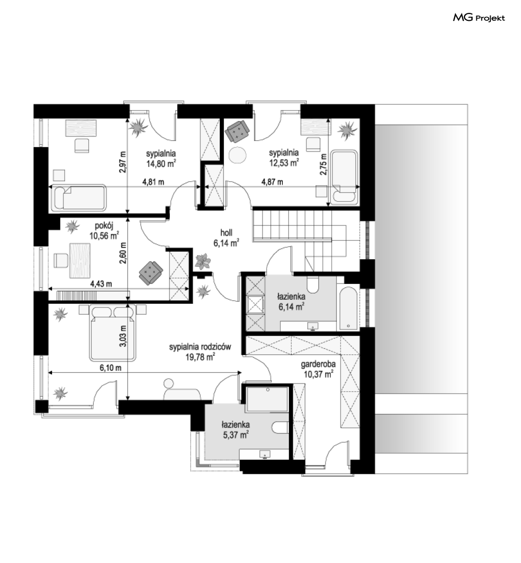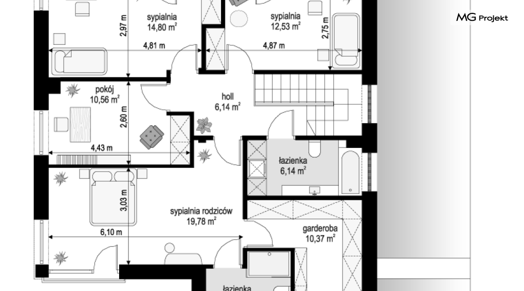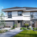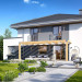 Projekt domu Tytan 6 jest nową wersją wariantową projektu z popularnej serii „Tytanów”. Budynek jednorodzinny, piętrowy, zbudowany na planie prostokąta, przykryty czterospadowym dachem o kącie nachylenia 25 stopni, z fragmentem płaskiego dachu nad częścią garażową ( dach lub taras ). Architektura willi utrzymana jest nowoczesnej stylistyce, z elewacjami podzielonymi poziomymi pasami, z kontrastującymi fragmentami szarych ścian, z szarą stolarką okienną i grafitowym dachem. Duże okna otwierające wnętrze na ogród, oraz dwukolorowe elewacje dają sylwetce domu dynamiczny i nowoczesny wygląd miejskiej willi. Front budynku ozdabiają reprezentacyjne drzwi wejściowe z naświetlem w podcieniu z wyciętego narożnika bryły. Od strony ogrodu główną rolę gra szerokie przeszklone wyjście z salonu na taras i zadaszenie tarasu w postaci pergoli, która może być częściowo lub w całości przykryta szkłem, albo materiałowym żaglem, lub nowoczesną sterowaną tarasolą. Całość domu skomponowana została tak, aby przypominał nowoczesne europejskie miejskie wille o nowoczesnej stylistyce. Tytan 6 ma niewielką szerokość elewacji frontowej, oraz niedużą powierzchnię zabudowy, dzięki czemu zmieści się na wąskiej parceli. Dzięki zaprojektowaniu części dziennej z oknami zarówno od ogrodu jak i od frontu, dom doskonale wkomponuje się w działkę z wjazdem od północy jak i od południa.Wnętrze domu podzielono na części : dzienną na parterze i nocną z sypialniami na piętrze. Na dolnej kondygnacji mamy jedną otwartą przestrzeń holu, salonu i jadalni, z częściowo oddzieloną kuchnią ze spiżarnią. Z przedsionka przechodzimy do dwustanowiskowego garażu i kotłowni. Z korytarza przy schodach przechodzimy do wc z prysznicem i dodatkowego pokoju – gabinetu. Na piętrze mieszczą się 4 sypialnie i dwie łazienki, w tym oddzielna cześć państwa domu z własną łazienką i bardzo ładną garderobą. Konstrukcja budynku jest dość prosta i łatwa w budowie. W domu zastosowano nowoczesne energooszczędne materiały i instalacje, które obniżą koszty utrzymania. Tytan 6 to idealna propozycja dla osób marzących o nowoczesnym, komfortowym, energooszczędnym domu jednorodzinnym, o sensownej wielkości i skali, zaprojektowanym w nowoczesnej stylistyce, z zachowaniem tradycyjnej bryły ze spadzistym dachem. W łatwy sposób można go przystosować do standardu NF40. Zapraszamy do zapoznania się z pełną ofertą pracowni MG Projekt: projekt domu Tytan, projekt domu Tytan 2, projekt domu Tytan 2B, projekt domu Tytan 3, projekt domu Tytan 4, projekt domu Tytan 5. Projekty są również dostępne w odbiciu lustrzanym.