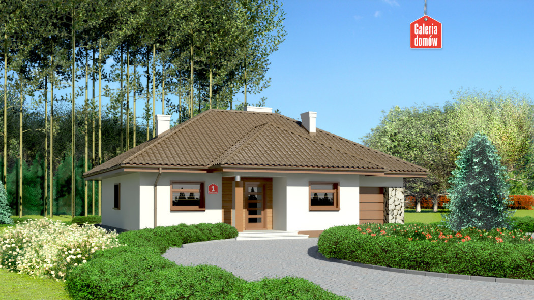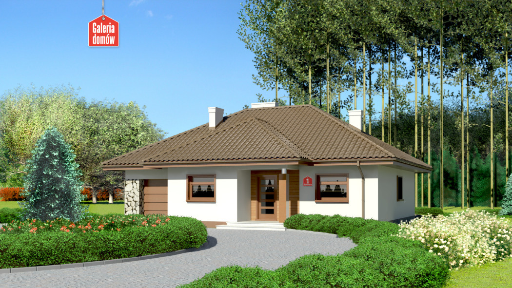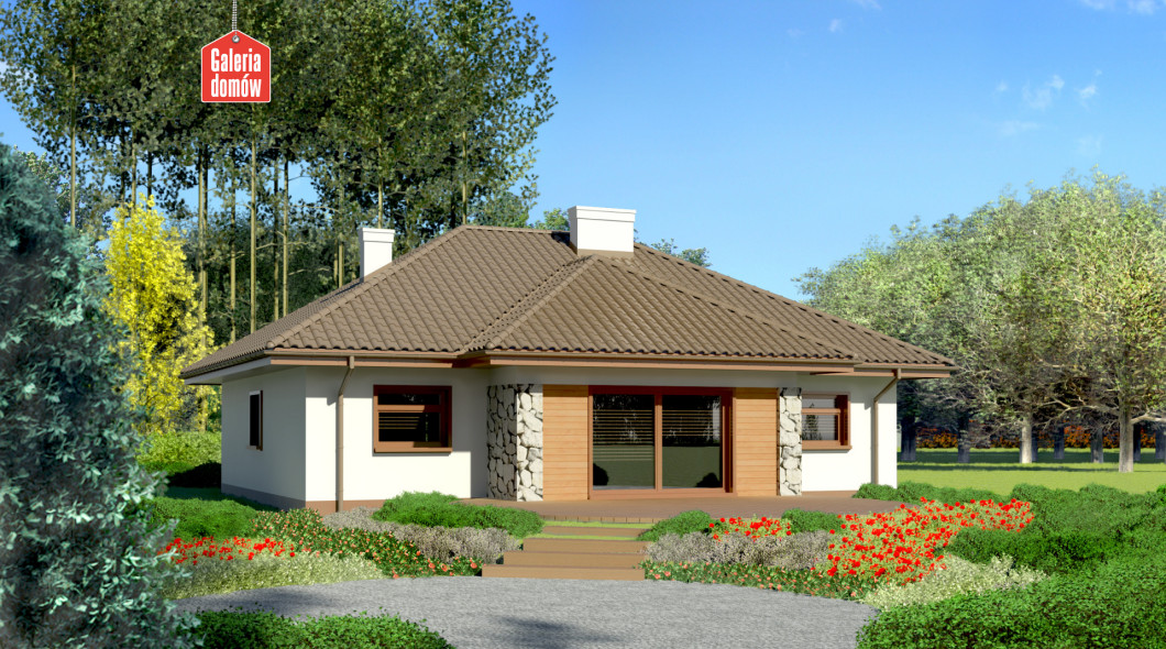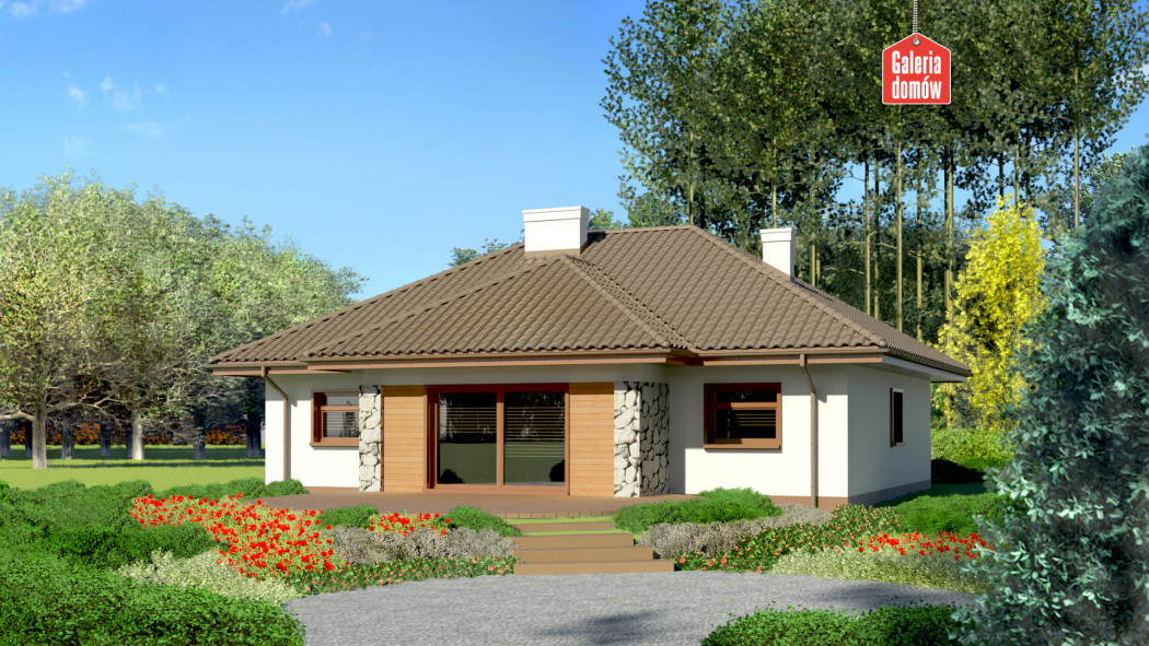 Nowoczesny dom parterowy z garażem, zaprojektowany z myślą o czteroosobowej rodzinie lubiącej kontakt z naturą. Okładziny z kamienia oraz drewniane panele na elewacjach kontrastujące z białym tynkiem nadają mu elegancki wygląd. Jasny i przestronny salon z kominkiem i z wyjściem do ogrodu to miejsce do wspólnego spędzania czasu przez wszystkich domowników. Wydzielenie części gospodarczej pozwala na idealny komfort użytkowania. To propozycja dla osób ceniących funkcjonalne rozwiązania.