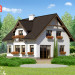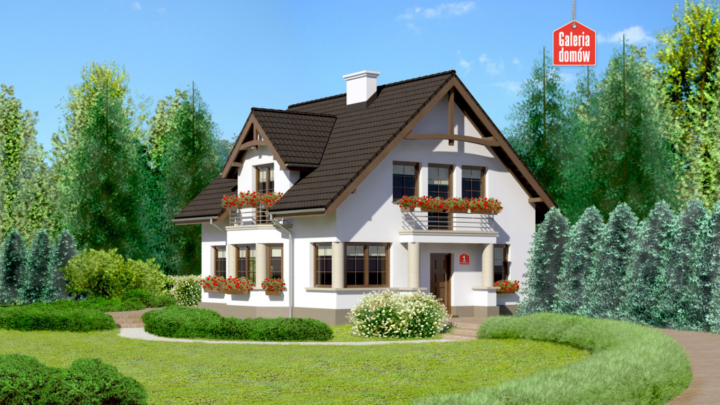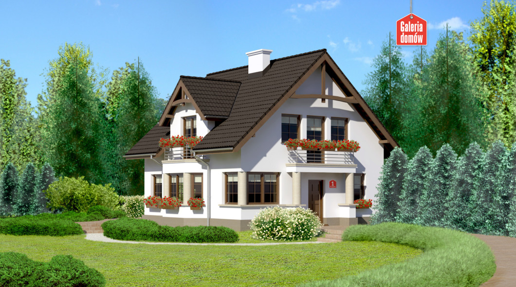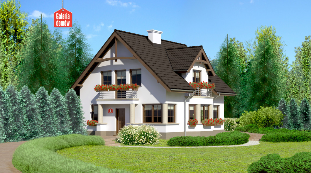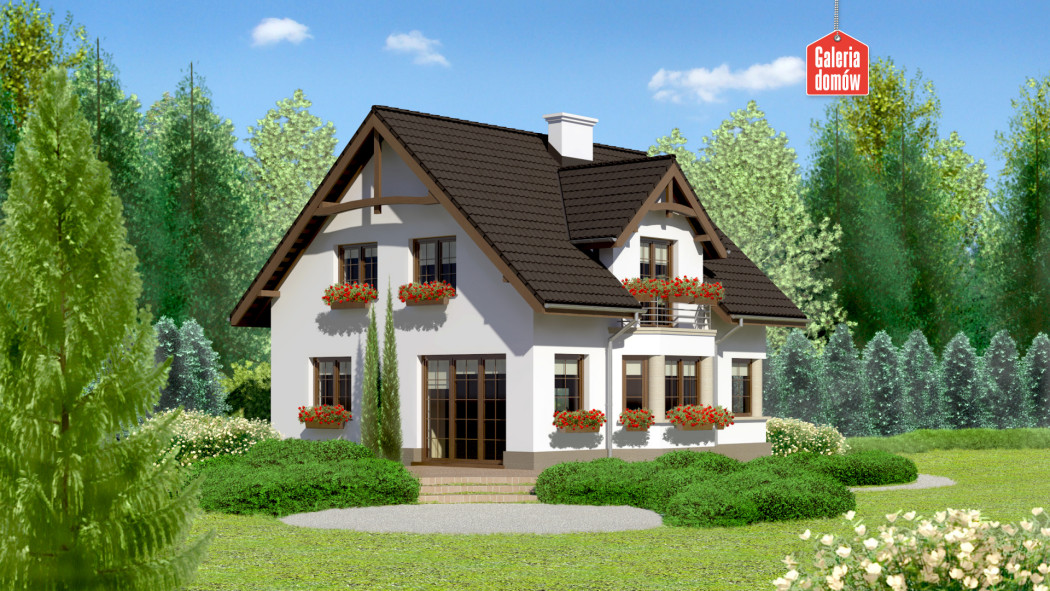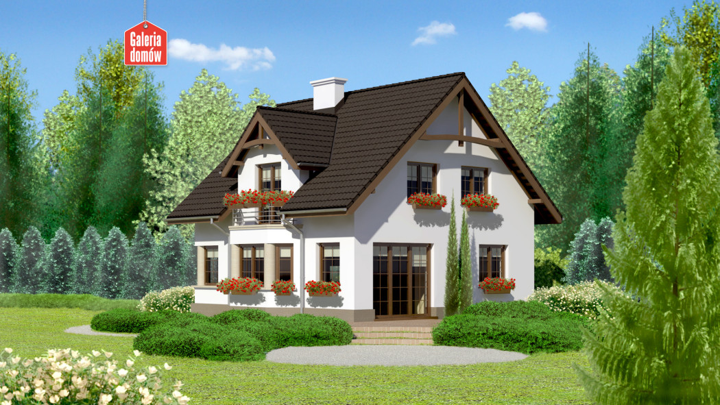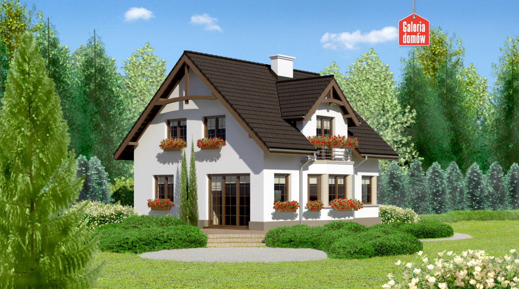Niewielki dom z użytkowym poddaszem, przyjazny kilkuosobowej rodzinie. Jest tradycyjny i ekonomiczny, a przy tym po prostu ładny: biała elewacja w połączeniu z ciemnym dachem zawsze wygląda świeżo. Wejście domu zostało zadaszone balkonem wspartym na kolumnach. Drugi balkon znajduje się nad przeszklonym wykuszem. Stylowy charakter podkreślają szprosy w oknach. Salon połączony z jadalnią, kuchnią i częścią holu tworzy przestronną część dzienną domu. Dodatkowy pokój na parterze może pełnić funkcję gabinetu lub pracowni. Poddasze zaprojektowano tak, aby każdy z domowników miał swoją prywatną przestrzeń. Znajdują się tu trzy sypialnie i łazienka.