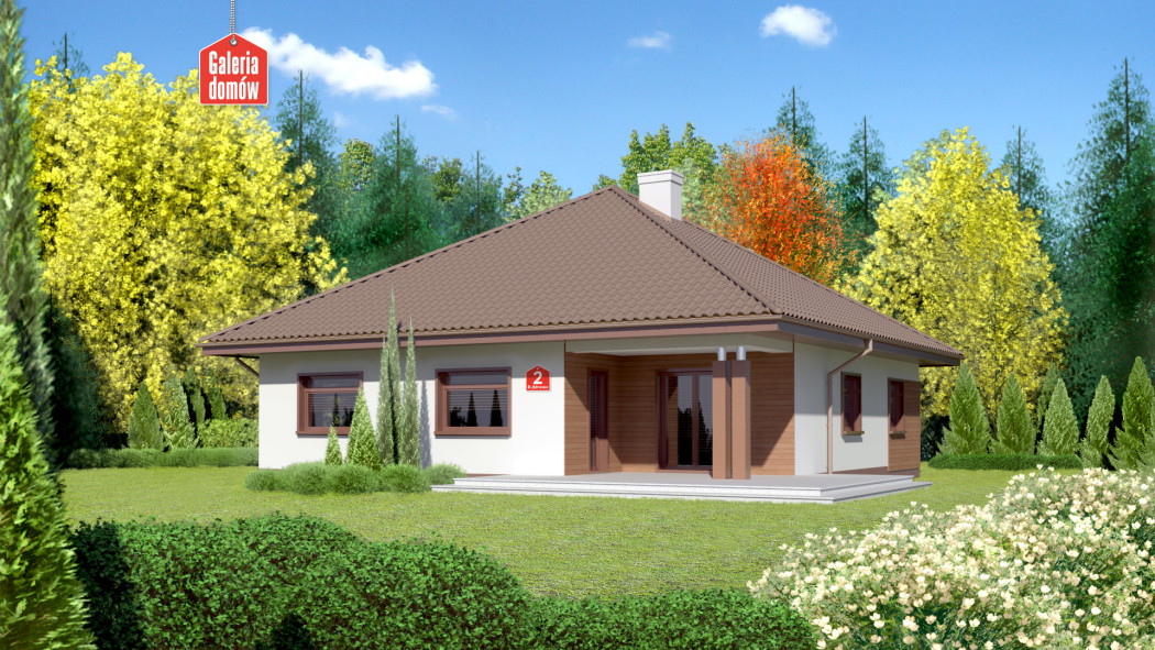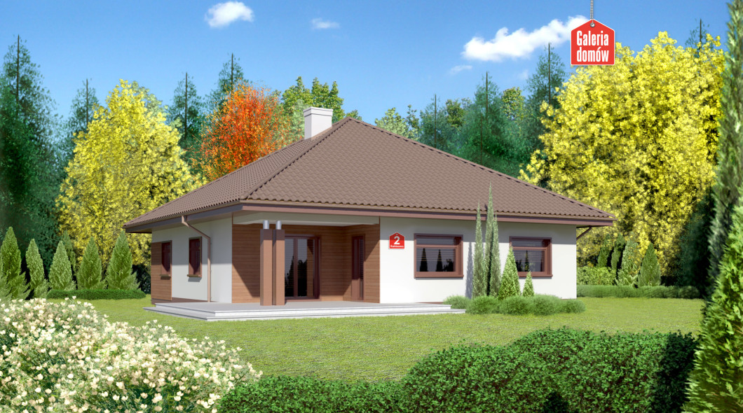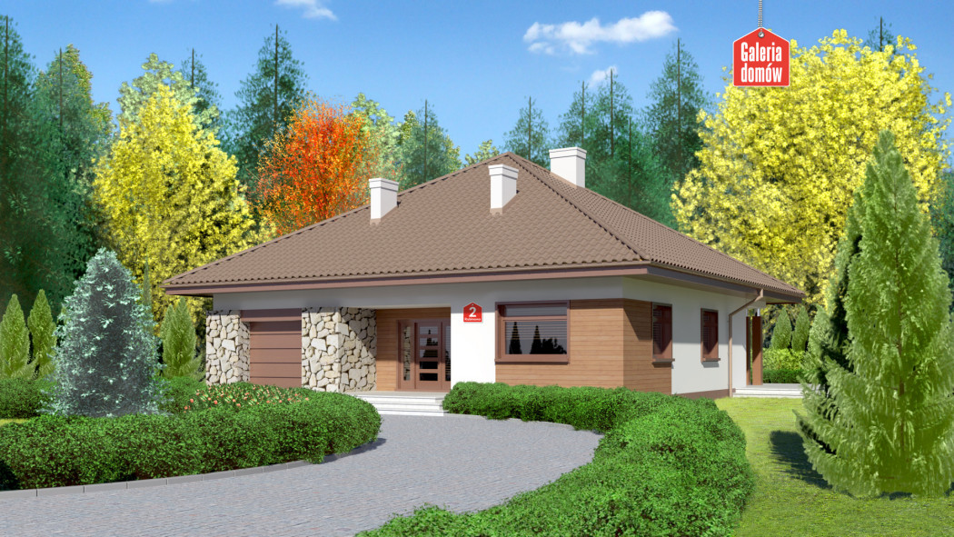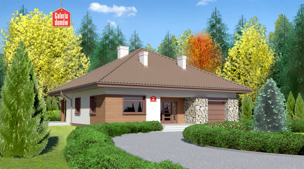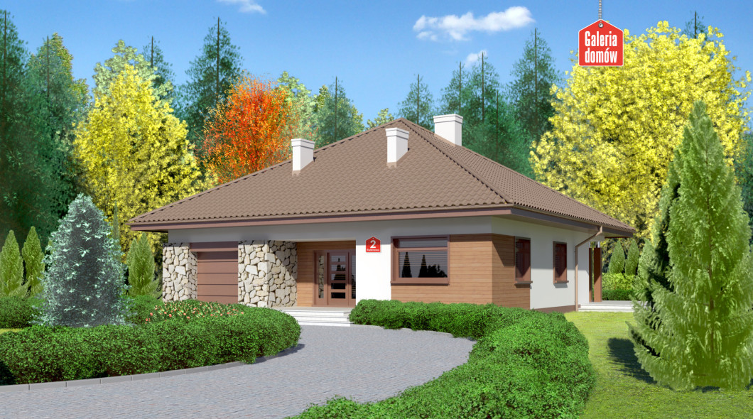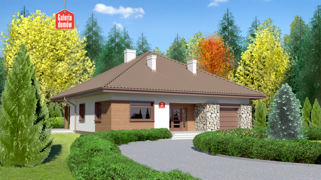 Dom przy Rubinowej 2 to ciekawy dom parterowy z garażem. Prosta bryła na planie kwadratu przykryta czterospadowym dachem. Wejście zaakcentowane podcieniem. Jasny tynk oraz okładziny z drewna i kamienia na elewacjach podkreślają nowoczesny charakter budynku. Wewnątrz zadbano o czytelny i funkcjonalny układ pomieszczeń. Strefa dzienna to przestronny salon z kominkiem i wyjściem na taras oraz częściowo otwarta kuchnia. W wydzielonej strefie nocnej znajdują się trzy wygodne sypialnie i komfortowa łazienka. To idealna propozycja dla osób praktycznych, szukających sprawdzonych rozwiązań.