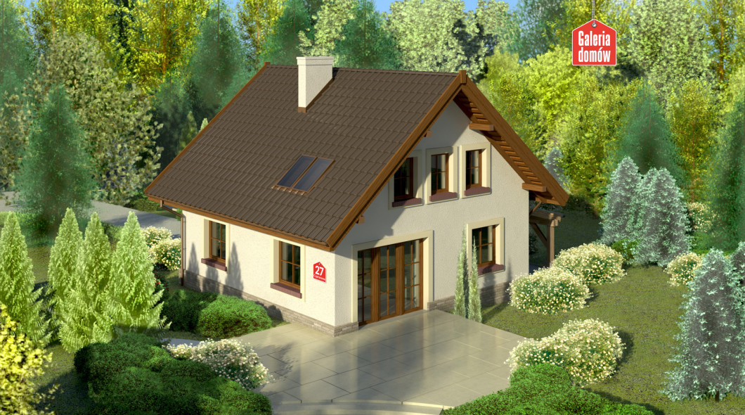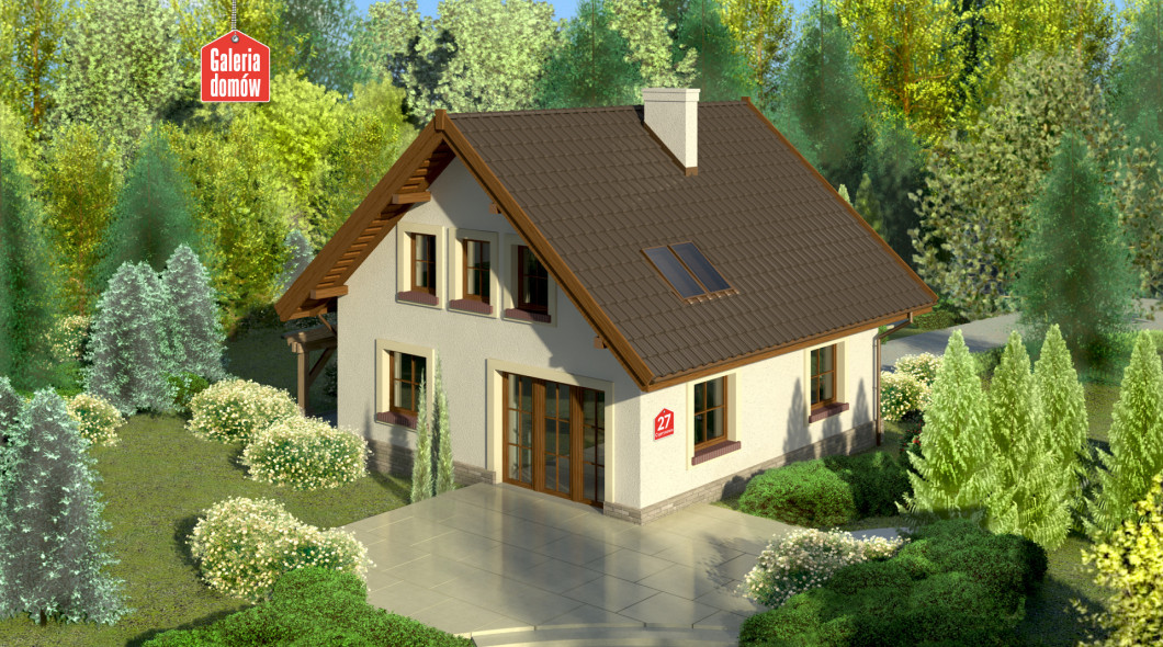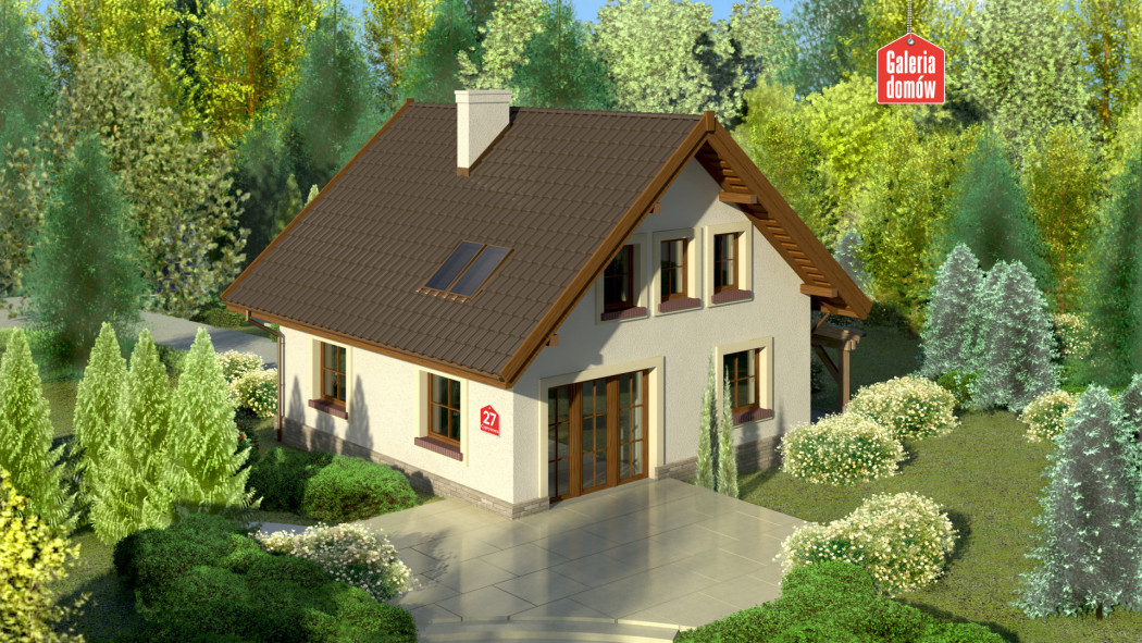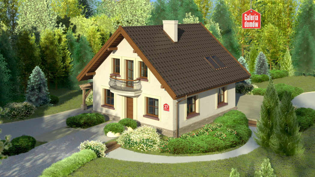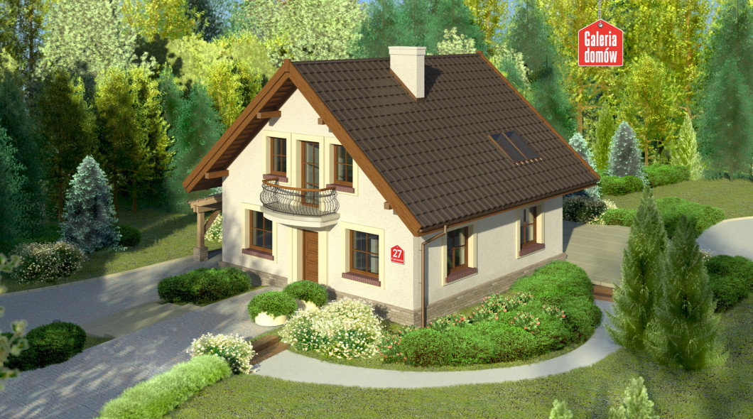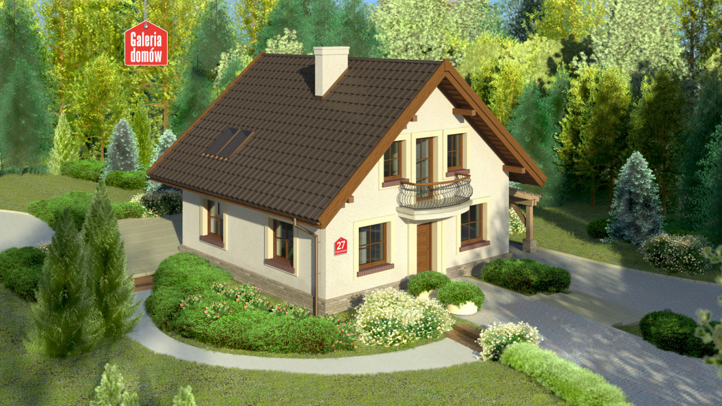Tradycyjny dom z dwuspadowym dachem i wiatą garażową. Bryłę budynku urozmaica półokrągły balkon nad wejściem, wykończony romantyczną balustradą z kutego żelaza. Ciepła kolorystyka i subtelne dodatki na elewacjach podkreślają jego spokojny charakter. Dom, choć z zewnątrz nie wygląda na duży, wewnątrz mieści zaskakująco bogaty program funkcjonalny. Komfort użytkowania zapewnia przejrzysty podział na część dzienną i nocną. Dom przeznaczony jest dla cztero- lub pięcioosobowej rodziny.