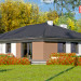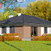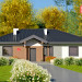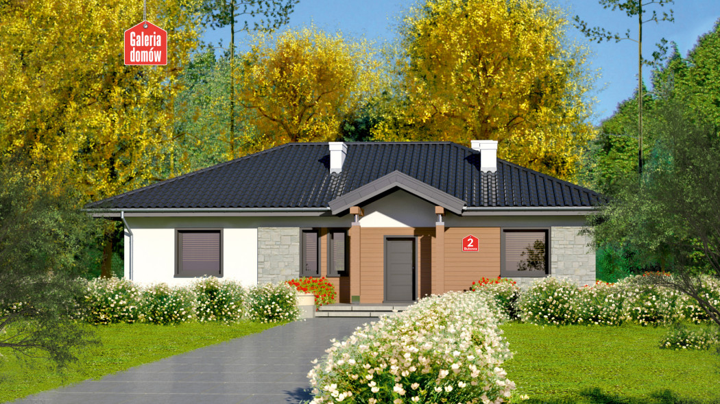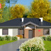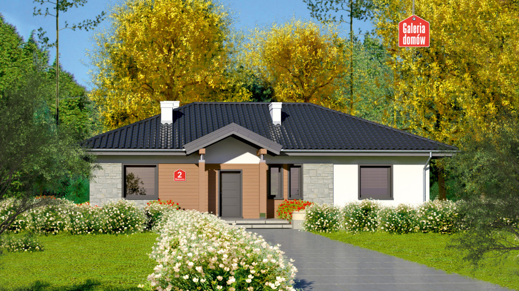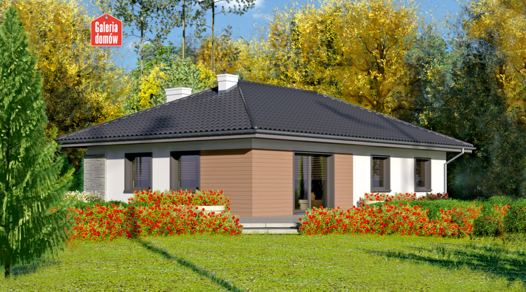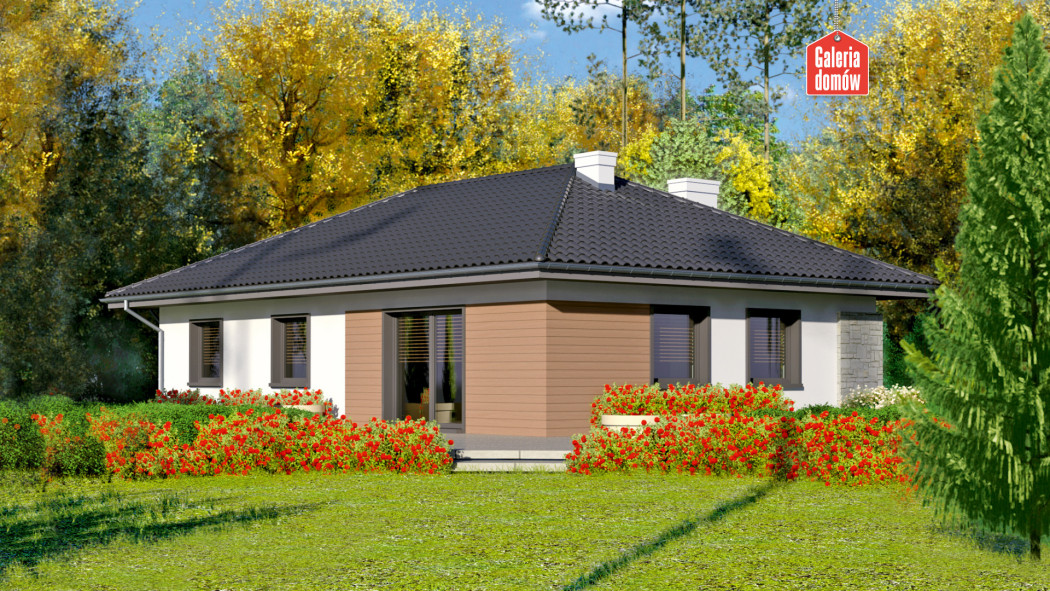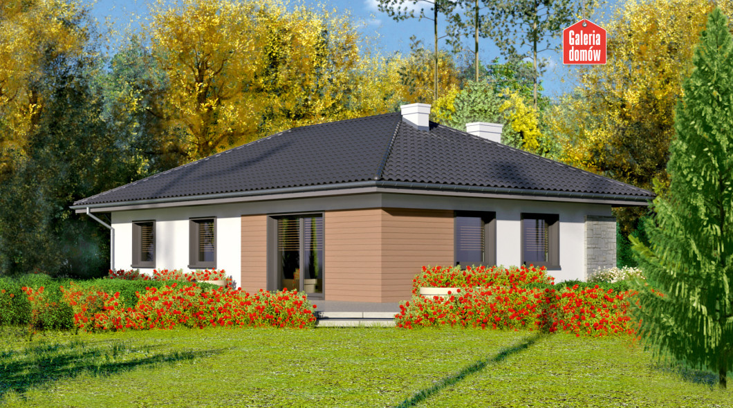 Idealna propozycja dla osób szukających niewielkiego i funkcjonalnego domu parterowego. Zwarta bryła na planie prostokąta przykryta została prostym kopertowym dachem. Urozmaiceniem jest daszek nad wejściem. Elewacja z kilku rodzajów materiału w stonowanej kolorystyce podkreśla nowoczesny charakter domu. Duże przeszklenia we wszystkich pomieszczeniach naturalnie doświetlają wnętrze. Wyraźnie zaznaczono symetryczny podział na część dzienną i nocną. Po prawej znajduje się przestronny pokój dzienny (z kominkiem i wyjściem do ogrodu) połączony z kuchnią. A po lewej cztery sypialnie i łazienka.