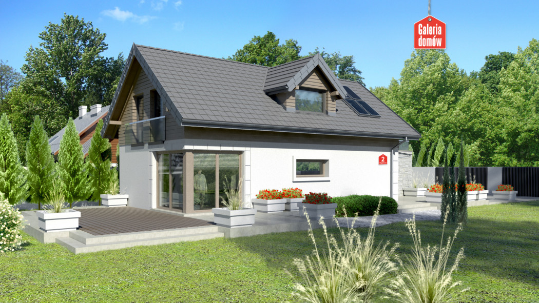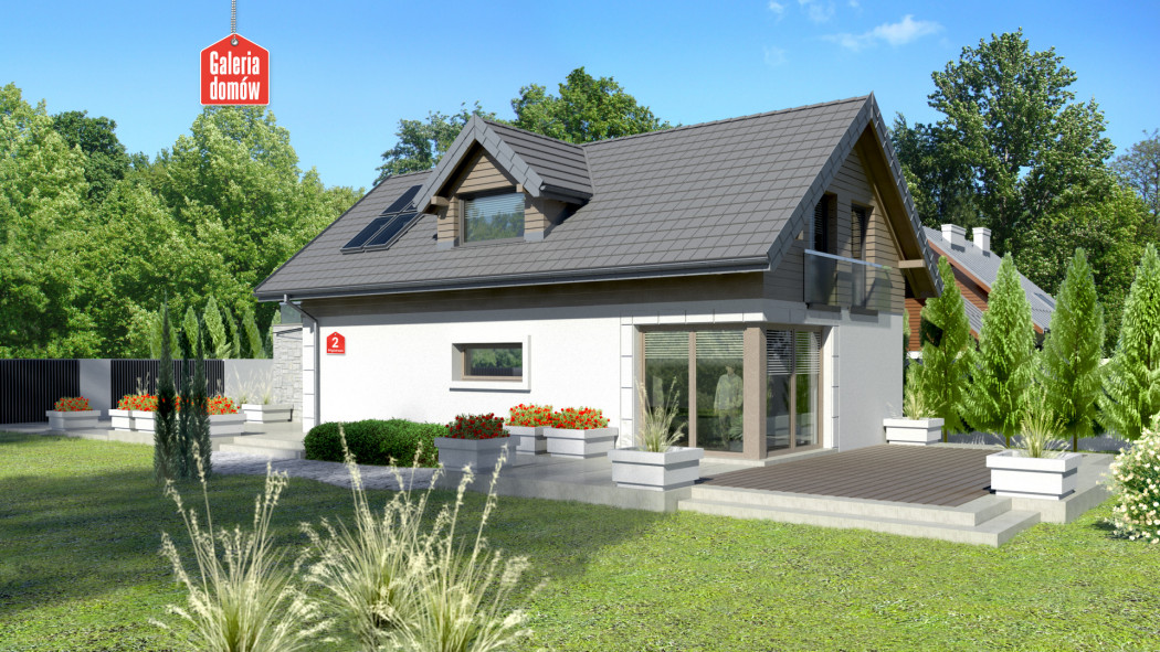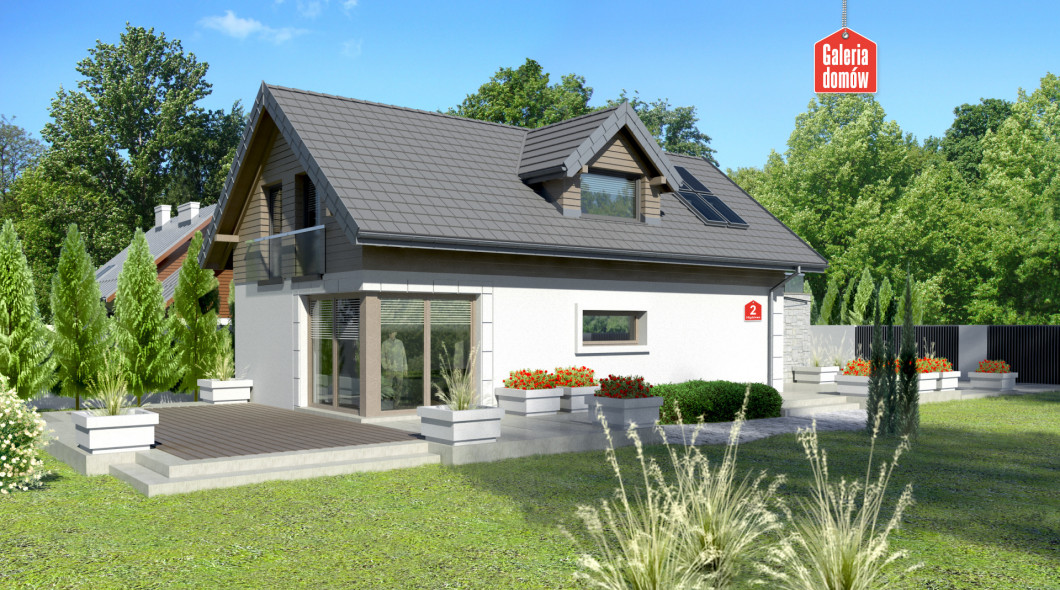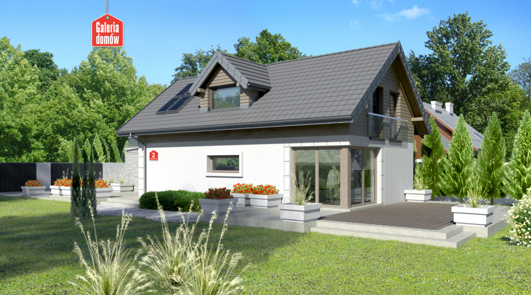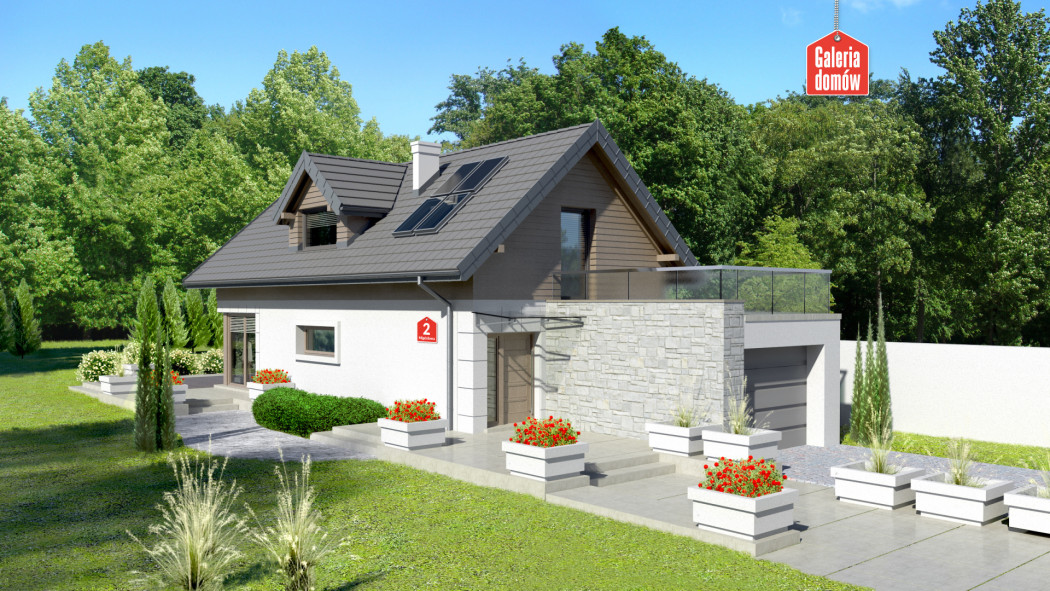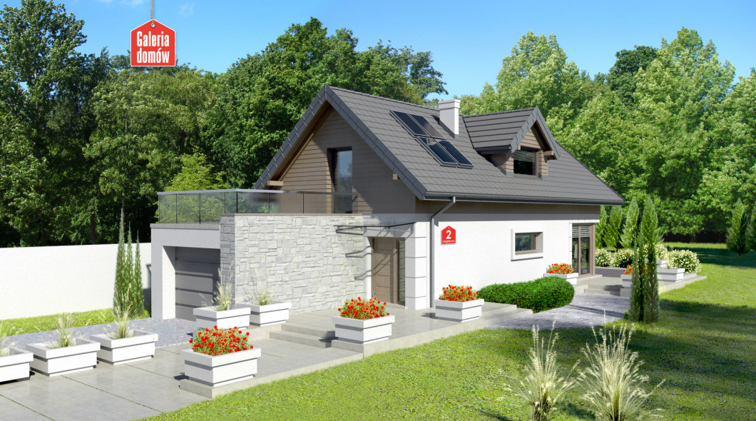Wąska działka i marzenia o nowoczesnym, funkcjonalnym domu? To możliwe! Propozycja Domu przy Migdałowej 2 pozwala na urządzenie tarasu nad garażem, co oszczędza koszty na drogim zadaszeniu. Jednocześnie umożliwia delektowanie się słońcem i świeżą kawą pitą pod chmurką. Pokój dzienny doświetla dodatkowe, narożne okno. Stonowana kolorystyka i materiał, z którego jest zbudowany – kamień i drewno, podkreśla styl i charakter budynku. Ciekawym pomysłem jest zamontowanie kolektorów słonecznych na dachu. Na stosunkowo niedużej przestrzeni znalazły się ciekawe rozwiązania, które spodobają się wszystkim tym, którzy chcą mieszkać wyjątkowo i poszukują nowatorskich rozwiązań.