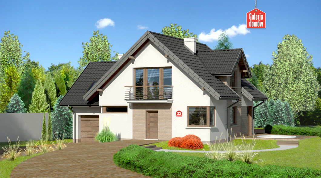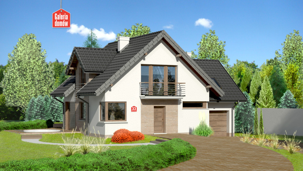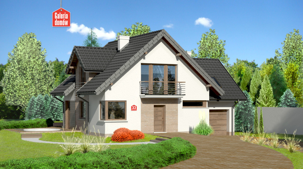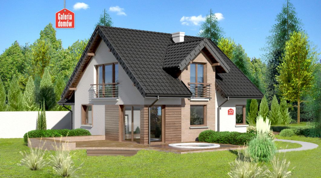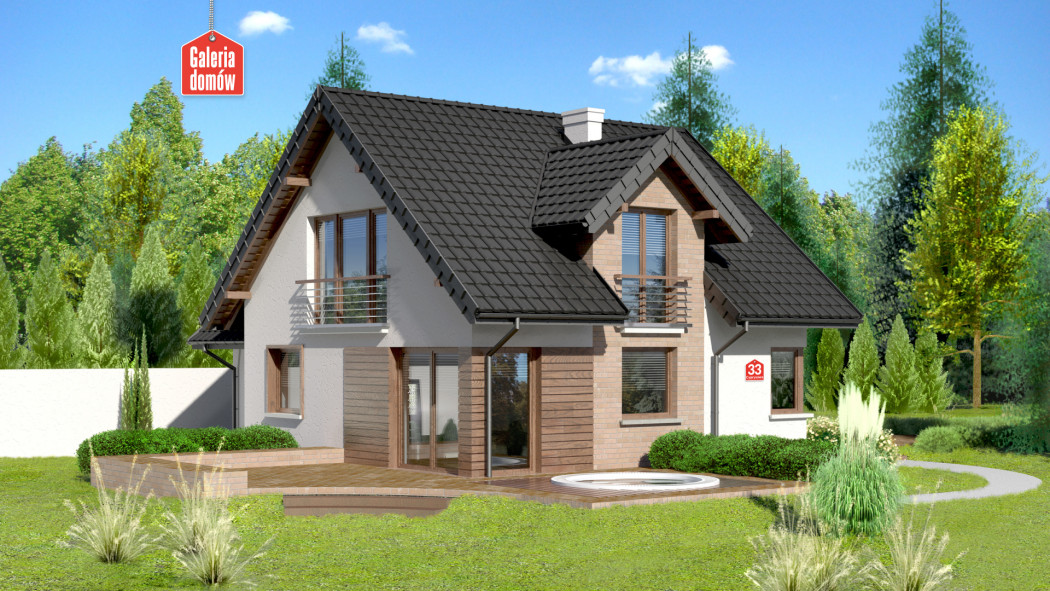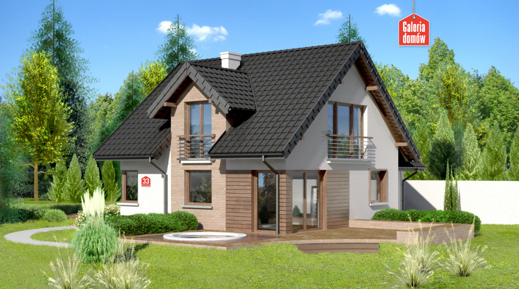 Dom przy Cyprysowej 33 to nasza propozycja projektowa dla miłośników domów o nowoczesnej nucie w architekturze. Przykładem tego może być zabawa z fakturą elewacji: umieszczenie na niej elementów paneli drewnianych, tynku, cegły (lub płytek klinkierowych). Atrybutami domu nowoczesnego są takie pomieszczenia jak kotłownia, spiżarnia, pralnia oraz duża sypialnia, w której z powodzeniem można zmieścić garderobę, a które znalazły swoje miejsce w tym projekcie. O ile na zewnątrz architekt eksponuje nowoczesny wygląd to program funkcjonalny wnętrza oparty jest na tradycyjnym podziale na część dzienną domu i umieszczoną na poddaszu część sypialną. Centralnym punktem domu jest pokój dzienny przeszklony z dwóch stron. Duże okna otwierają pomieszczenie na zewnątrz i dają poczucie obcowania z naturą. Projekt Domu przy Cyprysowej 33 to budynek z poddaszem i garażem o programie 6 pokojowym z otwartą kuchnią, rozplanowany na powierzchni użytkowej wynoszącej jedynie 114,77 m²!