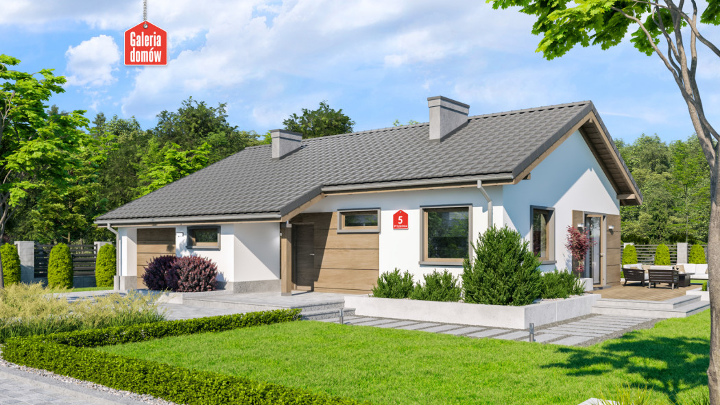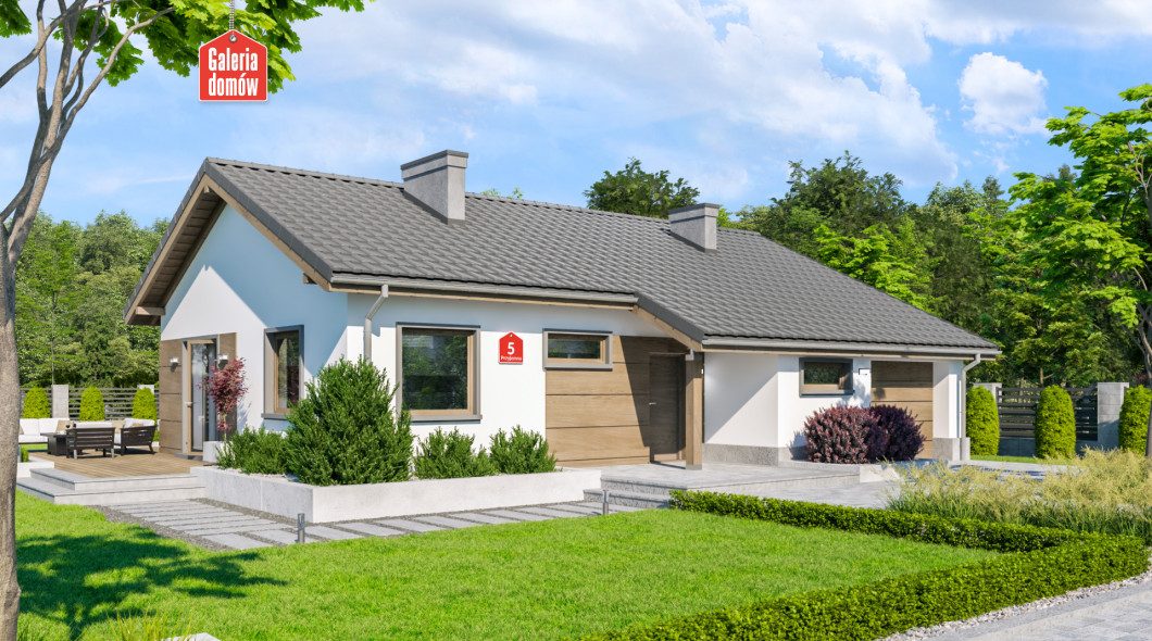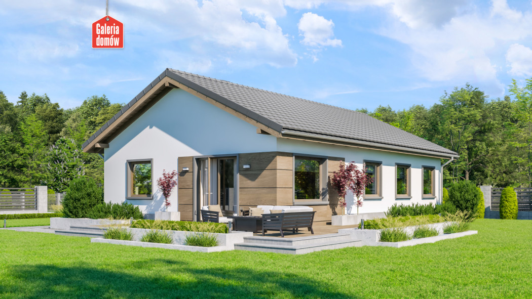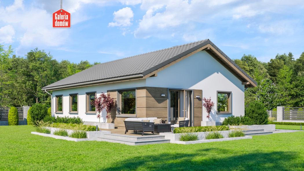 Niewielki dom parterowy z dachem dwuspadowym. Połączenie ekonomicznych rozwiązań z praktyczną wygodą użytkowania. Idealna propozycja dla czteroosobowej rodziny. Prosta bryła oraz jasna kolorystyka elewacji i drewniane okładziny powodują, że dom z zewnątrz wygląda przytulnie. Wnętrze rozplanowane jest bardzo funkcjonalnie - pokój dzienny z kominkiem i wyjściem do ogrodu, otwarta kuchnia ze spiżarnią, trzy sypialnie, łazienka, duża kotłownia i garaż jednostanowiskowy. Projekt dostępny również w wersji z dachem o kącie nachylenia 30°.