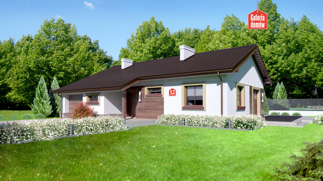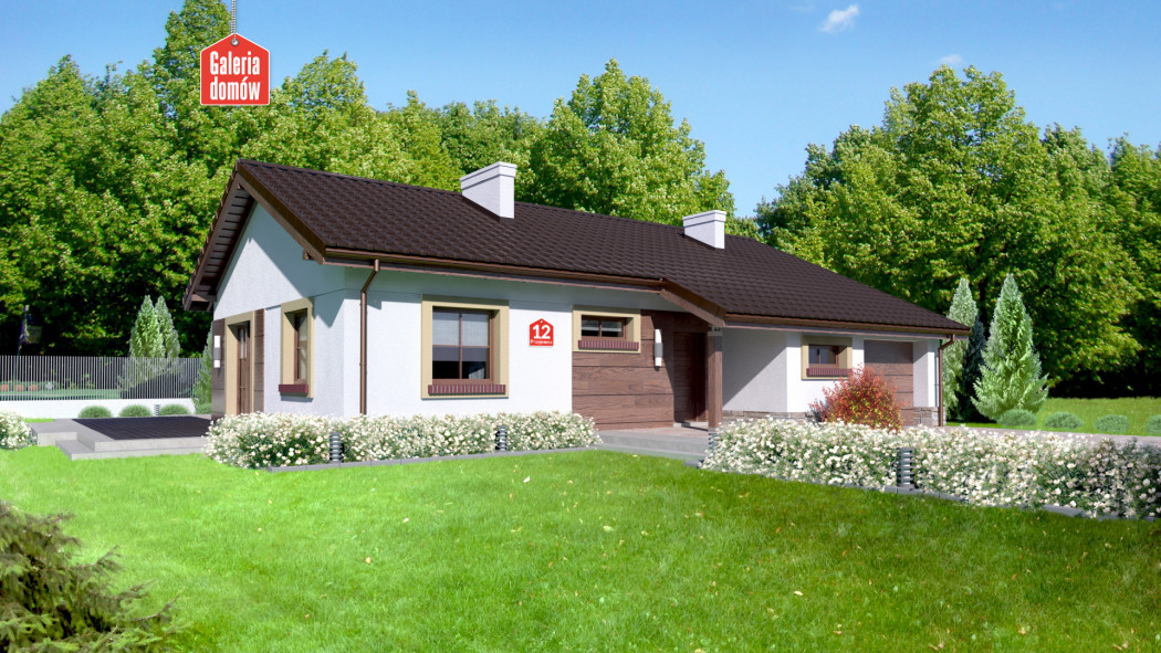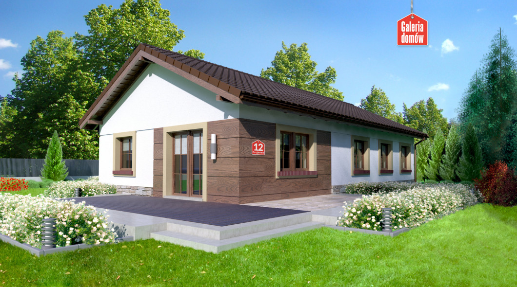 Dom przy Przyjemnej 12 należy do rodziny projektów domów parterowych o prostej sylwetce i ciepłych naturalnych barwach. Horyzontalny układ bryły i elementy wykończenia elewacji harmonizują z otaczającym terenem. Wejście do domu znajduje się pod zadaszeniem opartym na drewnianej kolumnie. Duże kształtne okna pozwalają nawiązać bliższe relacje z otoczeniem. W układzie pomieszczeń na planie prostokąta dostrzec można podział na strefy dzienną, nocną oraz zaplecze techniczne. Uwagę zwraca również obszerna łazienka.