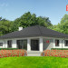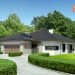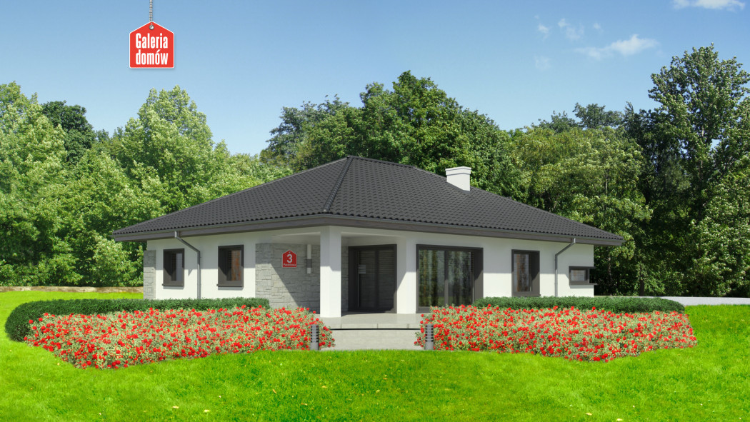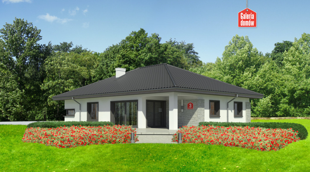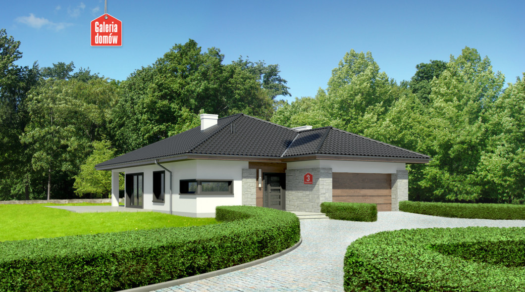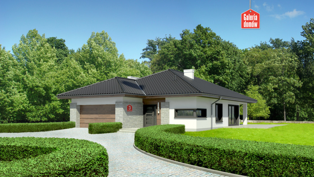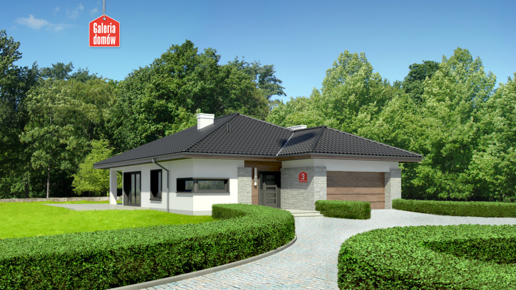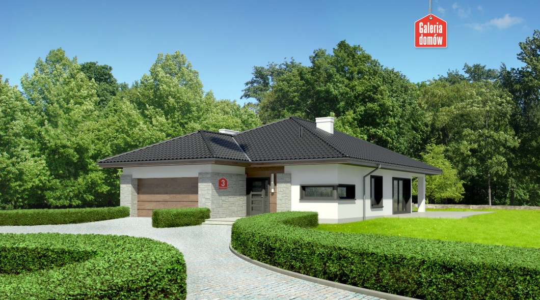 Szerokość działki często jest przeszkodą w lokalizacji domu parterowego. Nie w tym przypadku. Wydłużony kształt budynku nie oznacza, że pomieszczenia zostały zmniejszone. Dom kryje w sobie obszerne wnętrza o regularnych kształtach. Duże przeszklenia doświetlają pomieszczenia. Pokój dzienny, kuchnia, jadalnia, hall i korytarz tworzą wygodny jednoprzestrzenny układ. Dwustanowiskowy garaż, zlokalizowany we frontowej części domu, wysunięty jest mocno poza zasadniczy obrys budynku. Wraz z podłużnym oknem kuchni podkreśla jego horyzontalny, niepowtarzalny styl.