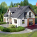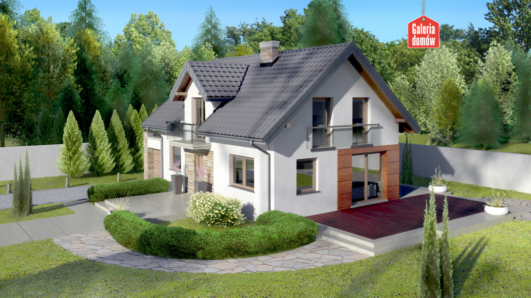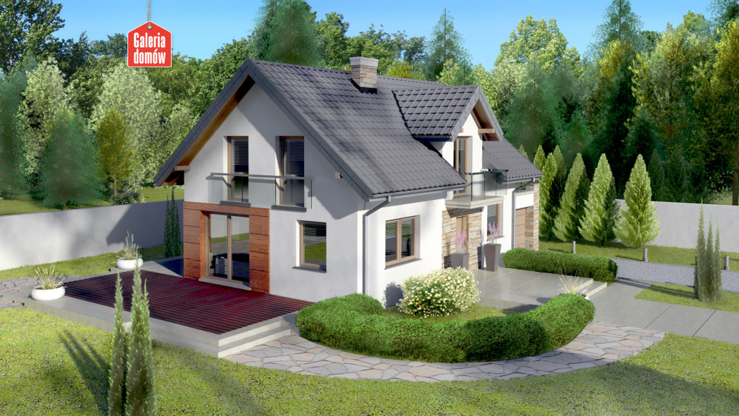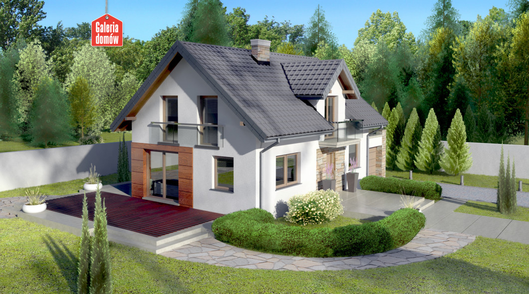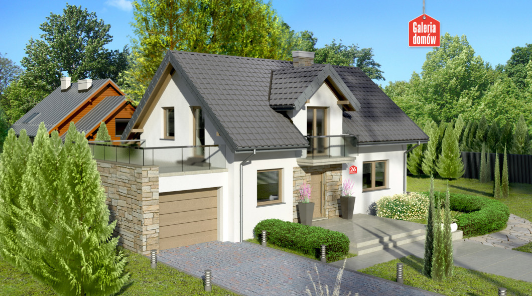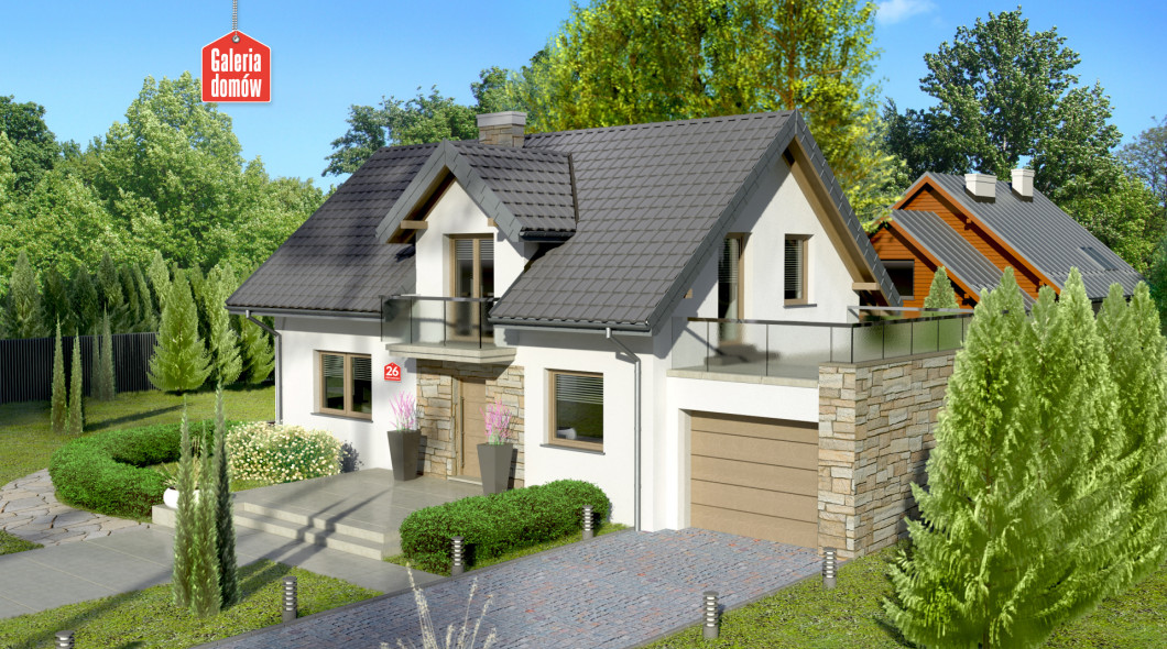 Nowoczesna stylistyka elewacji z lekkim detalem w łagodnym zestawieniu kolorystycznym dobrze współgra ze zwartą bryłą Domu przy Alabastrowej 26. Stateczny i spokojny charakter budynku poprawia odczucia związane ze stabilizacją i bezpieczeństwem. Akcentem o wzmocnionym walorze jest okładzina drewniana wokół okien balkonowych - wyjściu na taras ogrodowy - w prywatnej części ogrodu. Wnętrze projektu jest atrakcyjnym wariantem rozwiązania przyjętego w serii projektów gotowych Dom przy Alabastrowej.