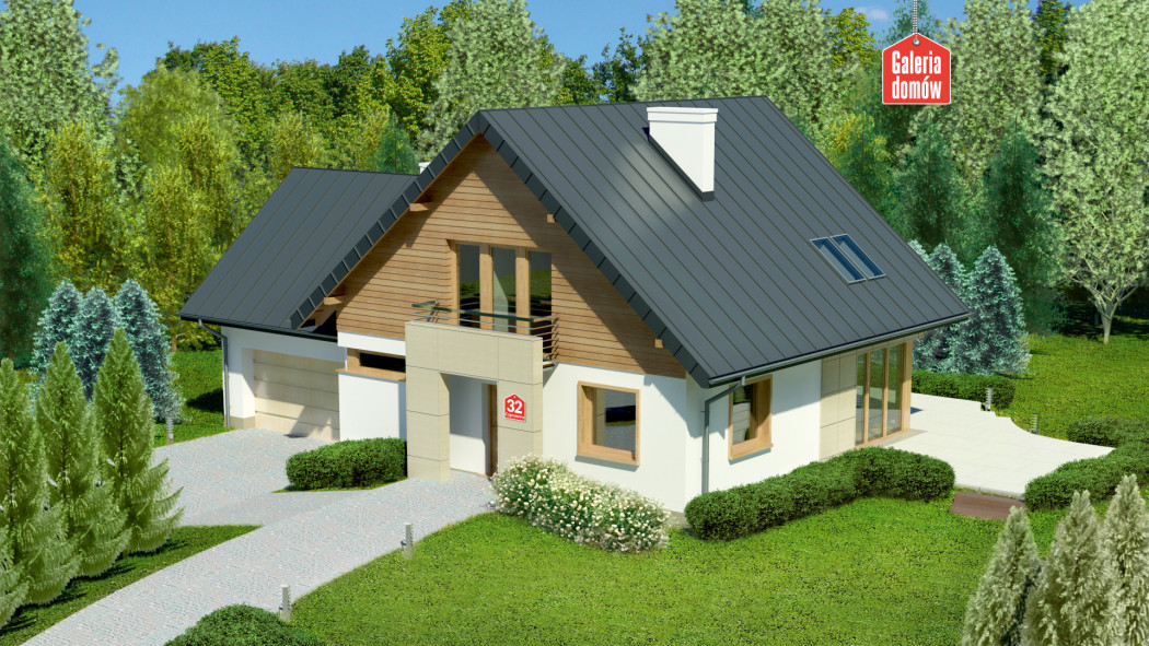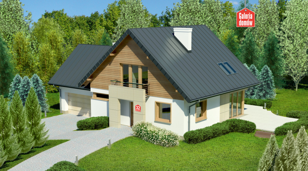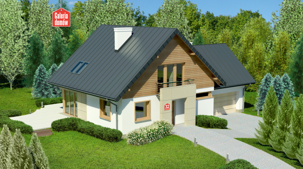 Dom przy Cyprysowej 32 jest podpiwniczoną wersją projektu Dom przy Cyprysowej 6. Zmiana kolorystyki elewacji - wprowadzenie jasnego drewna na elewacji i w stolarce powoduje ocieplenie wizerunku. Wykonanie podpiwniczenia wpływa na poprawę funkcjonalności poprzez powiększenie powierzchni pomocniczej. Oprócz dużej kotłowni, obszernej pralni z suszarnią, zyskujemy także dodatkową przestrzeń magazynową. Projekt jest dobrą alternatywą dla posiadaczy działek o pochylonej powierzchni.