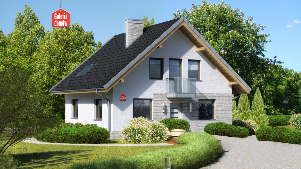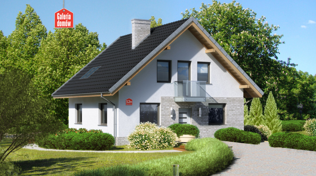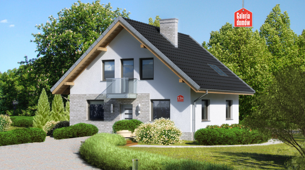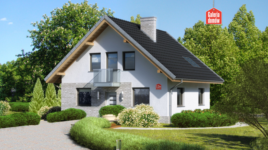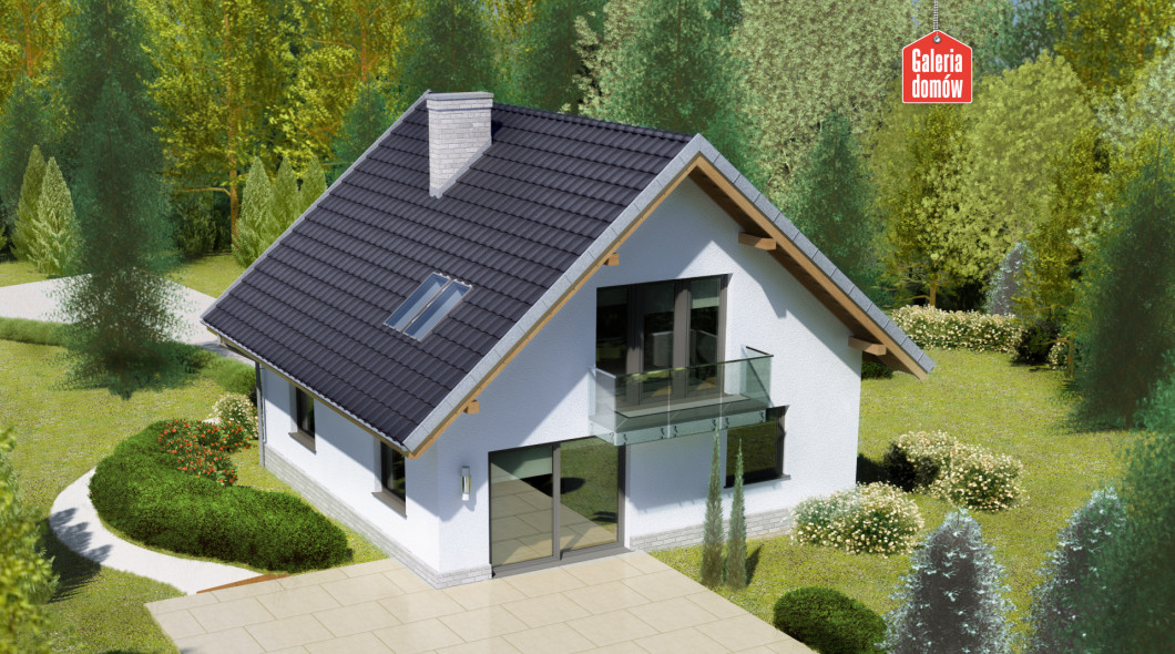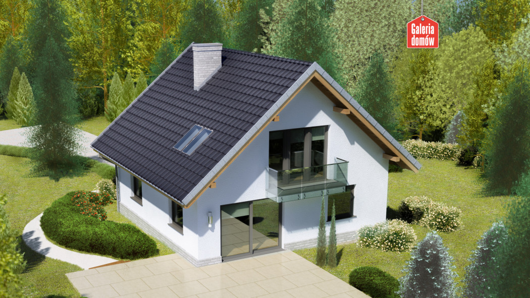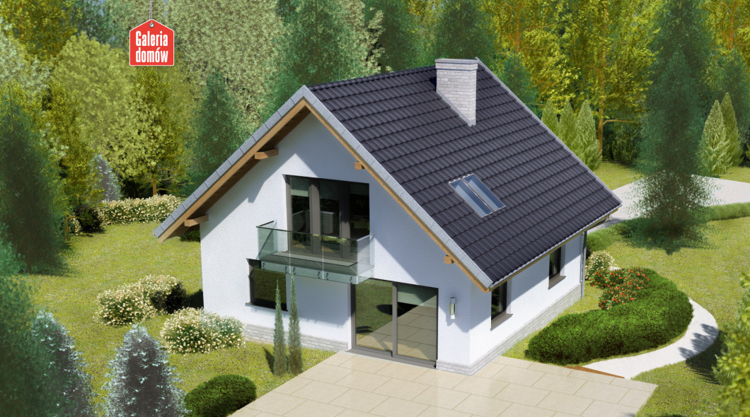 Nowoczesny dom z poddaszem, o prostej bryle przykrytej dwuspadowym dachem, architekturą nawiązujący do najlepszych trendów dzisiejszej sztuki projektowej. Szklane balkony, metaliczna stolarka aluminiowa, oryginalne oświetlenie i biała elewacja podkreślają oryginalny, współczesny charakter domu. Komfort użytkowania zapewnia funkcjonalny podział wnętrza na strefę dzienną i nocną. Na parterze znajduje się słoneczny salon, z którego przesuwnymi drzwiami można wyjść na taras, duża kuchnia, łazienka i dodatkowy pokój. Na poddaszu zaprojektowano trzy przytulne i jasne sypialnie oraz drugą łazienkę.