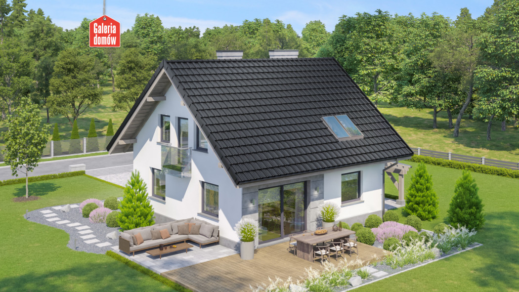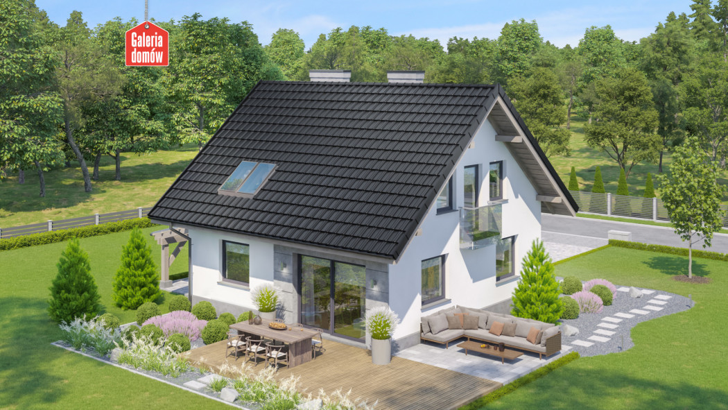 Nowoczesny dom o prostej bryle i ergonomicznym układzie funkcjonalnym. Kolorystyka elewacji, stylowe detale i wysoki standard wykończeń nadają mu charakter i poprawiają wygodę użytkowania. Duże przeszklenia przesuwnych drzwi tarasowych naturalnie rozświetlają wnętrze pokoju dziennego i sypialni. Estetyczną wartość budynku wzbogaca szklany balkonik od strony ogrodu oraz oryginalne oświetlenia fasady. Wnętrze domu jest przejrzyste i doskonale skomunikowane. Dużą zaletą jest przestronny salon z wyjściem na taras, lub do ogrodu. Ciszę i spokój zapewnia poddasze z trzema przytulnymi sypialniami. To idealne rozwiązanie dla osób ceniących modny design oraz solidne, sprawdzone rozwiązania w nowoczesnej odsłonie.