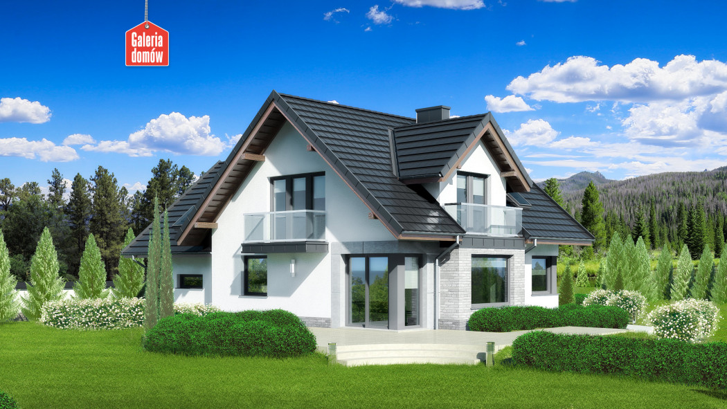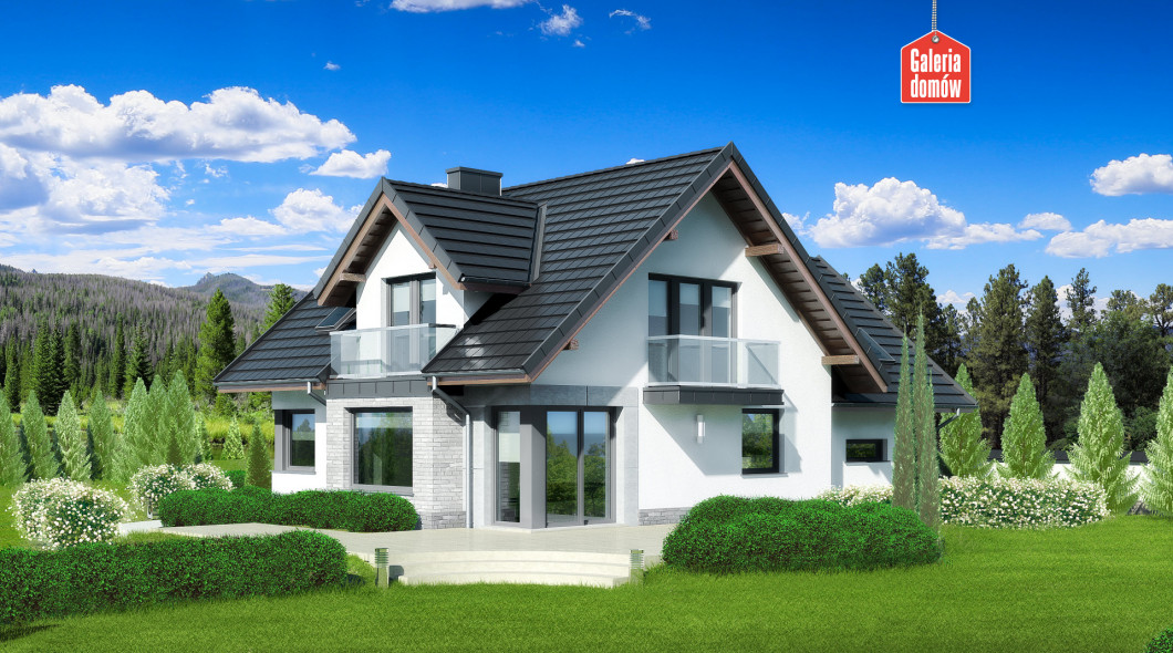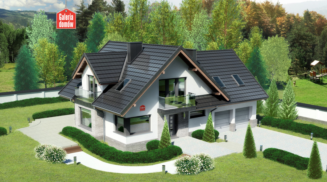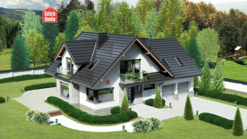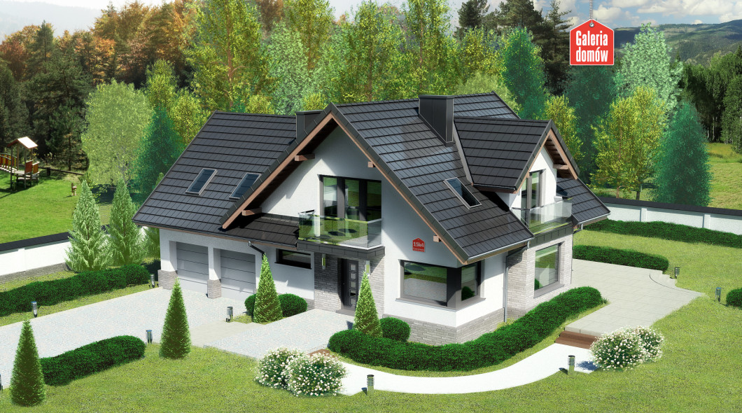 Gotowy projekt domu parterowego z poddaszem użytkowym i dwustanowiskowym garażem. Parter w części dziennej, stanowi duży, jasny salon z centralnie ulokowanym kominkiem. Otwarta kuchnia jest obszernym i jasnym miejscem, z widokiem na front domu. Poręcznym rozwiązaniem jest spiżarka wkomponowana w plan kuchni. Pozostałe elementy parteru to dodatkowy pokój, łazienka, pralnia zlokalizowana pod schodami i spora kotłownia umieszczona za garażem.
