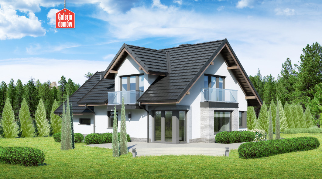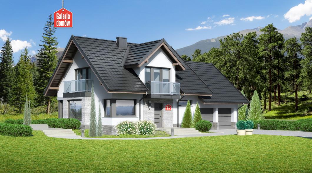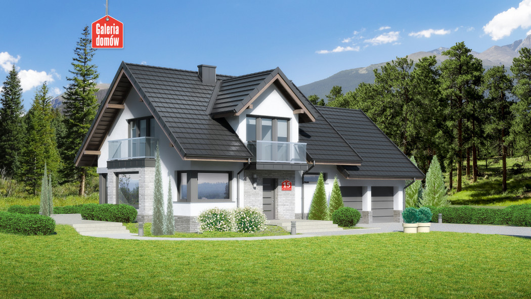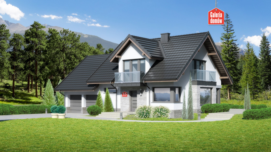 Dom przy Cyprysowej 15 DN2 to gotowy projekt domu z użytkowym poddaszem, podwójnym garażem i dachem dwuspadowym, ustawionym kalenicą równolegle do drogi. Część dzienną tworzą duży, przestronny pokój dzienny połączony z jadalnią ulokowaną w przeszklonym wykuszu. Całość przestrzeni uzupełnia otwarta kuchnia.