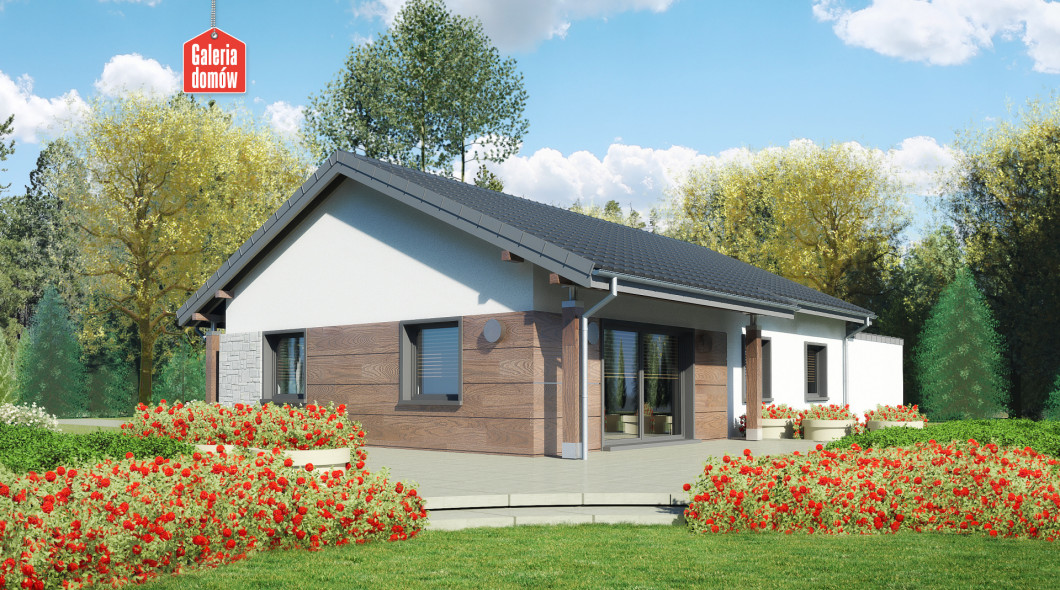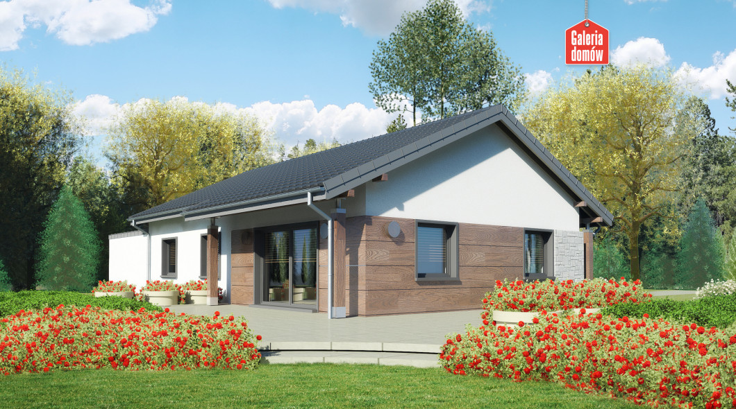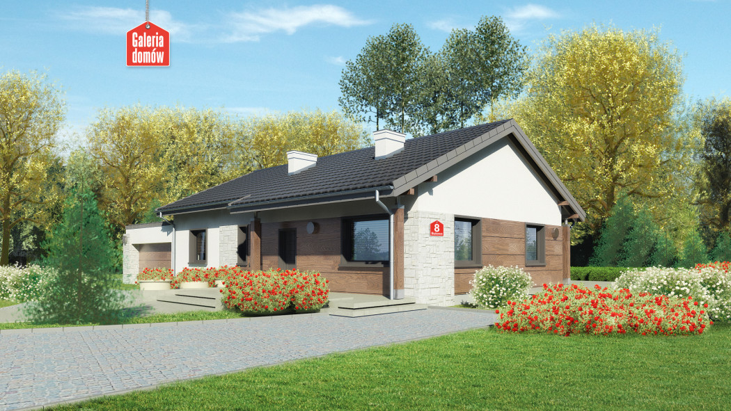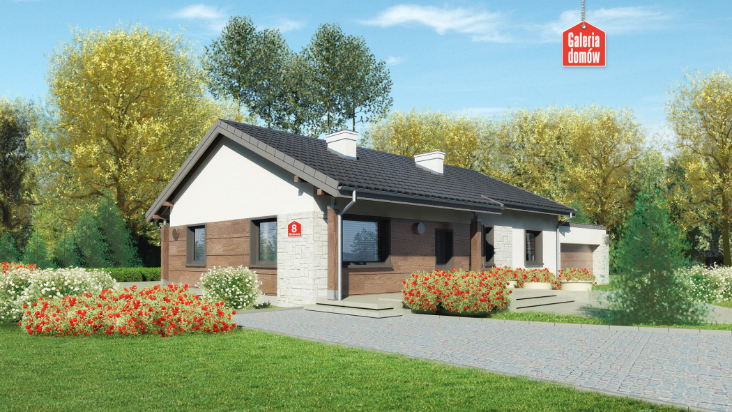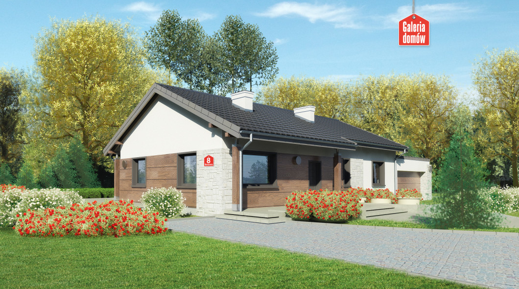 Dom przy Bukowej 8 jest gotowym projektem energooszczędnego domu parterowego z dwustanowiskowym garażem. Wykonany w technologii tradycyjnej, murowanej i dostosowany do najnowszych warunków technicznych. Układ funkcjonalny przewiduje otwartą, słoneczną część dzienną, na którą składa się salon i kuchnia. Centralnie ulokowany kominek i spora spiżarnia to atuty tej przyjaznej przestrzeni. Bukowa 7 posiada ponadto 3 sypialnie, pralnie, wygodną łazienkę i dodatkową toaletę. Za podwójnym garażem ulokowano kotłownię oraz funkcjonalne pomieszczenie do przechowywania mebli i sprzętów ogrodowych poza sezonem. Pomieszczenie łączące wnętrze domu z garażem idealnie nadaje się na garderobę potrzebną w każdym domu. Elewacja budynku, wykonana z naturalnego drewna i kamienia, utrzymana w stonowanych kolorach, oddaje niezwykle popularny i lubiany styl we współczesnej architekturze. Projekt, dzięki przemyślanej konstrukcji, jest szybki i tani w budowie oraz ekonomiczny w użytkowaniu. Doskonały wariant dla 4-5 osobowej rodziny.