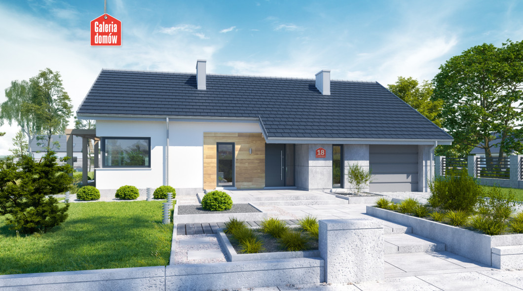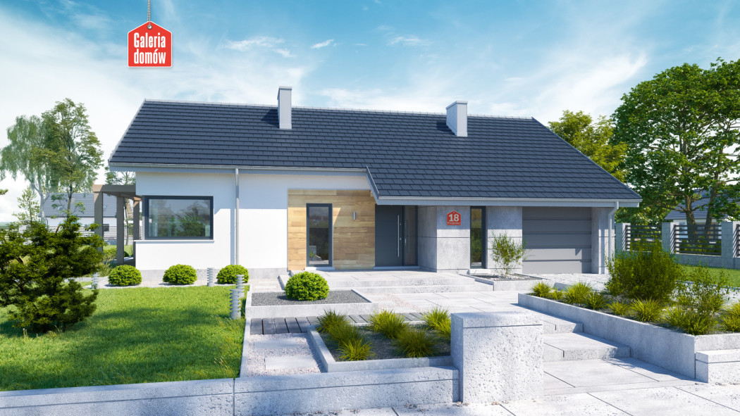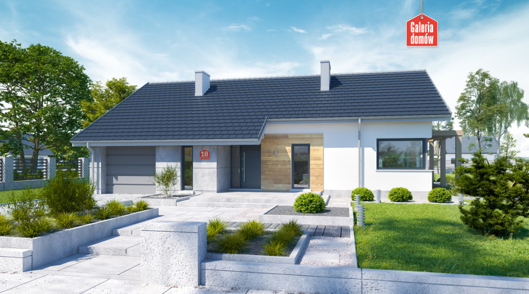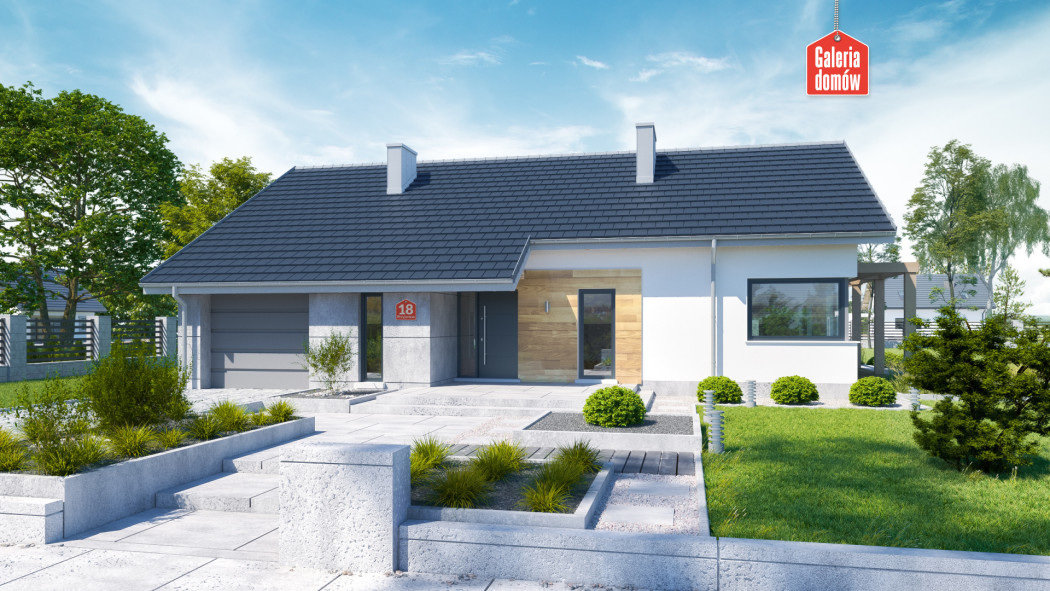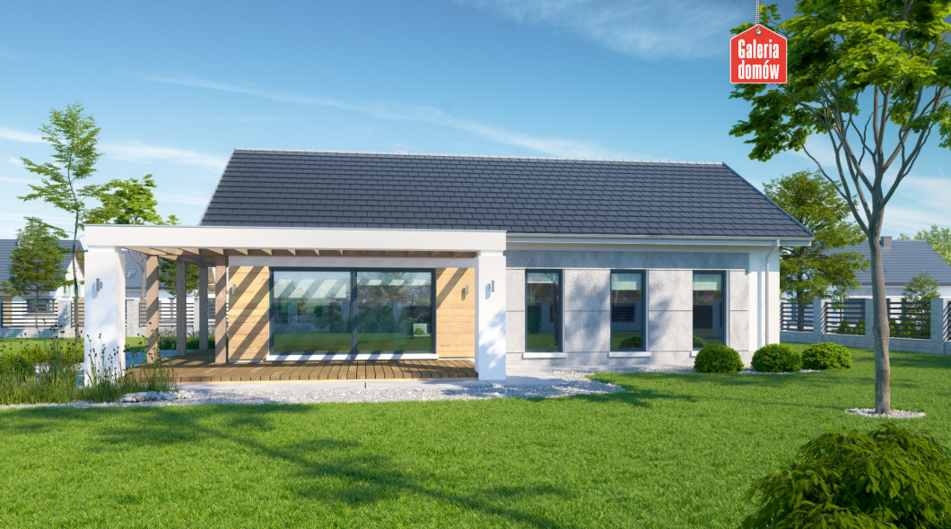 Nowoczesny dom parterowy, będący ciekawą propozycją dla 4-osobowej rodziny. Prosta bryła czyni go szybkim i tanim w budowie. Parter podzielono wyraźnie na dwie strefy. Po zachodniej stronie znajduje się przestrzeń dzienna składająca się z salonu i kuchni. Efektownie zaaranżowany taras, z nowoczesną pergolą, stanowi naturalne przedłużenie salonu i jest doskonałym miejscem do spędzania czasu w ciepłe, słoneczne dni. Kuchnia jest doskonale doświetlona poprzez zastosowanie narożnego, panoramicznego okna.