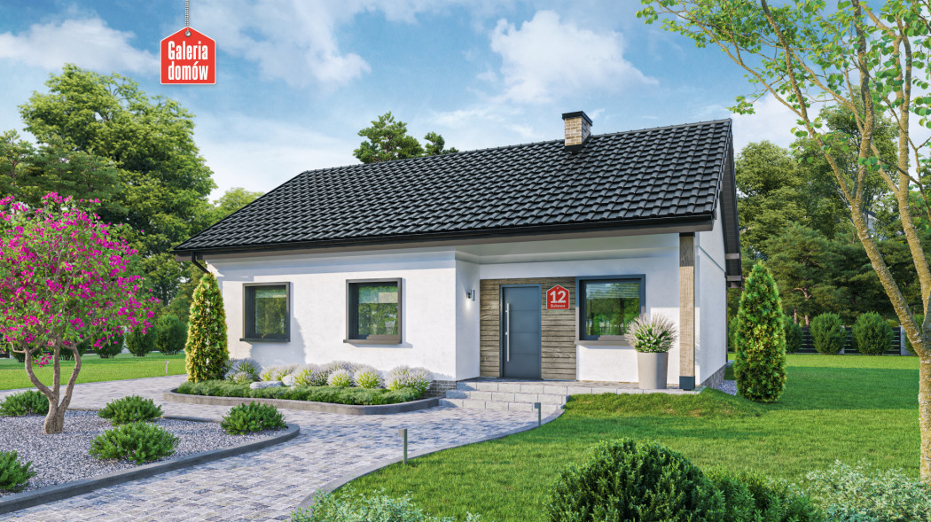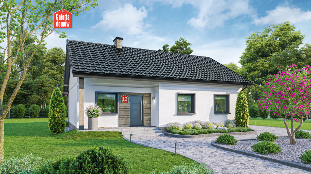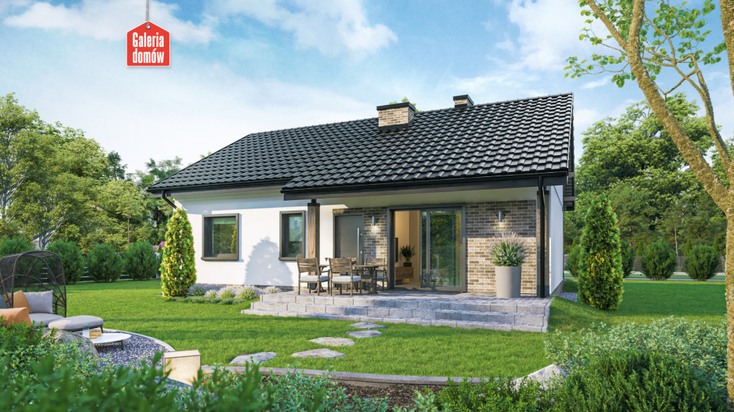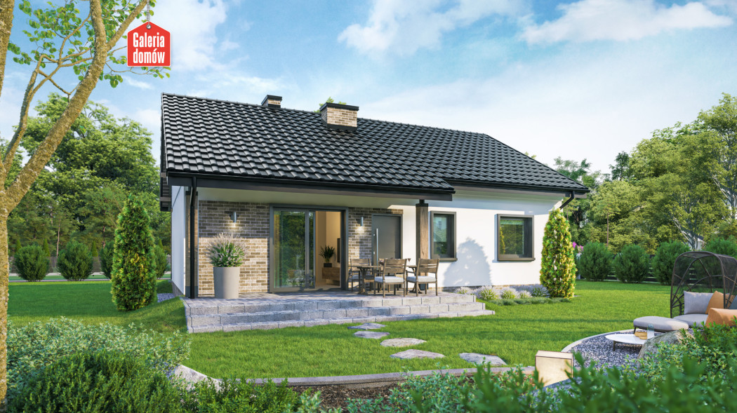 Niewielki energooszczędny dom parterowy, wyposażony w system instalacji solarnej i wentylacje mechaniczną z odzyskiem ciepła. Minimalizm w ilości ścian nośnych sprawia, iż dom jest tani i szybki w budowie. Otwarta strefa dzienna składa się ze słonecznego pokoju z kominkiem i ergonomicznej kuchni połączonej z jadalnią. Z zieloną sferą ogrodu łączą ją drzwi przesuwne. Część wypoczynkowa domu to trzy sypialnie i kompletnie wyposażona łazienka. Kotłownia została zaprojektowana tak, by pomieściła pralnię i była wielofunkcyjnym miejscem, w którym można magazynować ogrodowe meble (drzwi na zewnątrz). Solidny strop pozwala na zagospodarowanie dużego strychu według indywidualnego uznania. Ciekawe rozwiązanie na wąskie działki, lub do zabudowy szeregowej. Doskonała propozycja dla 4-5 osobowej rodziny.