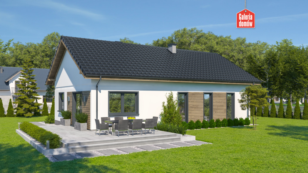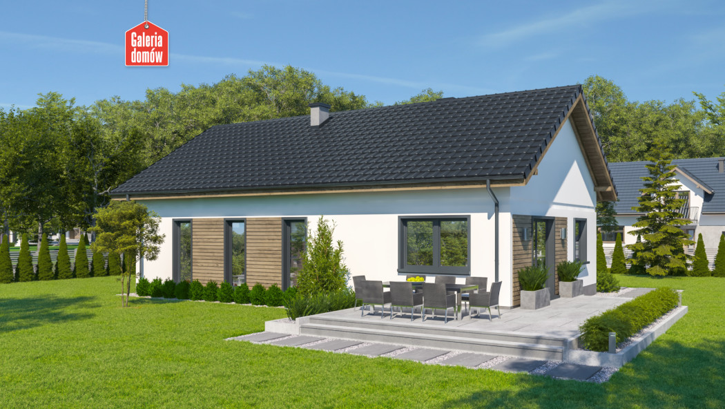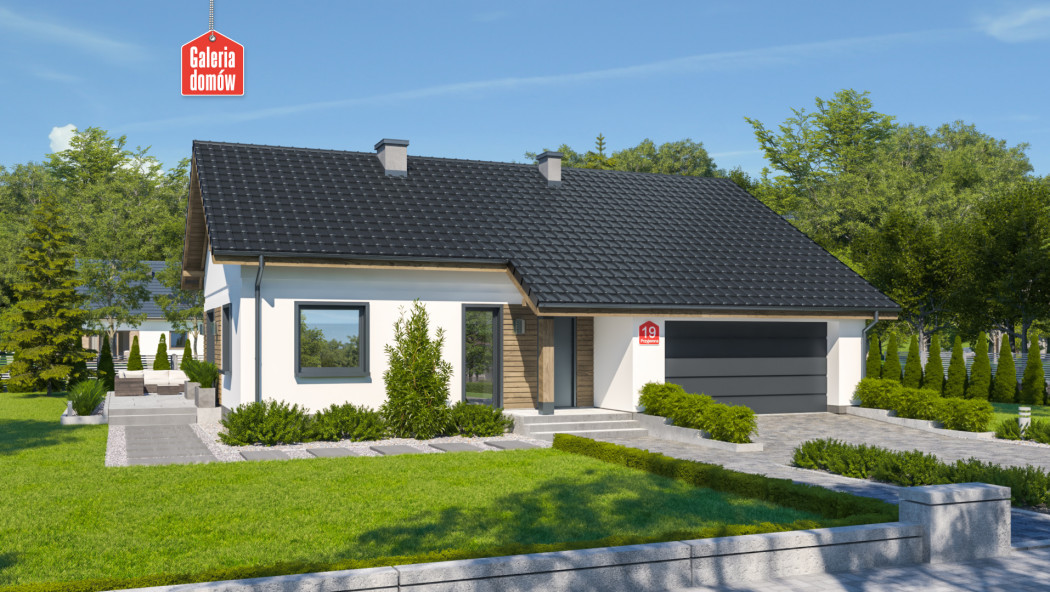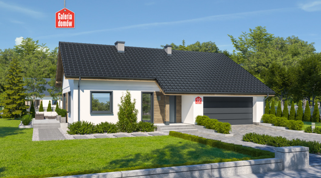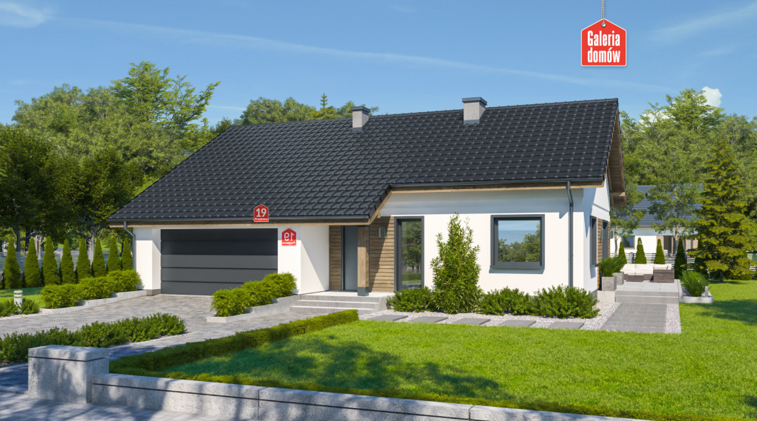 Nowoczesny dom parterowy, wyposażony w system instalacji solarnej i wentylację mechaniczną z odzyskiem ciepła, projektowany w systemie tradycyjnym, murowanym. Płaski, dwuspadowy dach oparto na drewnianej więźbie krokwiowej. Minimalizm w ilości ścian nośnych sprawia, iż dom jest tani i szybki w budowie. Otwarta strefa dzienna składa się ze słonecznego pokoju z kominkiem i otwartej kuchni. W jadalni, ulokowanej na granicy kuchni i salonu z powodzeniem mieści się duży stół. Taras i przydomowy ogród dostępny jest w całej okazałości dzięki drzwiom przesuwnym. Część wypoczynkowa domu to dwie sypialnie i łazienka, z narożna wanną i kabiną prysznicową. Kotłownia została zaprojektowana tak, by pomieściła pralnię i była wielofunkcyjnym miejscem, w którym można magazynować środki czystości i sprzęty codziennego użytku. Solidny strop pozwala na zagospodarowanie dużego strychu według indywidualnego uznania. Atutem budynku jest dwustanowiskowy garaż z wyjściem do ogrodu. Dom przy Przyjemnej 19 to ciekawe rozwiązanie, które zainteresuje inwestorów chcących tanio i szybko wybudować elegancki, parterowy dom z dwustanowiskowym garażem. Doskonała propozycja dla 4-5 osobowej rodziny.