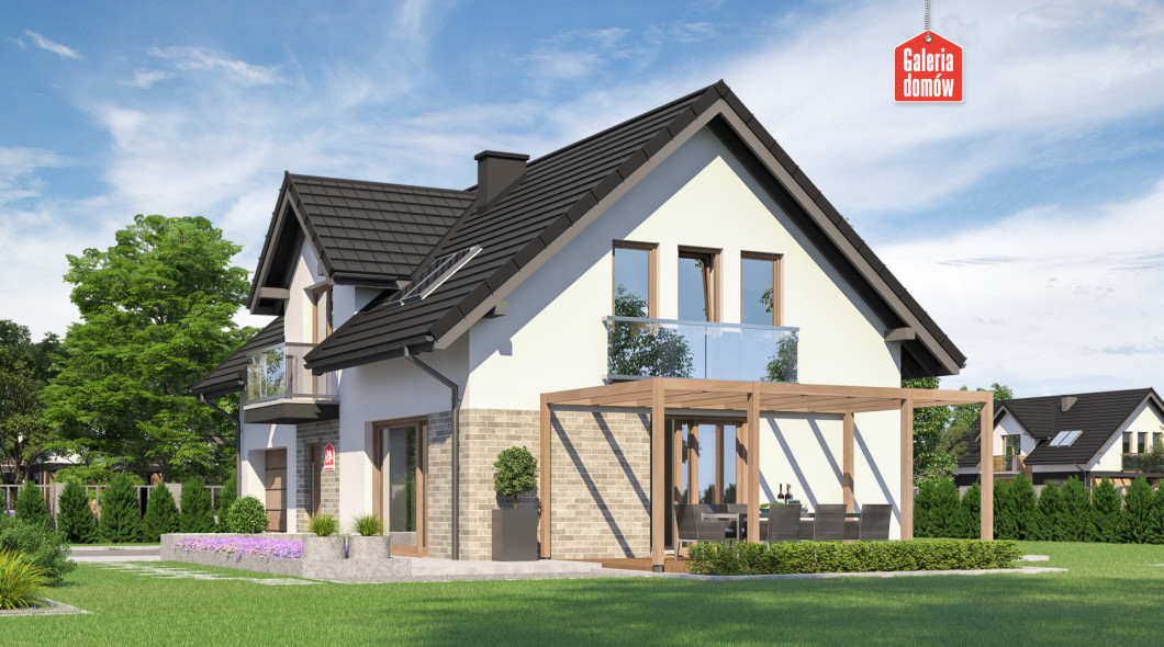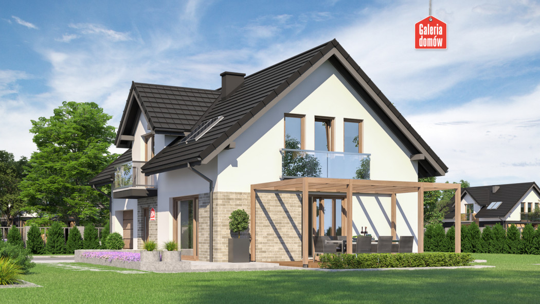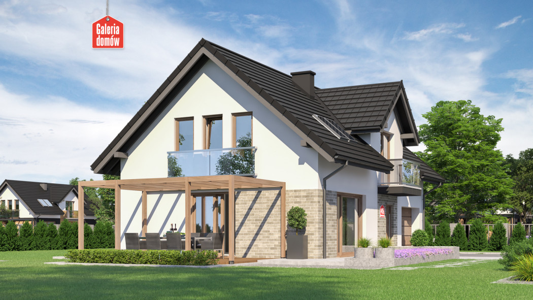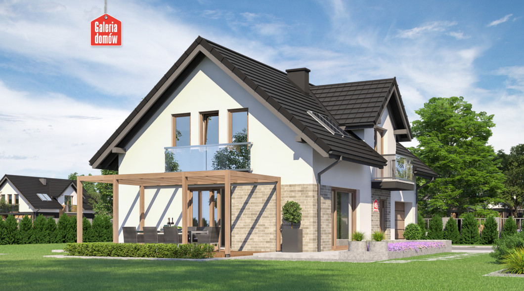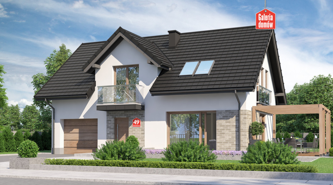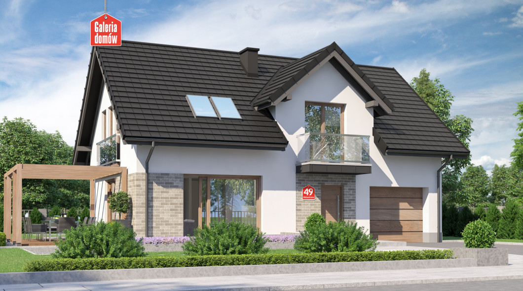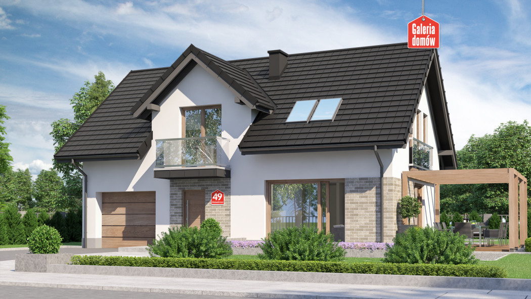 Dom przy Alabastrowej 49 to gotowy projekt energooszczędnego domu z użytkowym poddaszem, o zwartej bryle i prostym dwuspadowym dachu. Konstrukcja i wykończenie nawiązuje do najmodniejszych trendów współczesnej sztuki projektowej. Szklane balkony, wysokiej jakości dachówka, oryginalne oświetlenie i biała elewacja podkreślają oryginalny, nowoczesny charakter domu.