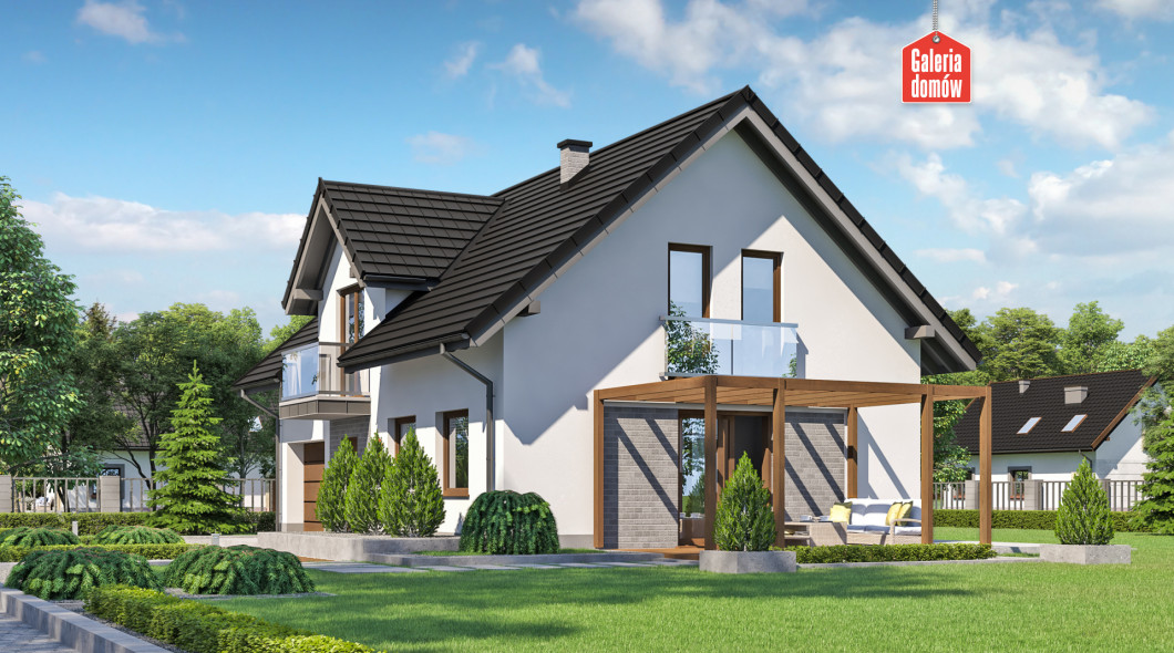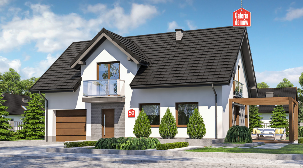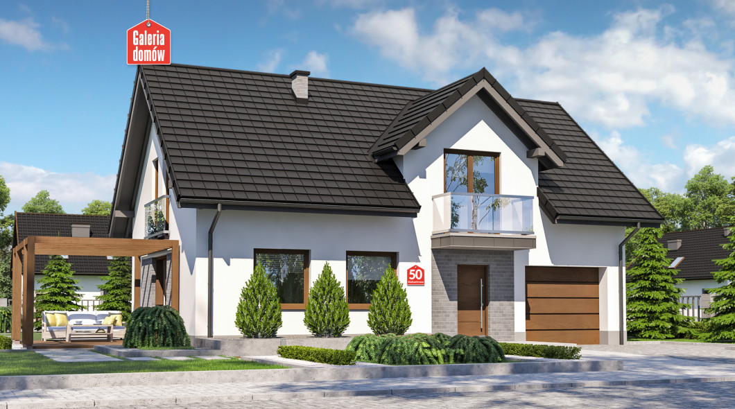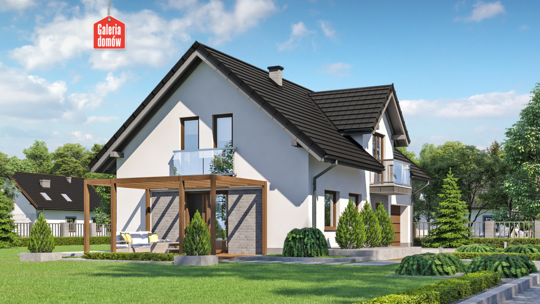 Nowoczesny dom jednorodzinny z poddaszem użytkowym, który w pełni zaspokoi potrzeby 4-5 osobowej rodziny. Parter jest doskonale doświetlony dziennym słońcem od rana do wieczora. Przestrzeń została funkcjonalnie rozplanowana i posiada, poza pokojem dziennym, otwartą kuchnię z jadalnią i dodatkową sypialnię. Uzupełnienie dla strefy pobytu dziennego stanowi łazienka, pomieszczenie gospodarcze, pojedynczy garaż oraz spora kotłownia z wyjściem na zewnątrz. Na poddaszu zaprojektowano cztery wygodne sypialnie z dostępem do balkonów i duży pokój kąpielowy. Apartament małżeński również zawiera prywatną łazienkę. Prosta konstrukcja, dwuspadowy dach i minimalizm architektoniczny pozwala szybko i sprawnie wybudować ten dom, nawet na niewielkich działkach. Projekt zawiera charakterystykę energetyczną według WT 2021.