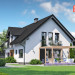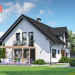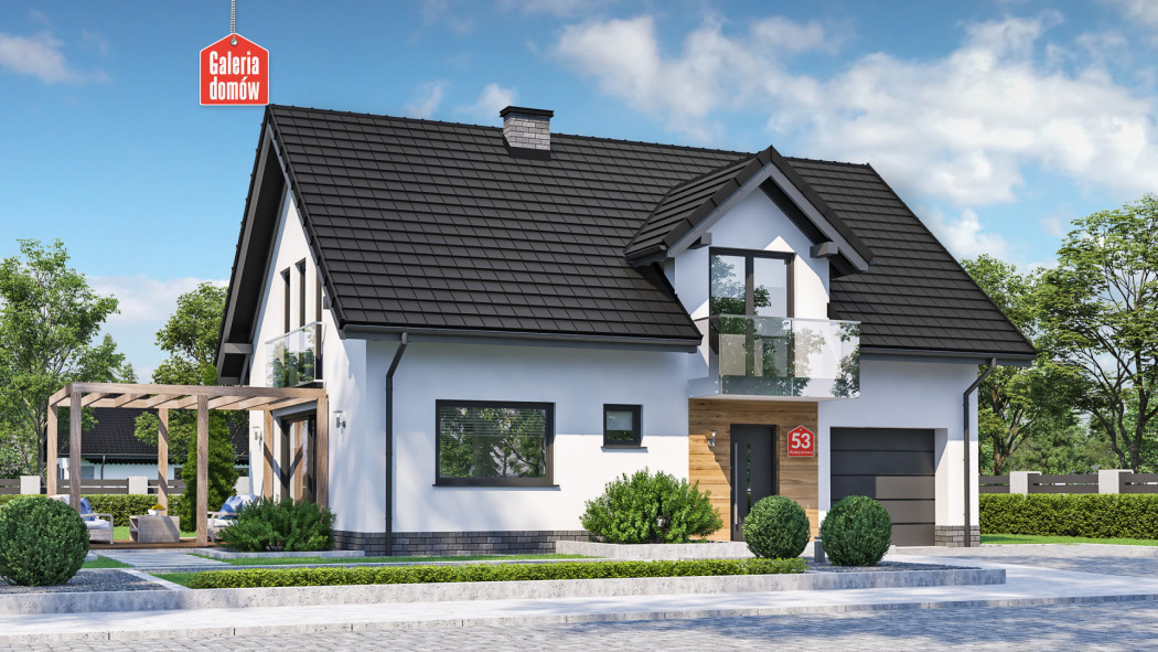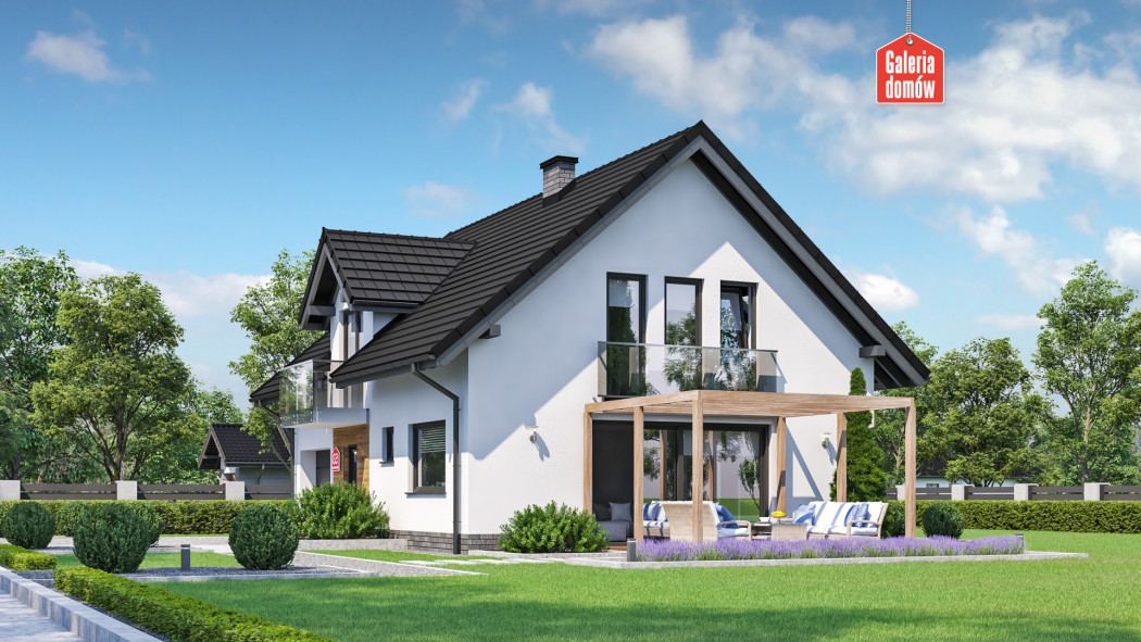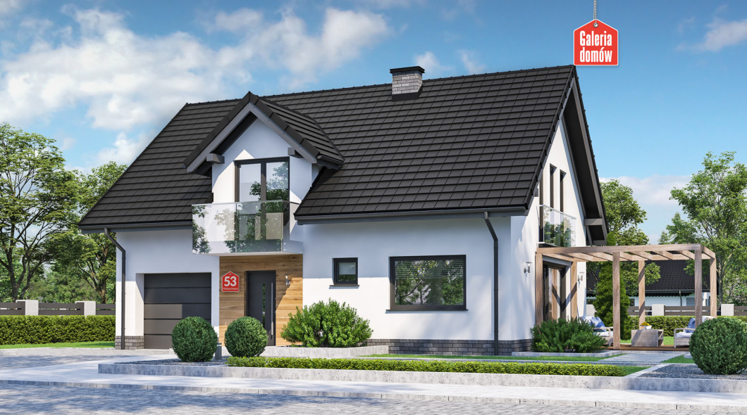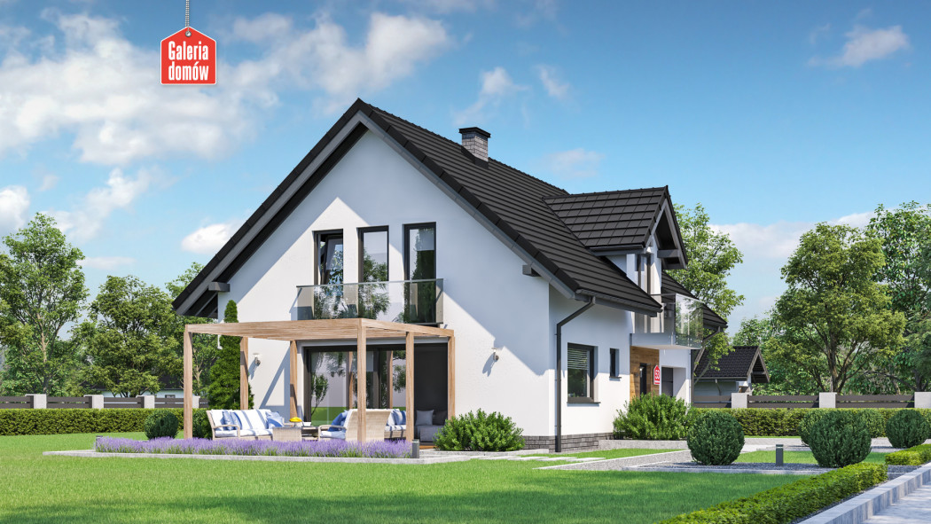 Nowoczesny dom z użytkowym poddaszem, o zwartej bryle przykrytej dwuspadowym dachem, konstrukcją i wykończeniem nawiązujący do najlepszych trendów współczesnej sztuki projektowej. Szklane francuskie balkony, stolarka aluminiowa w kolorze antracyt, wysokiej jakości dachówka, oryginalne oświetlenie i biała elewacja podkreślają nowoczesny charakter domu. Wygodę i ergonomię użytkowania zapewnia funkcjonalny podział wnętrza na strefę dzienną i nocną.