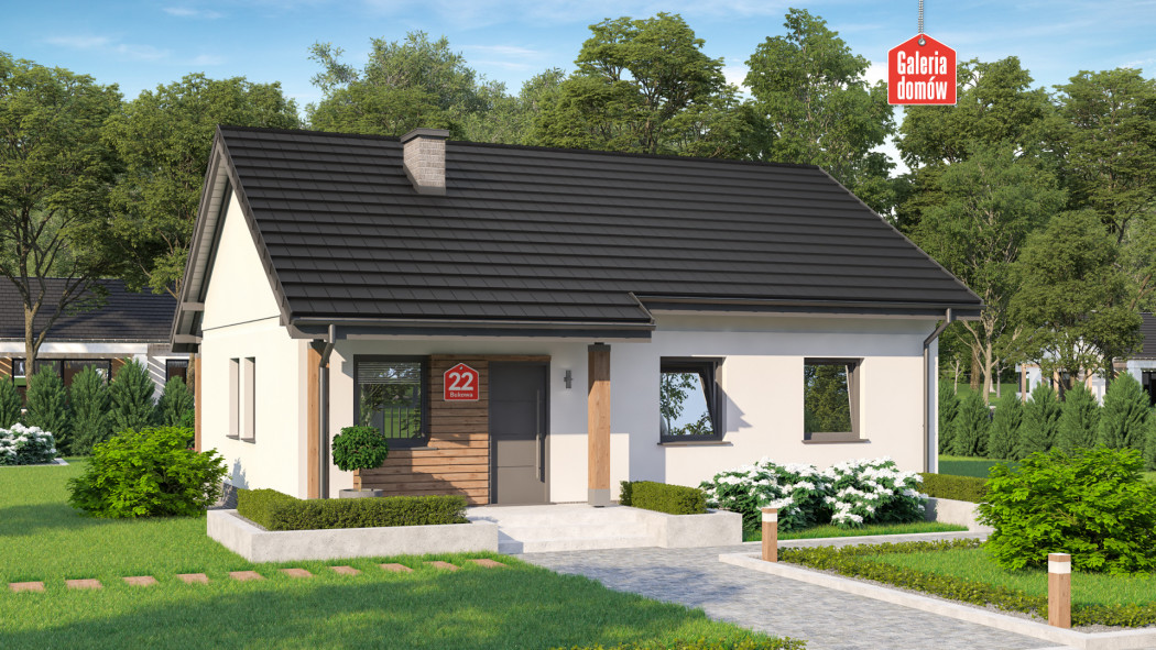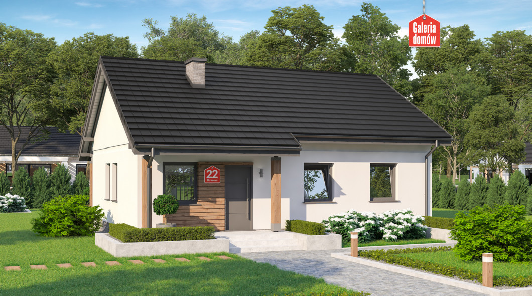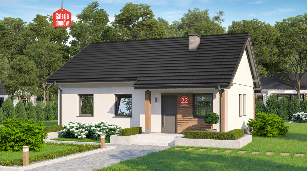 Dom przy Bukowej 22 to energooszczędna parterówka o powierzchni użytkowej 70.10 m². Projekt zaopatrzony w system instalacji solarnej i wentylację mechaniczną z odzyskiem ciepła. Dom podzielono na dwie strefy – słoneczny living room z kuchnią i część sypialnianą. Otwarta strefa dzienna składa się ze salonu z kominkiem i otwartej kuchni, połączonej z jadalnią. Zielona sfera ogrodu dostępna jest dzięki drzwiom przesuwnym w systemie HS. Strefa nocna domu obejmuje trzy sypialnie i kompletnie wyposażoną łazienkę, z kabiną prysznicową i wanną. Kotłownia została zaprojektowana tak, by pomieściła pralnię i była wielofunkcyjnym miejscem, w którym można magazynować ogrodowe meble. Kąt nachylenia dachu równy 30 stopniom pozwala na zagospodarowanie strychu według indywidualnego uznania. Dom przy Bukowej 22 to interesujące rozwiązanie, które dedykowane jest inwestorom chcącym tanio i szybko wybudować elegancki, parterowy dom. Doskonała propozycja dla 4-5 osobowej rodziny, również na małe działki.