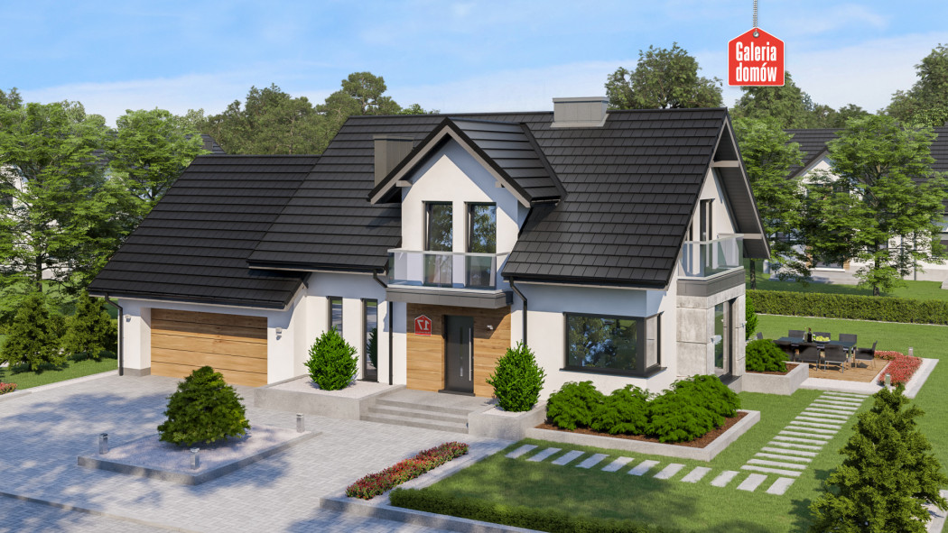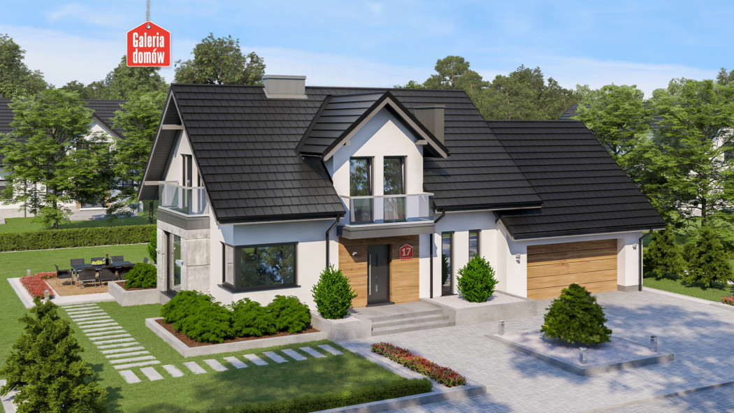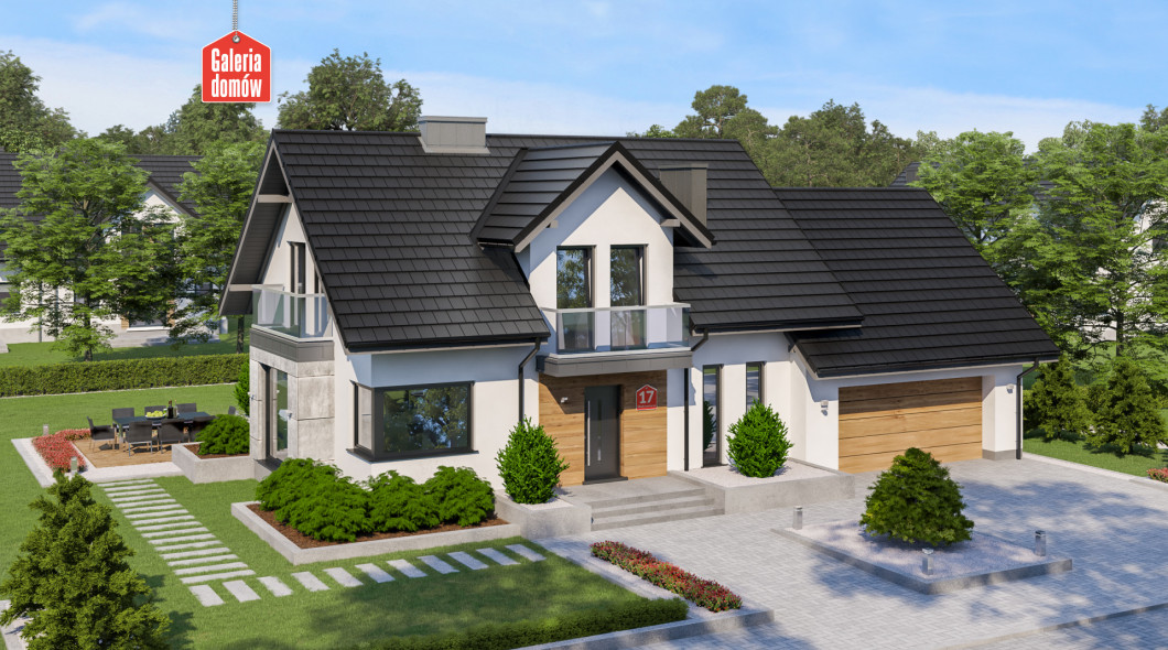 Dom przy Modrzewiowej 17 to gotowy projekt domu z użytkowym poddaszem, podwójnym garażem i dachem dwuspadowym, ustawionym kalenicą równolegle do drogi. Część dzienną tworzą przestronny pokój dzienny, połączony z jadalnią ulokowaną w wykuszu. Całość jest otwarta na elegancką kuchnię.