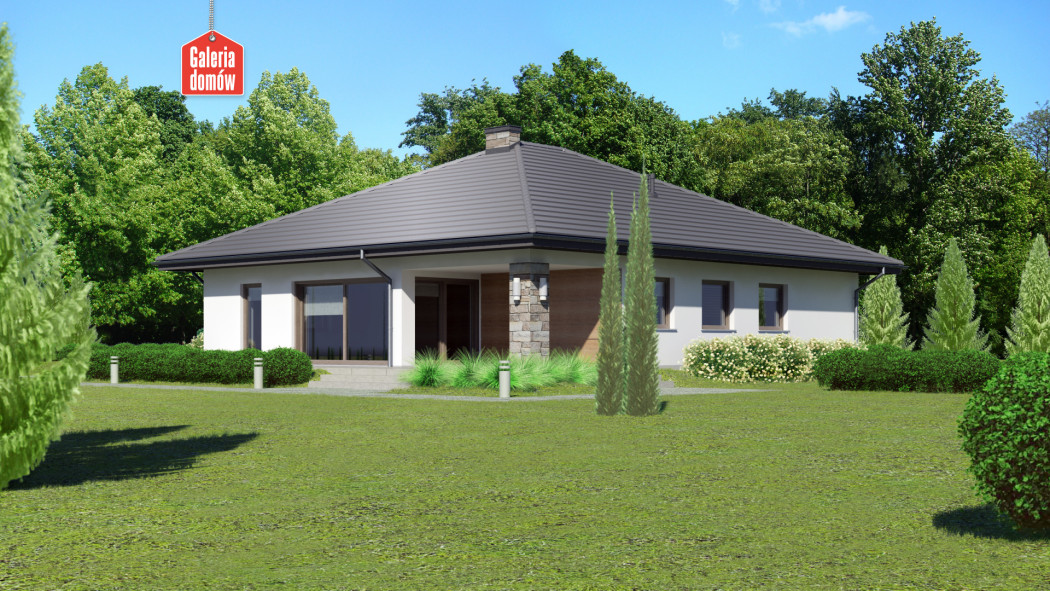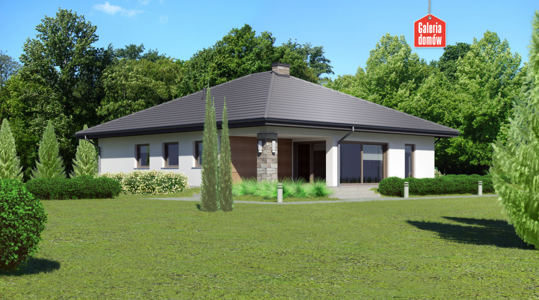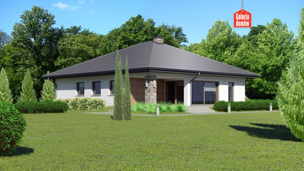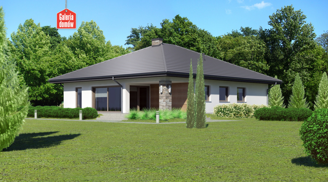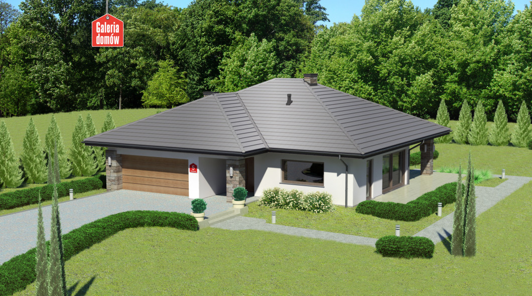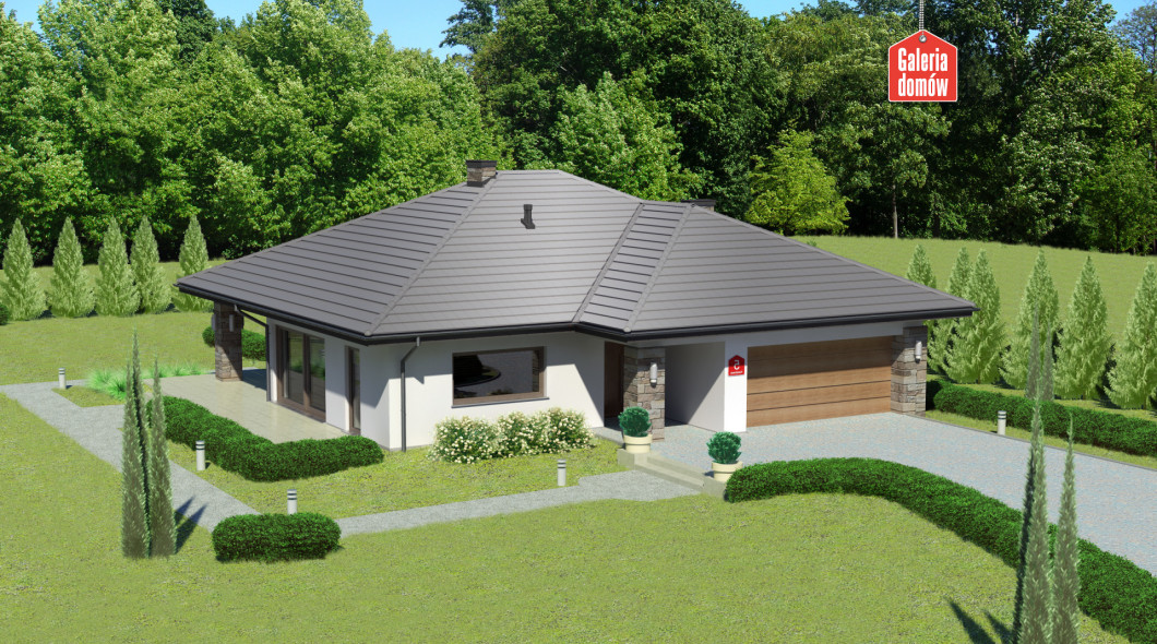 Dom przy Kwiatowej 5 to nowoczesny, energooszczędny budynek mieszkalny z dachem czterospadowym. Parterowa konstrukcja o zwartej bryle, w której ulokowano podwójny garaż. Układ funkcjonalny składa się z salonu z wyjściem na zadaszony taras, otwartej kuchni i czterech pokoi. W domu przewidziano dwie kompletne łazienki. W korytarzu, zaprojektowanym w kształcie litery C, umieszczono garderobę. Jest ona dostępna za przesuwnymi drzwiami. Projekt przewidziany do realizacji w technologii murowanej z drewnianą więźbą tradycyjną. Doskonała propozycja dla większej rodziny.