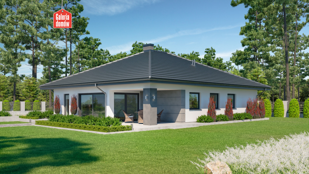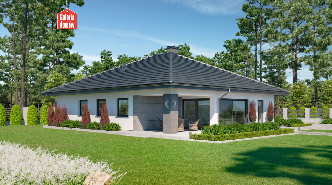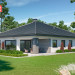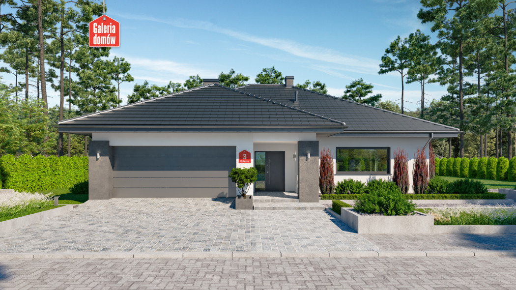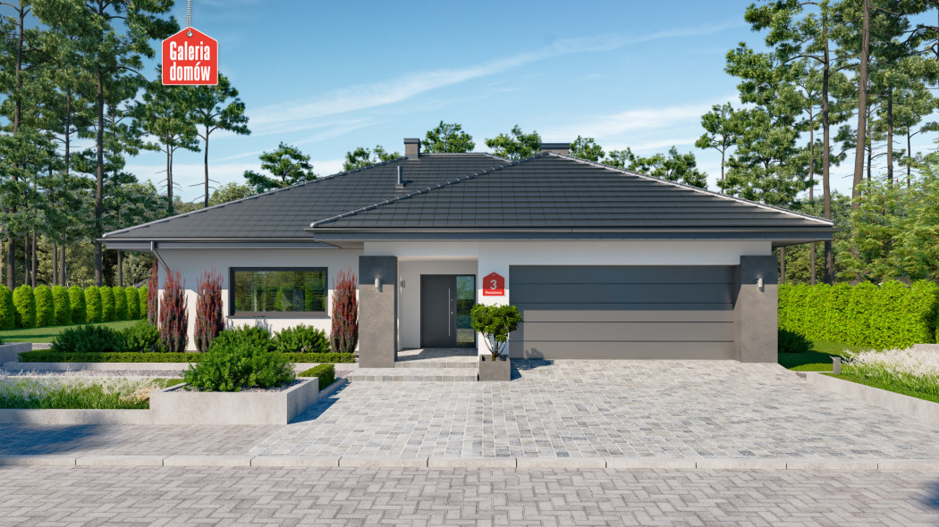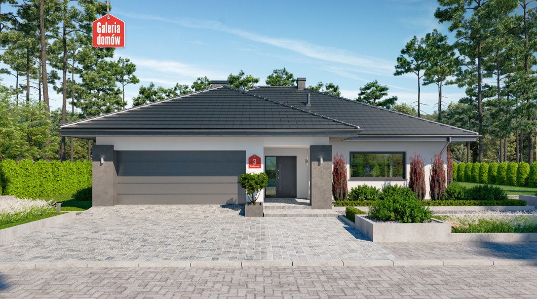 Dom przy Kwiatowej 3 to parterowy budynek z podwójnym garażem, zaprojektowany w technologii murowanej. Układ funkcjonalny przewiduje z 4 pokoje, 2 łazienki, kotłownię, garaż i otwartą część dzienną. Składa się na nią komfortowy i słoneczny salon, jadalnia oraz przestronna kuchnia. Dom przy Kwiatowej 3 wyposażono w duże przeszklenia – panoramiczne okno w kuchni, przesuwne drzwi w systemie HS oraz stała witryna w części jadalnianej. Wnętrze jest przez to słoneczne i przyjemnie się w nim odpoczywa po całym dniu pracy. Budynek otwiera się na zadaszony taras i zieloną strefę ogrodu. Kwiatowa 3 należy do grupy domów energooszczędnych i nowoczesnych. Dachówka o stalowym odcieniu, biała elewacja i stolarka w kolorze inox to atrakcyjne połączenie najlepszego stylu i modnych trendów w projektowaniu domów. Doskonała propozycja dla tych, którzy cenią nowoczesne rozwiązania i poszukują pojemnego domu parterowego o niewielkich rozmiarach.