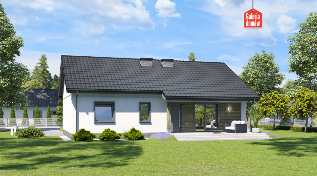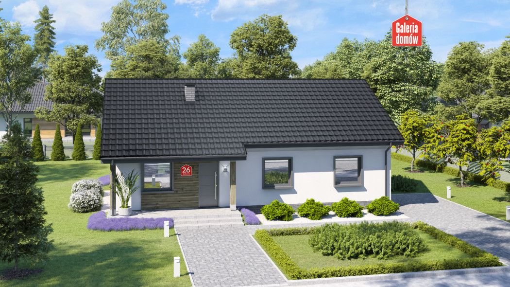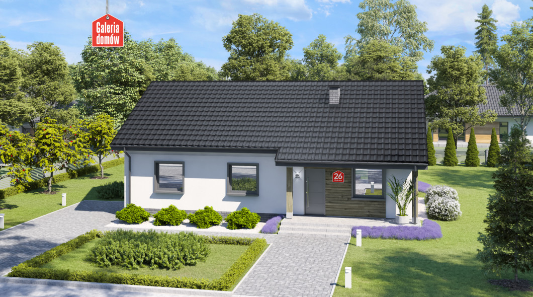 Dom przy Bukowej 26 to budynek parterowy o powierzchni użytkowej 95 m². Łatwy w budowie i oszczędny w realizacji. Pozwala na budowę na niewielkiej działce. Układ funkcjonalny przewiduje 3 pokoje, otwartą kuchnię, salon, łazienkę, toaletę, oraz kotłownię z miejscem na pralnię. Elewację wykonano w nowoczesnej stylistyce, przy użyciu modnych dodatków. Drewniana okładzina i czarno-biała kolorystyka to najmodniejszy obecnie design wykorzystywany w architekturze. Projekt został przygotowany w oparciu o warunki techniczne na 2021 rok. Posiada aktualną charakterystykę energetyczną. Bukowa 26 to budynek energooszczędny i tani w użytkowaniu. Parterowy raj dla 4-5 osobowej rodziny.