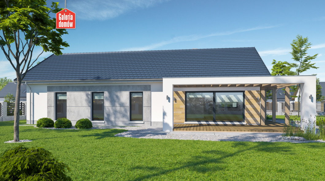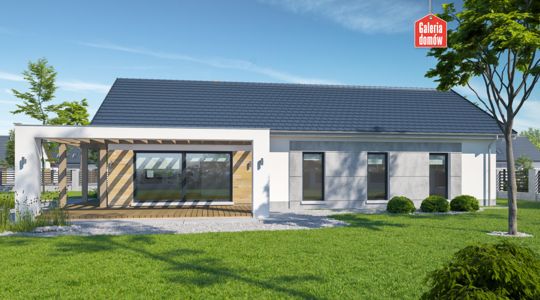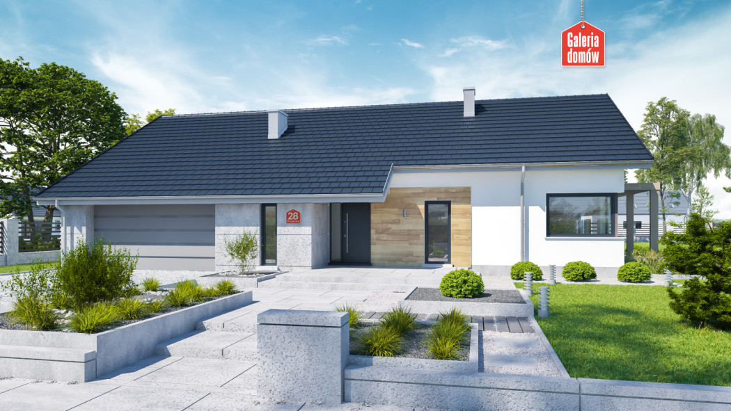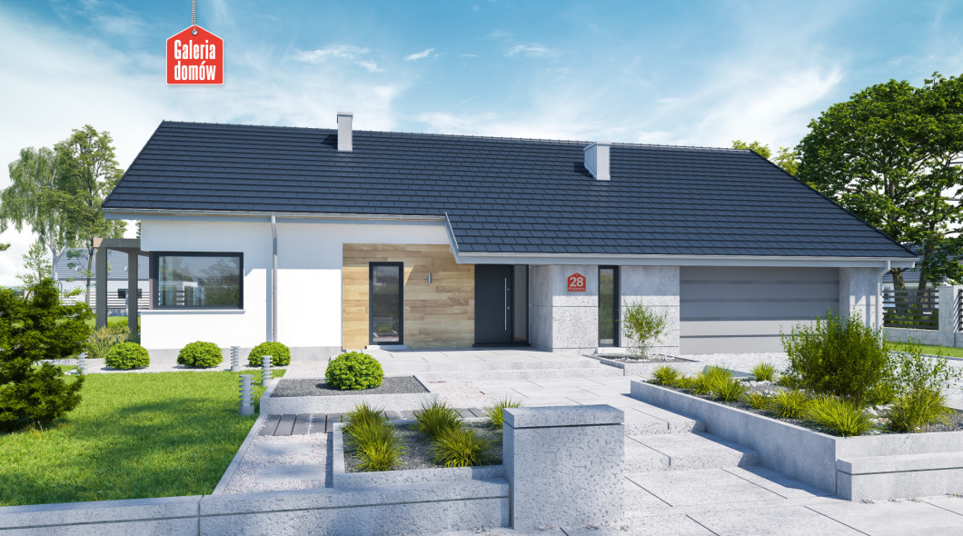 Projekt domu parterowego z dachem dwuspadowym i podwójnym garażem w bryle budynku. Powierzchnia użytkowa wynosi 125.33 m². Dom energooszczędny, prosty w budowie i ekonomiczny w realizacji. Wnętrze zawiera 3 pokoje, otwarta kuchnię, salon oraz 2 łazienki, kotłownię i garaż na dwa samochody. Przestrzeń parteru jest doskonale doświetlona dzięki licznym przeszkleniom. W kuchni przewidziano narożne okno panoramiczne, a w salonie przesuwne drzwi tarasowe. Wokół tarasu przewidziano nowoczesna pergolę, która można w ciekawy sposób zaaranżować. Dom ma nowoczesny wygląd o czym decydują użyte do wykończenia materiały. Drewno, stolarka w kolorach stalowych, ciemna dachówka i biała elewacja, dają stylowy wygląd. Dom przy Przyjemnej 28 bis stanie się ozdobą każdej działki. Doskonała propozycja dla nowoczesnej rodziny.