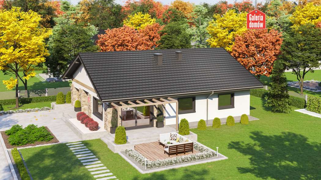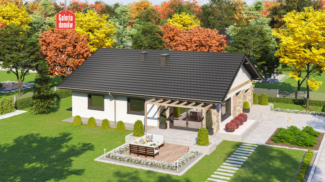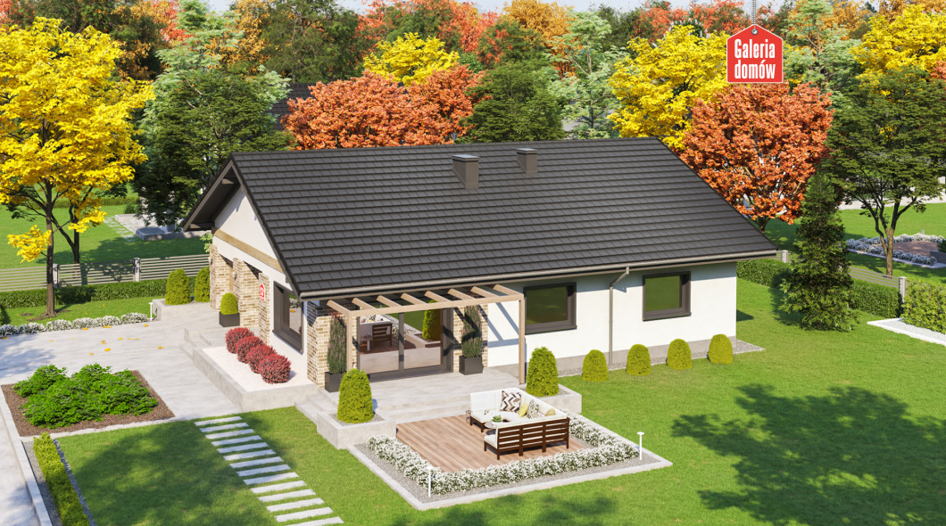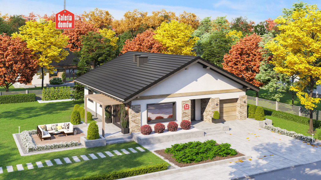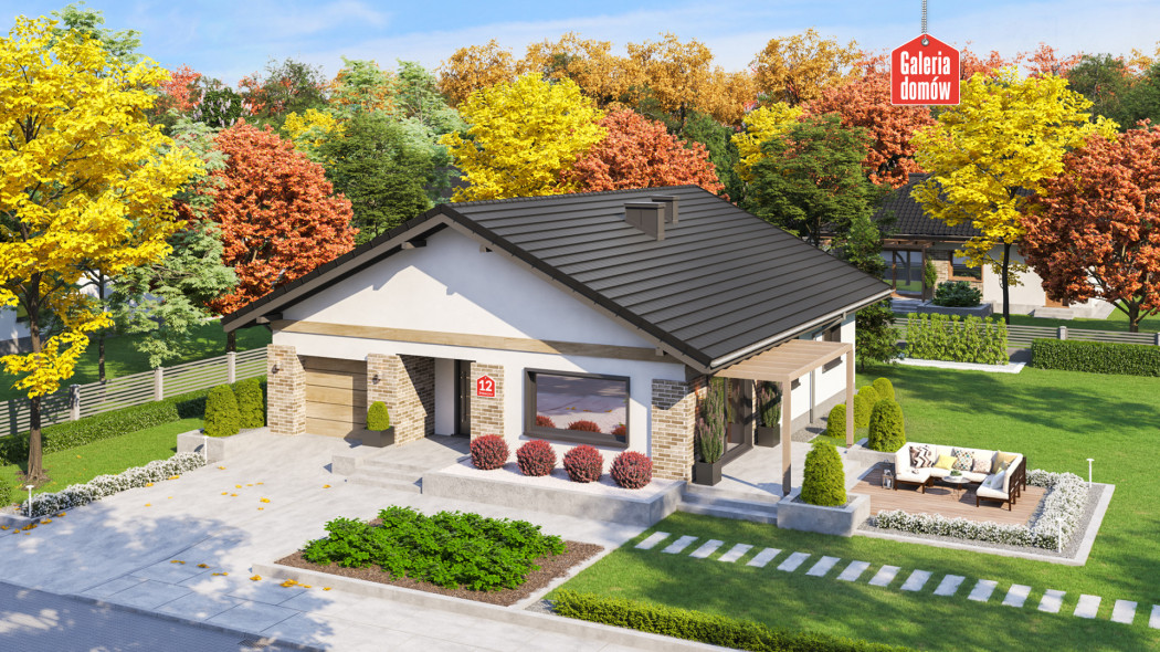 Projekt Dom przy Słonecznej 12 to dom parterowy z dachem dwuspadowym. W bryle budynku umieszczono garaż na jedno miejsce parkingowe. Układ funkcjonalny przewiduje otwartą strefę dzienną, z salonem i kuchnią oraz dodatkową łazienką, a także część nocną w skład której wchodzą 3 sypialnie oraz duża łazienka. Salon ulokowany jest od południa, przez co wnętrze jest słoneczne niemal przez cały dzień. Na taras prowadzą przesuwne drzwi w systemie HS. Dom przy Słonecznej 12 należy do kategorii domów energooszczędnych. Posiada wentylacje mechaniczną z rekuperacją oraz instalacje solarną. W budynku zaprojektowano ogrzewanie gazowe. Propozycja ekonomicznego domu dla 4-5 osobowej rodziny.