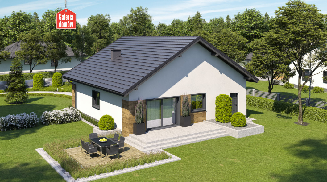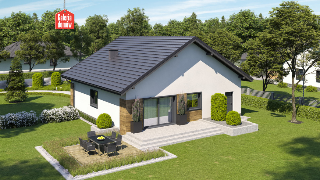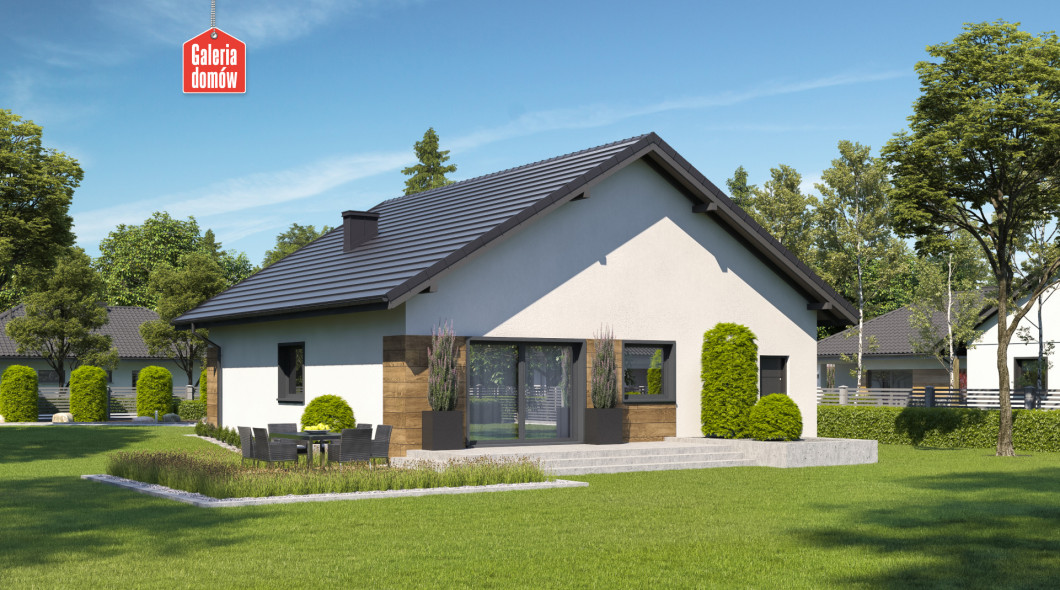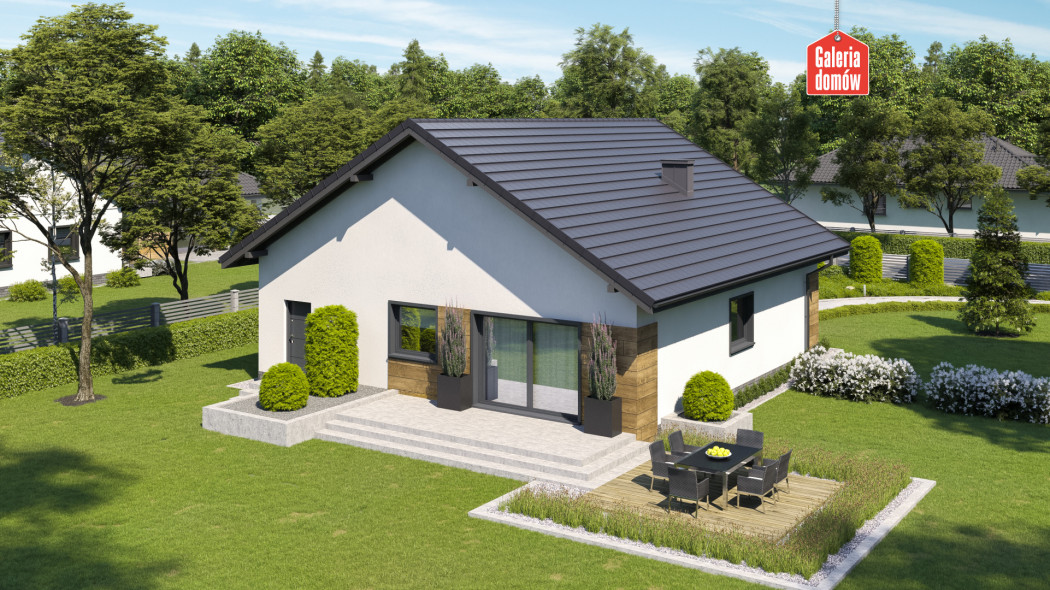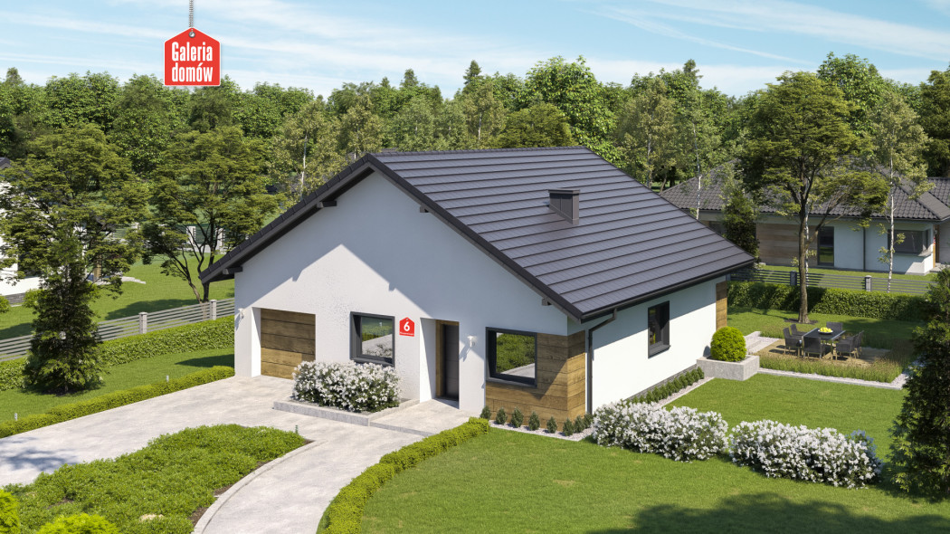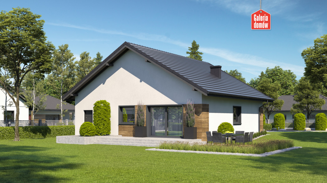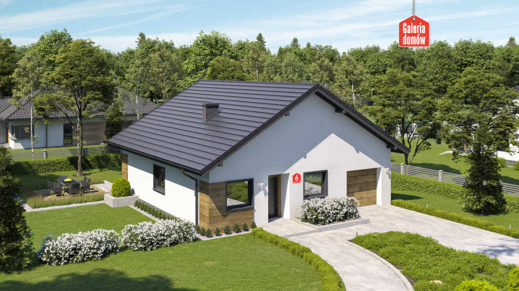 Dom przy Niezapominajek 6 to projekt domu o powierzchni użytkowej 74.76 m². Dom parterowy z dachem dwuspadowym o kalenicy prostopadłej do drogi. Nowoczesna propozycja wykończenia, stylowe dodatki, drewniane elementy dekoracji elewacji.