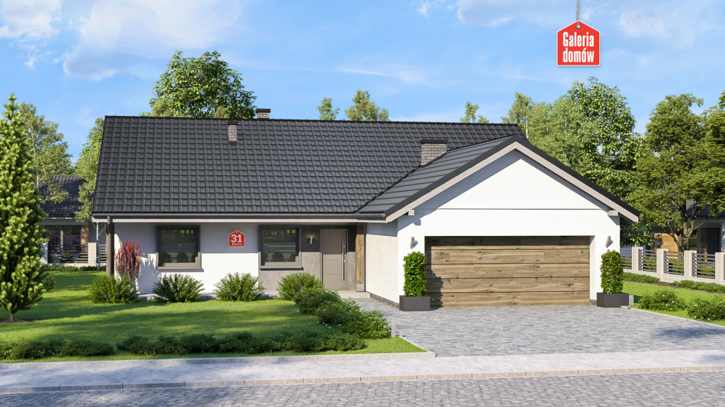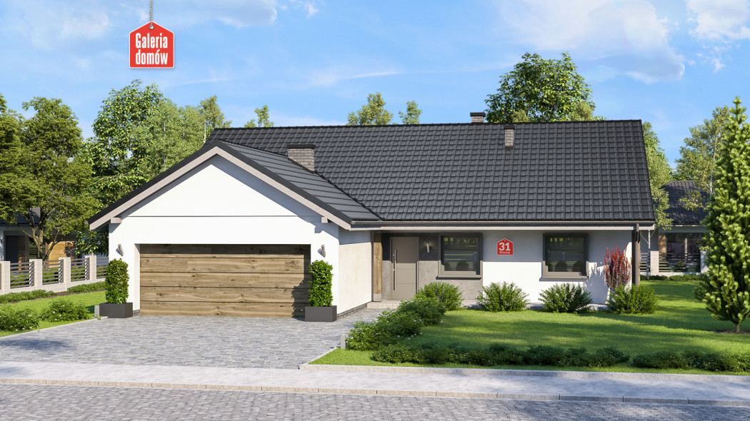 Projekt domu parterowego z dachem dwuspadowym i podwójnym garażem w bryle budynku. Powierzchnia użytkowa Bukowej 31 wynosi 120 m². Budynek wykończony w nowoczesnej stylistyce. Biało-czarna kolorystyka oraz chłodne odcienie stolarki okiennej zostały przełamane ciepłymi kolorami drewna, widocznymi na bramie garażowej i słupach przy zadaszeniu wejścia i tarasu.