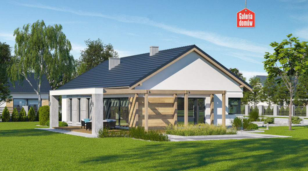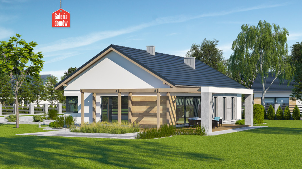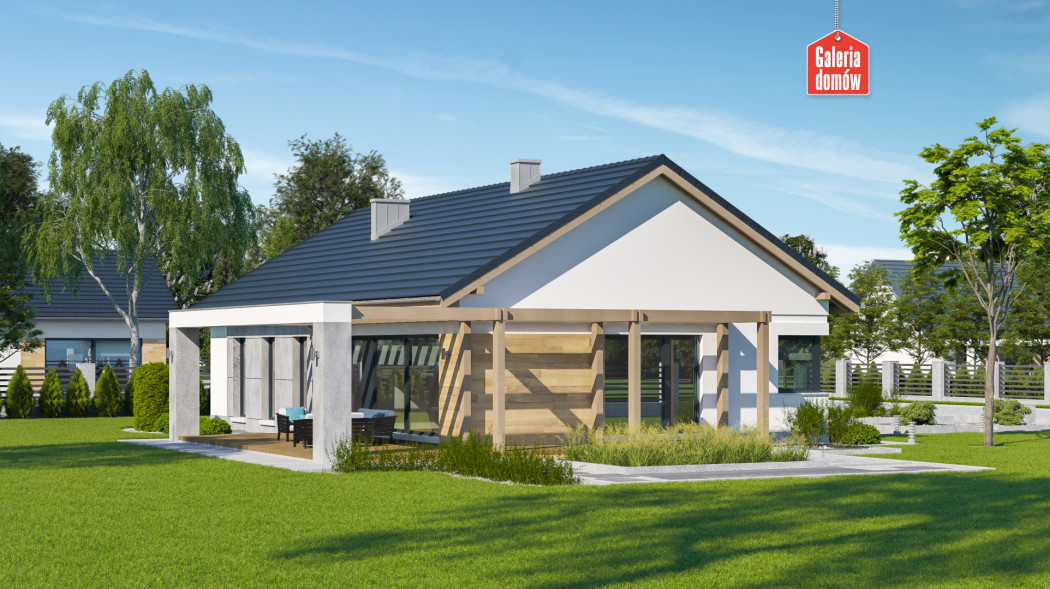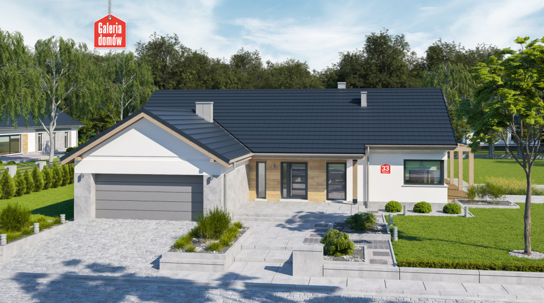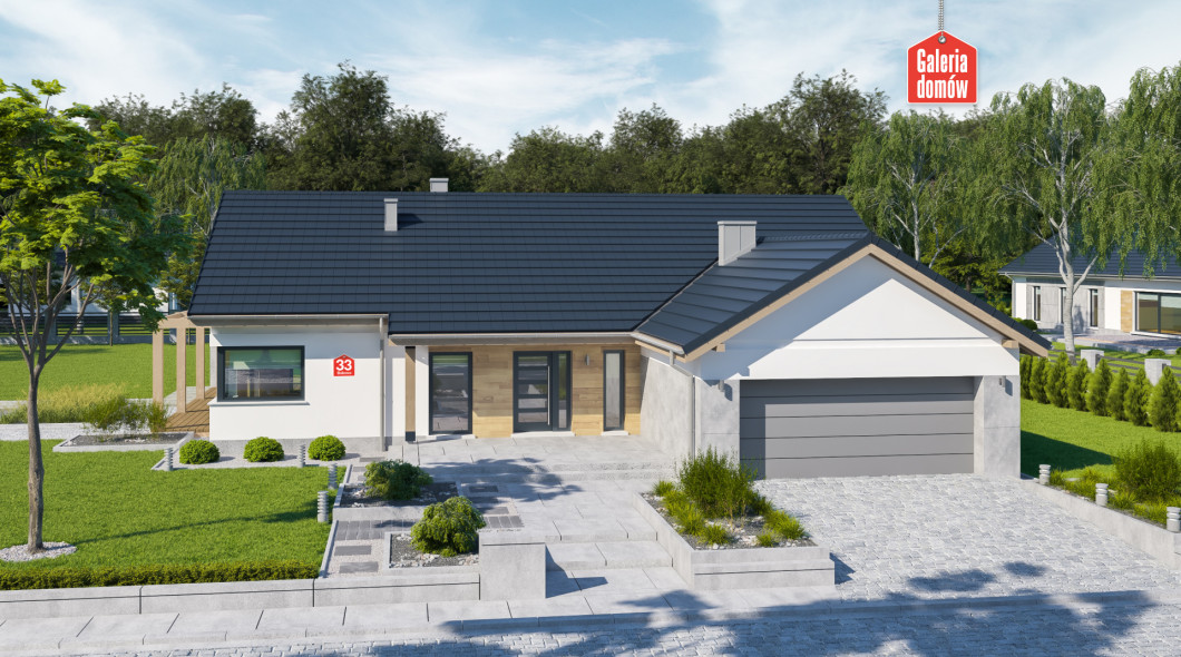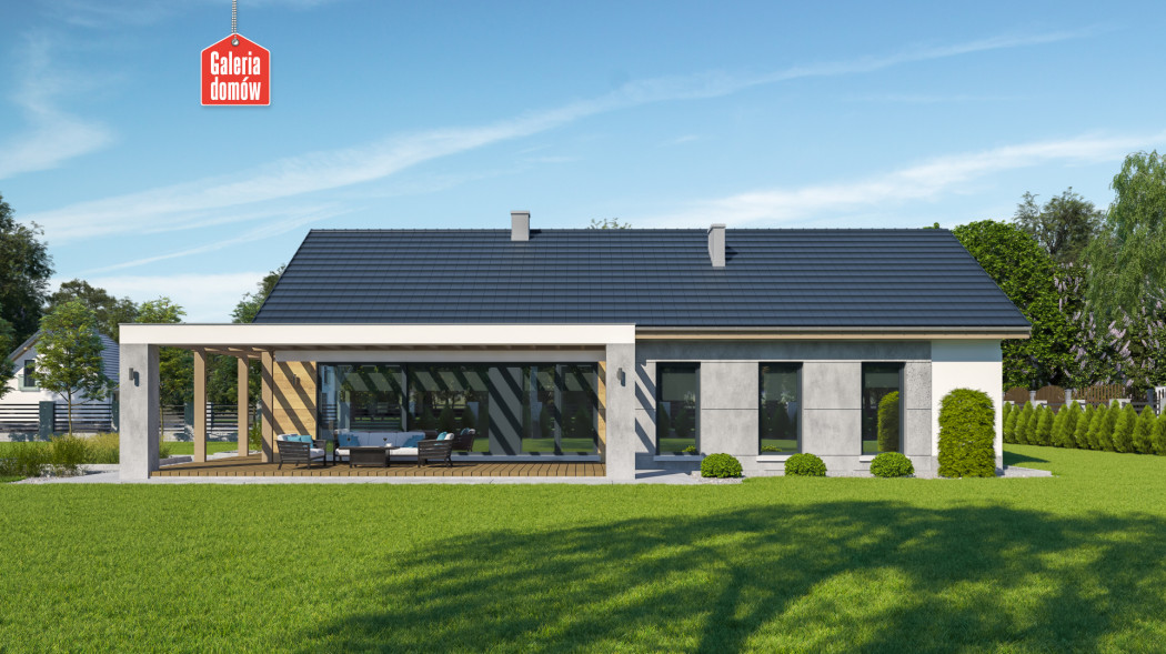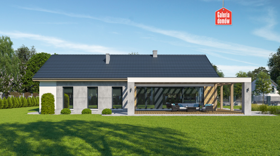 Nowoczesny budynek z dużą liczbą przeszkleń daje poczucie otwartości domu, doskonałe doświetlenie i naturalne ciepło energii słonecznej. Doskonały wybór dla dużej rodziny potrafiącej docenić przestronność parterowego domu.