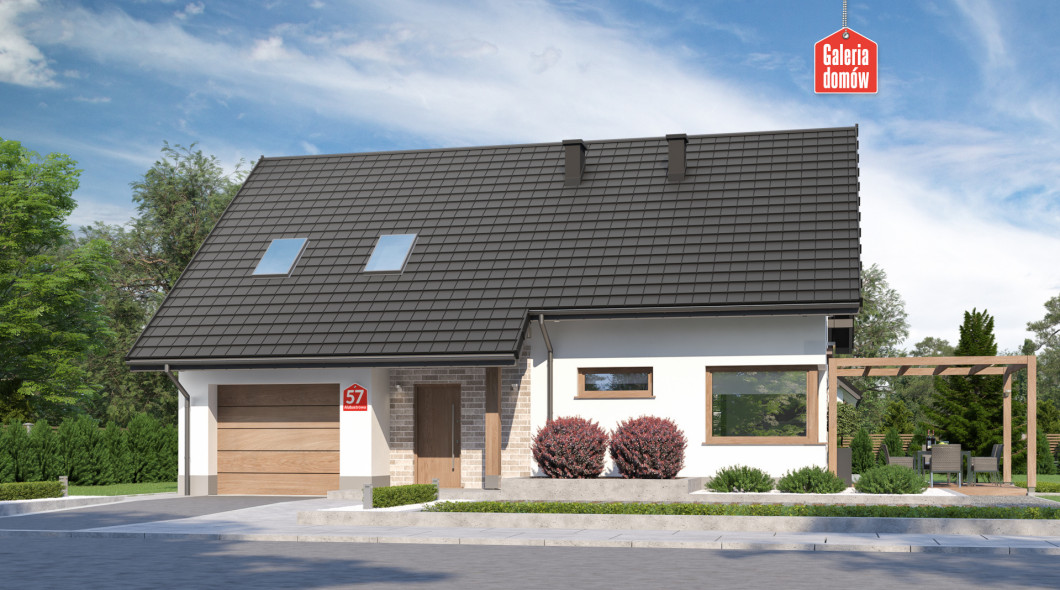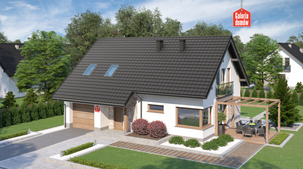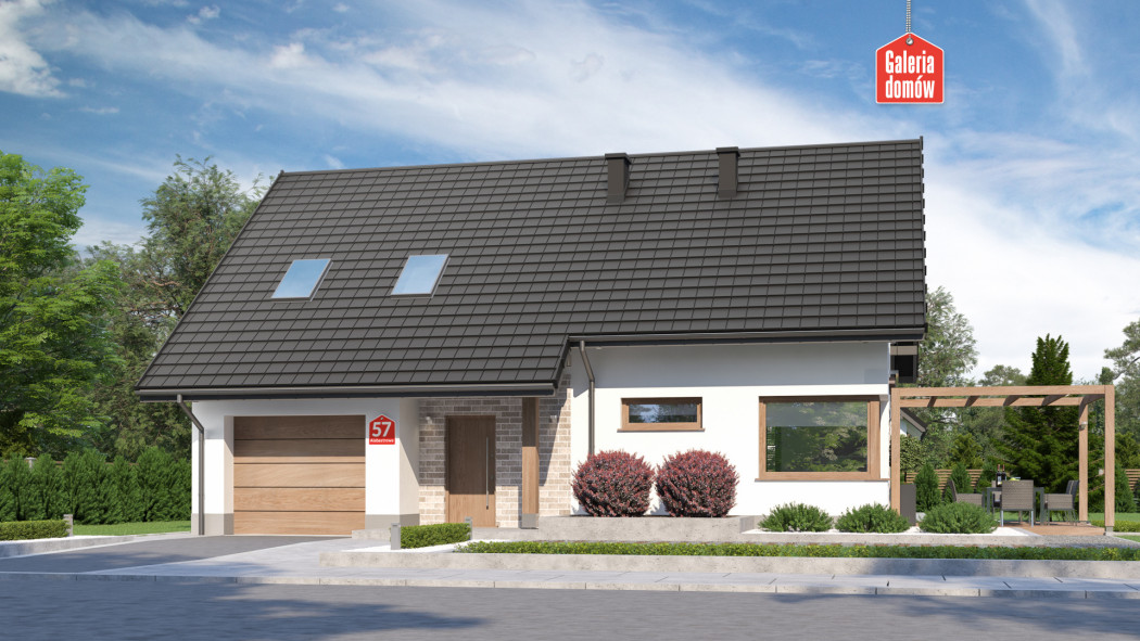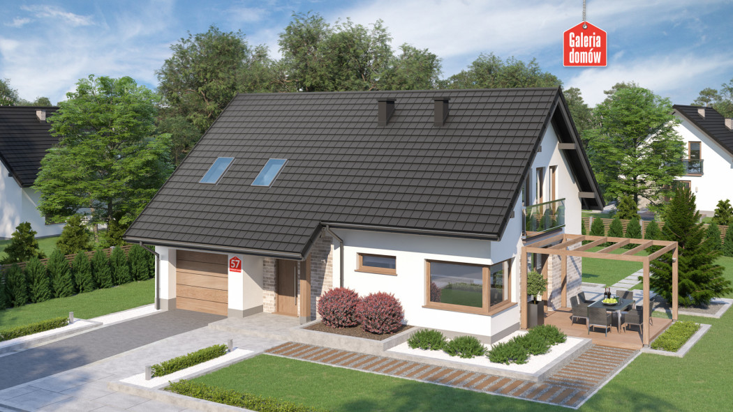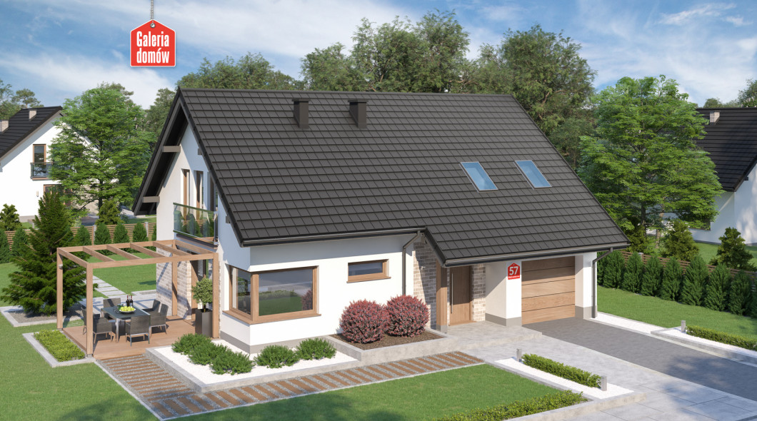 Każdy z pokoi na poddaszu posiada niewielki balkon. Dom przy Alabastrowej 57 ma zadaszone wejście i ciekawie zaprojektowany taras, który otacza drewniana pergola. Wyjścia tarasowe znajdują się z boku i na tyłach domu, co sprawia, iż wnętrze jest otwarte i doskonale doświetlone. Nowoczesny dom o średniej wielkości – doskonały wybór dla 4-5 osobowej rodziny.