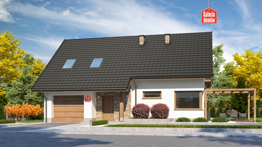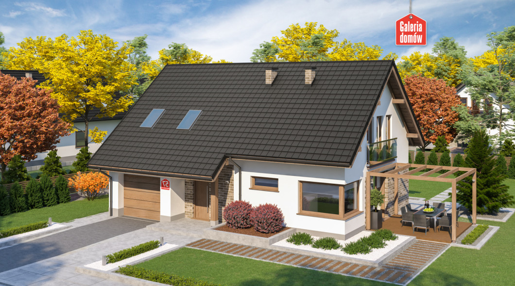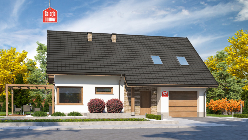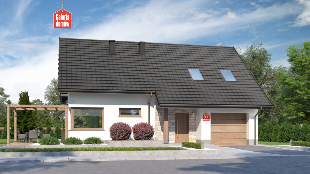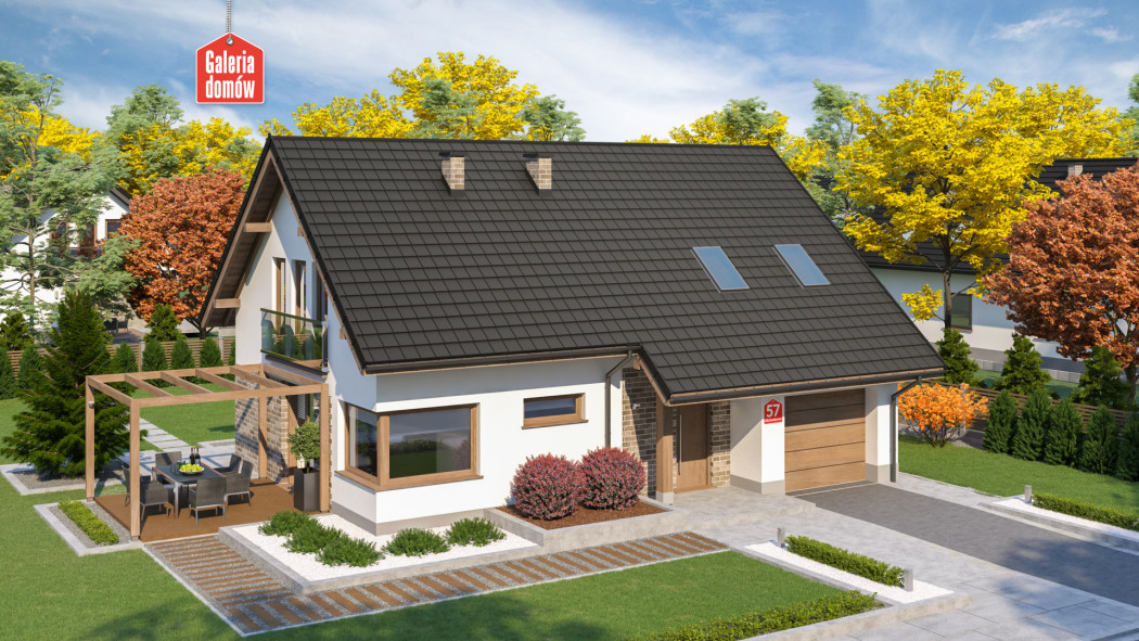 Każdy z pokoi na poddaszu posiada niewielki balkon. Dom przy Alabastrowej 57 ma zadaszone wejście i ciekawie zaprojektowany taras, który otacza drewniana pergola. Wyjścia tarasowe znajdują się z boku i na tyłach domu, co sprawia, iż wnętrze jest otwarte i doskonale doświetlone. Nowoczesny dom o średniej wielkości – doskonały wybór dla 4-5 osobowej rodziny.
