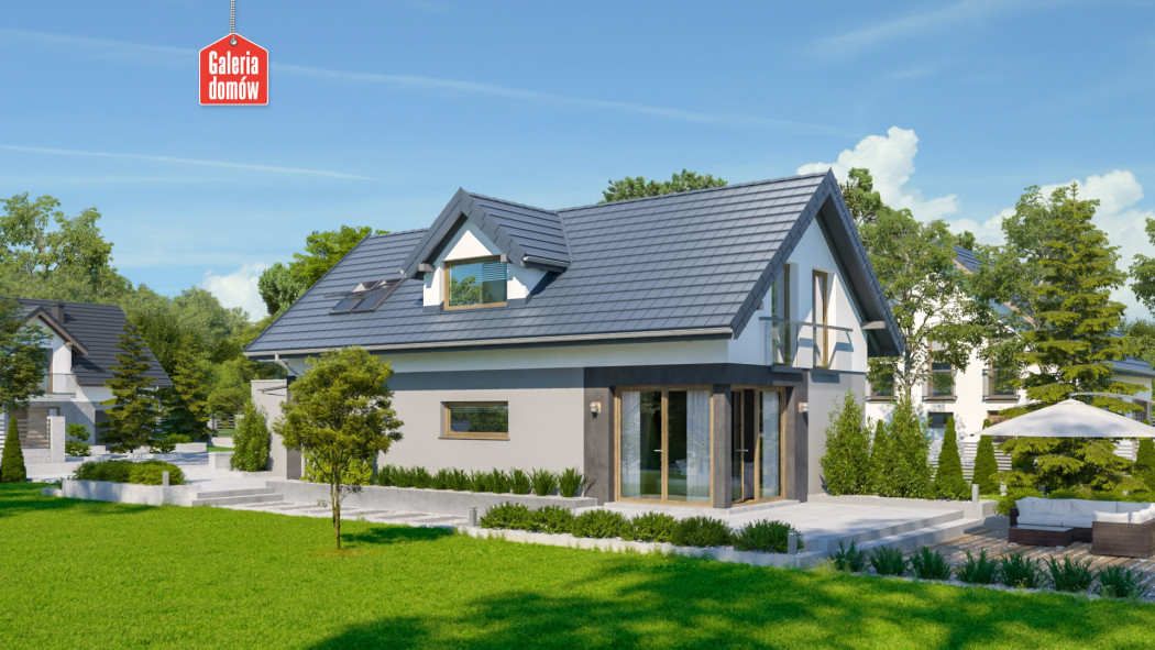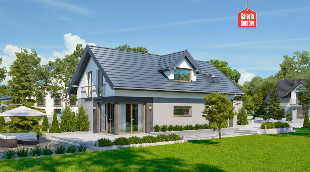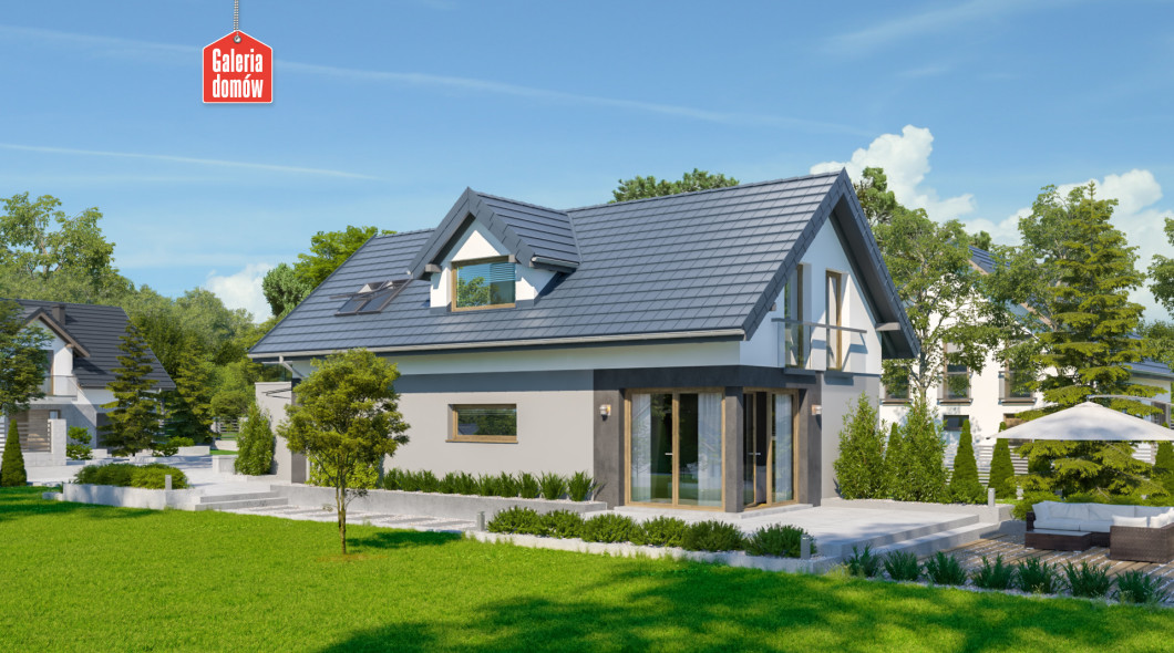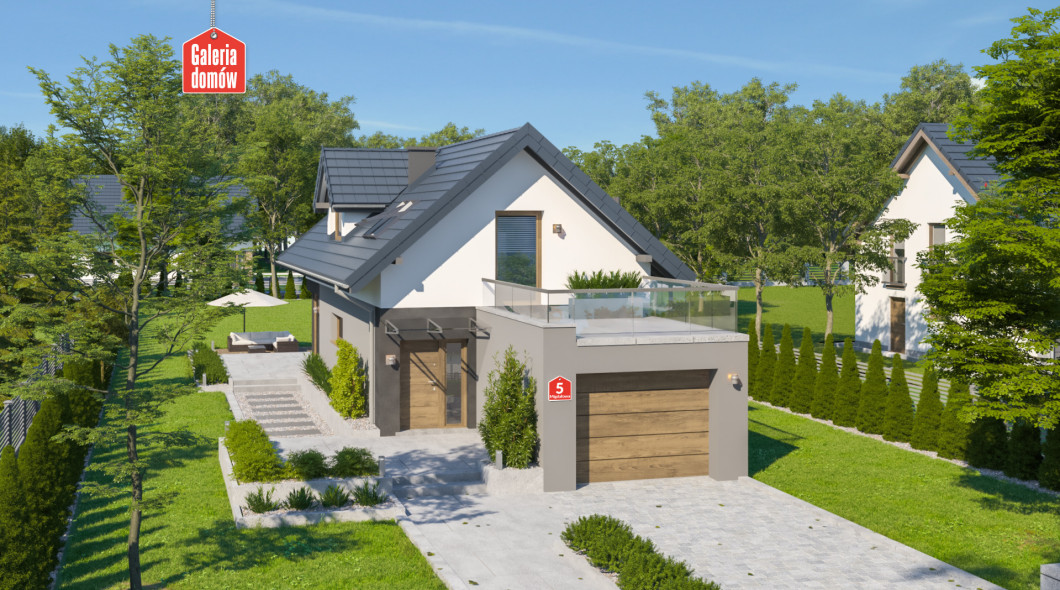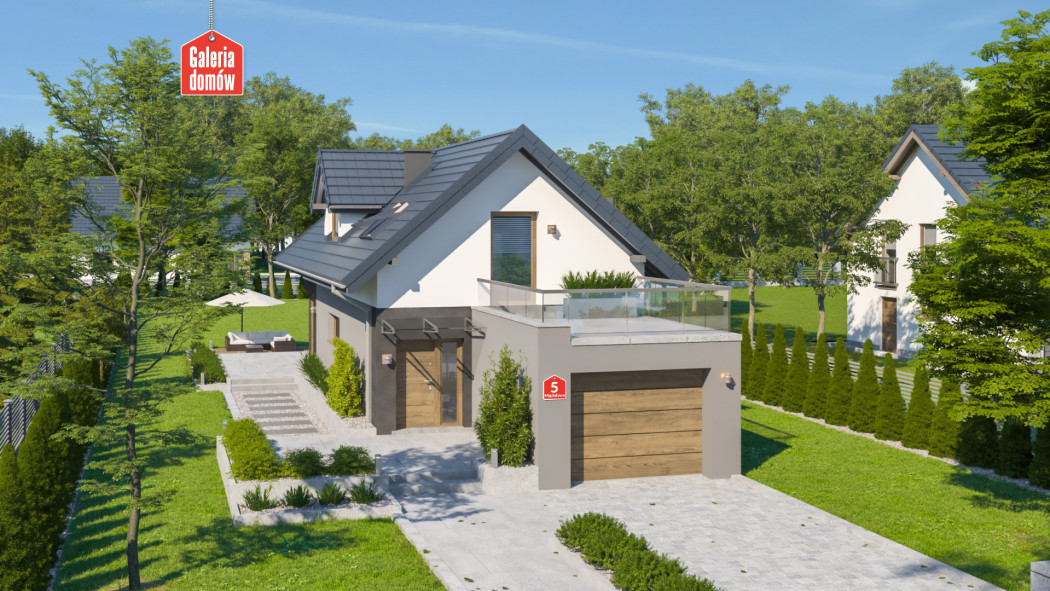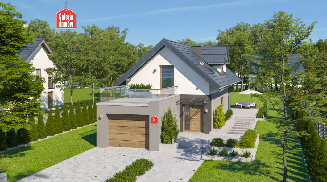 Dom przy Migdałowej 5 to budynek jednorodzinny o powierzchni użytkowej 102.34 m². Dom z poddaszem użytkowym i dachem dwuspadowym posiada garaż jednostanowiskowy w bryle budynku. Migdałowa 5 znajdzie zastosowanie na wąskich działkach o szerokości minimalnej 13.5 m. Układ funkcjonalny zawiera 4 pokoje, kuchnię 2 łazienki, garderobę i kotłownię. Na parterze umieszczono słoneczną strefę dzienną z 30 metrowym salonem i otwarta kuchnią. Poddasze to część nocna. 3 wygodne sypialnie mają dostęp do balkonów. Pokój małżeński ma wyjście na 20 przestronny taras.